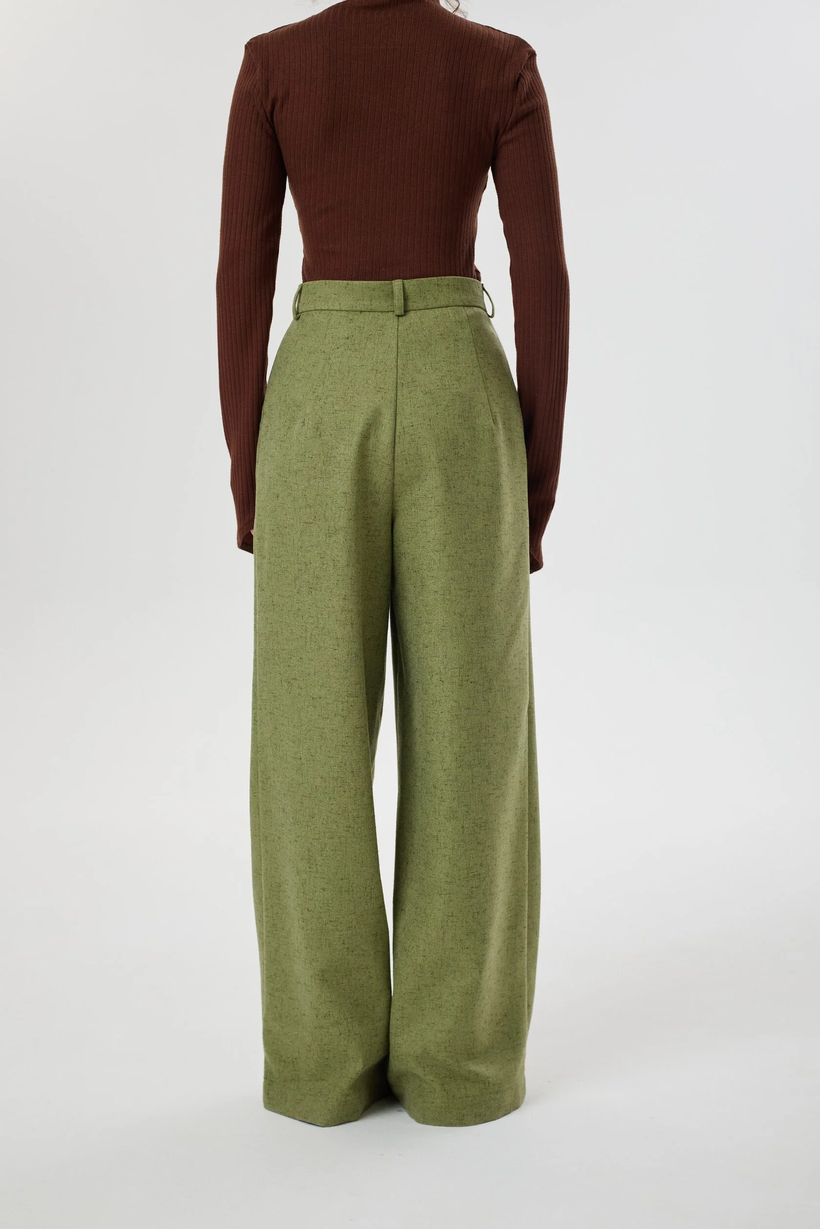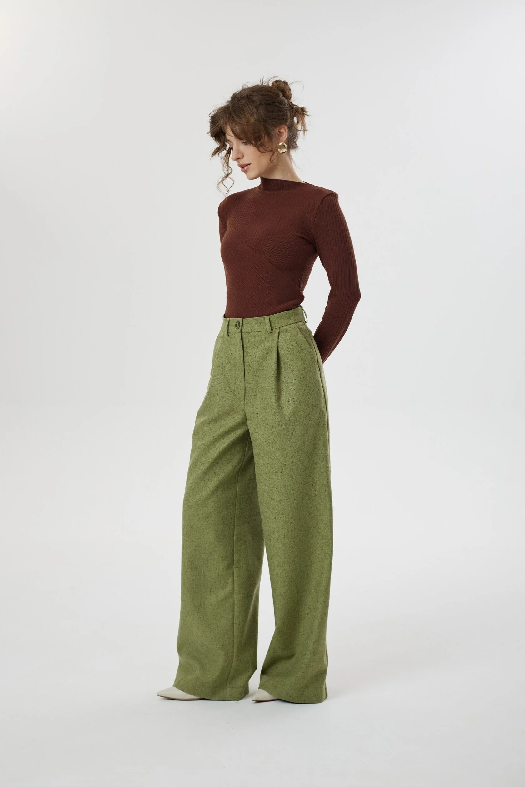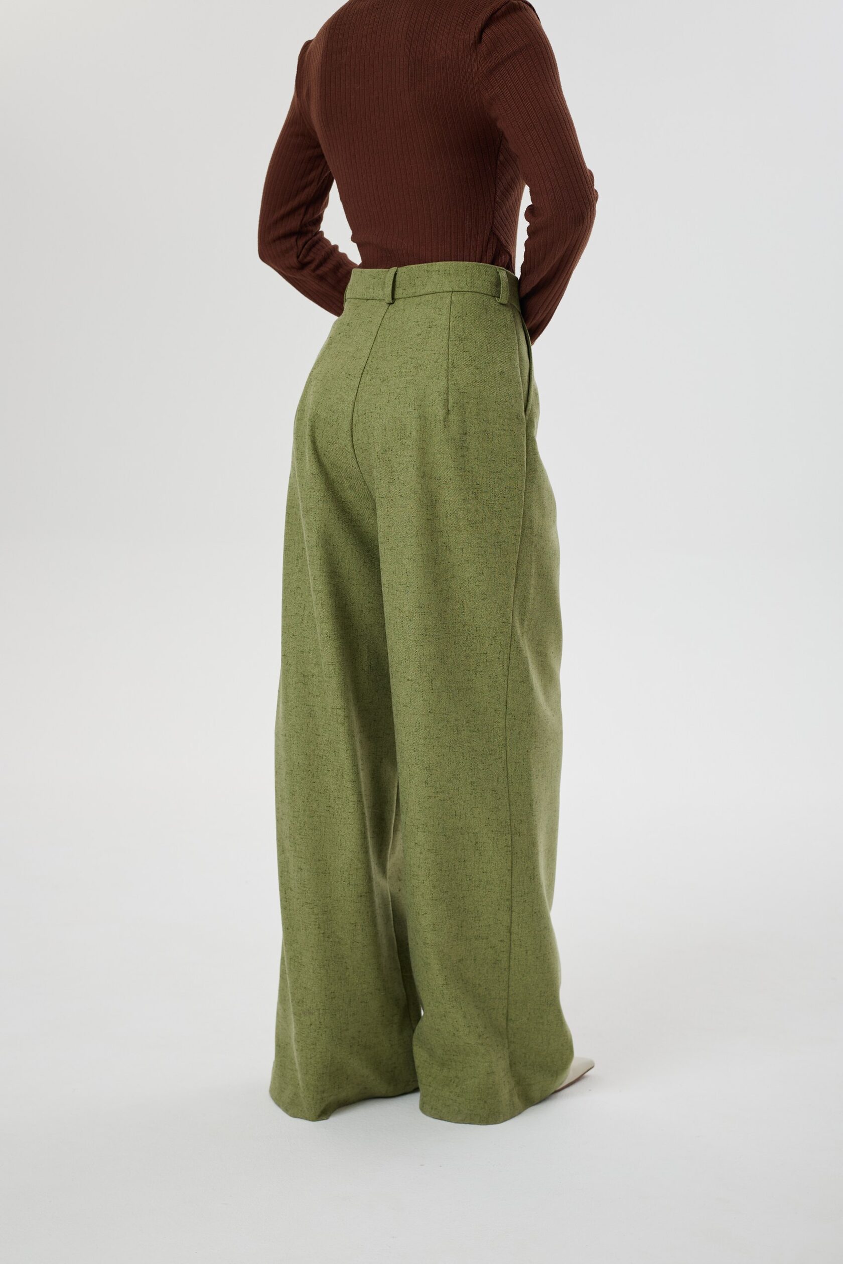 Классические прямые брюки с высокой посадкой в новом оттенке отлично смотрятся как самостоятельная модель, так и в комплекте с нашим жакетом Лесная душа