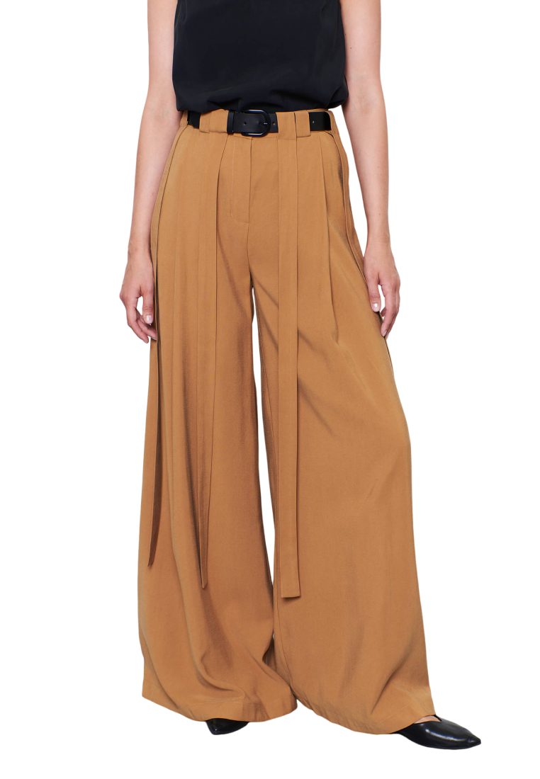 Широкие брюки из матового тенсела (эвкалипт) кремового цвета. Их особенности: широкие шлевки, глубокая складка, расклешённые к низу, по талии на спинке резинка для более комфортной посадки.
