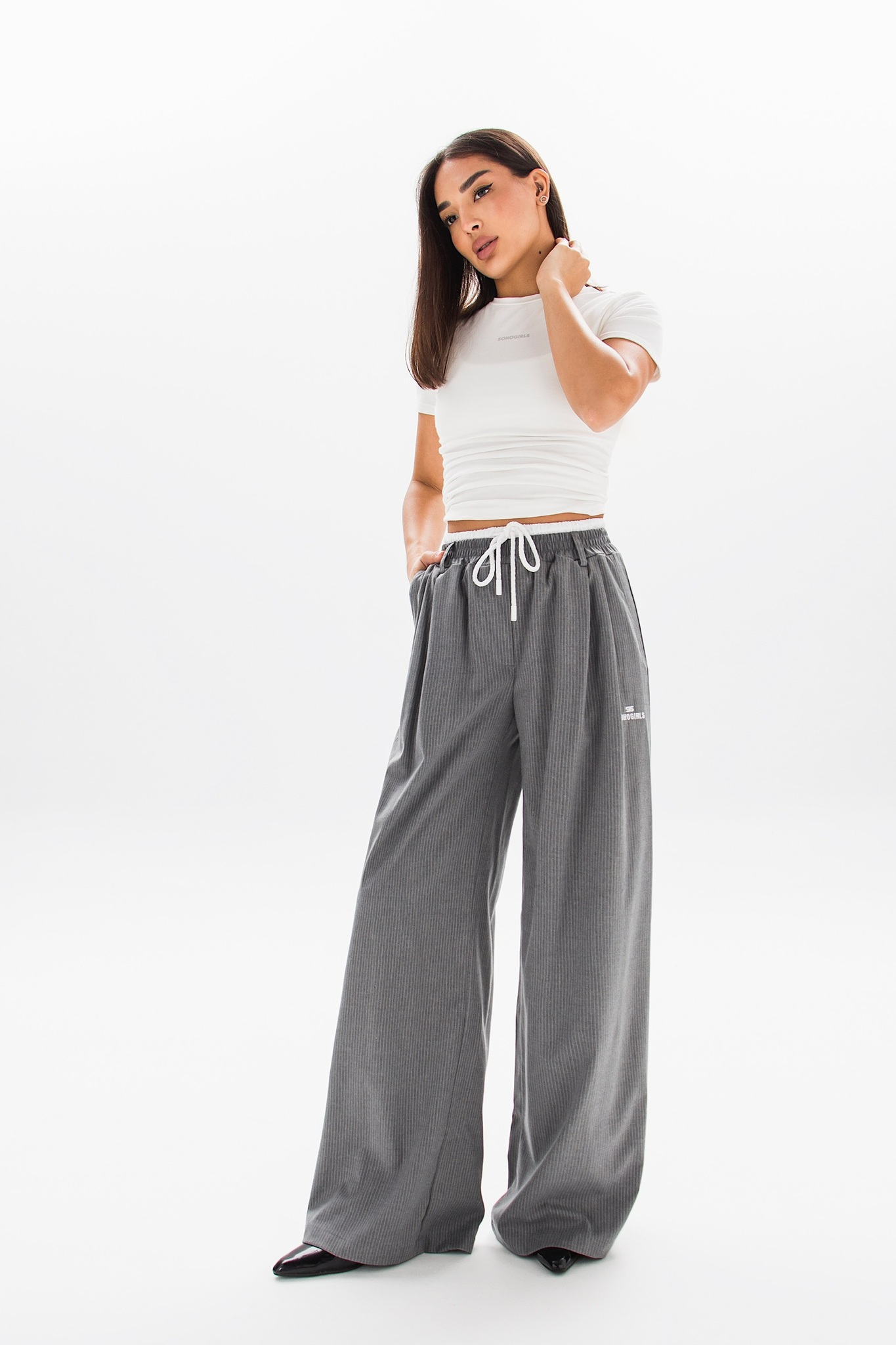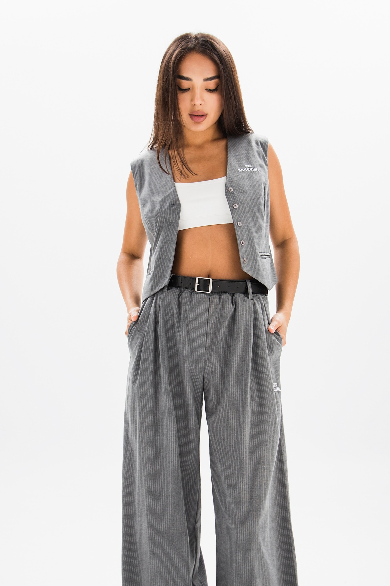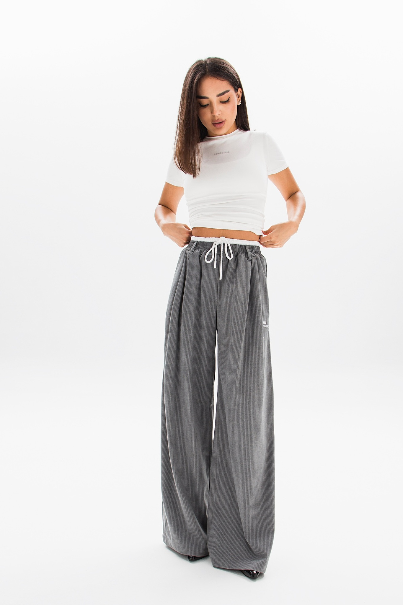 Но главный акцент — съёмный пояс-имитация резинки от белья, который можно легко пристегнуть или убрать. С ним брюки приобретают расслабленное настроение, без него — выглядят как классика. Материал — костюмная ткань в полоску.
