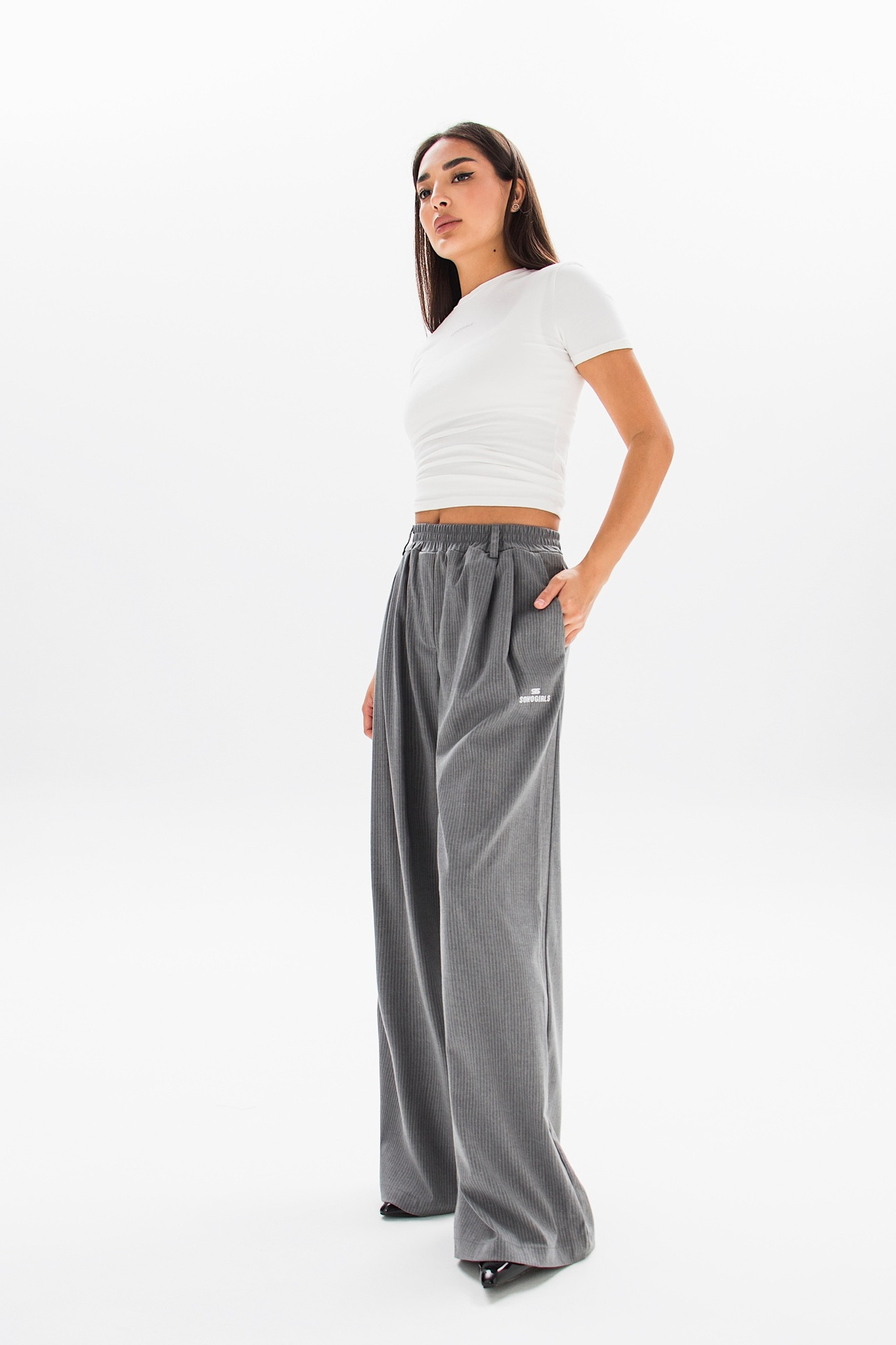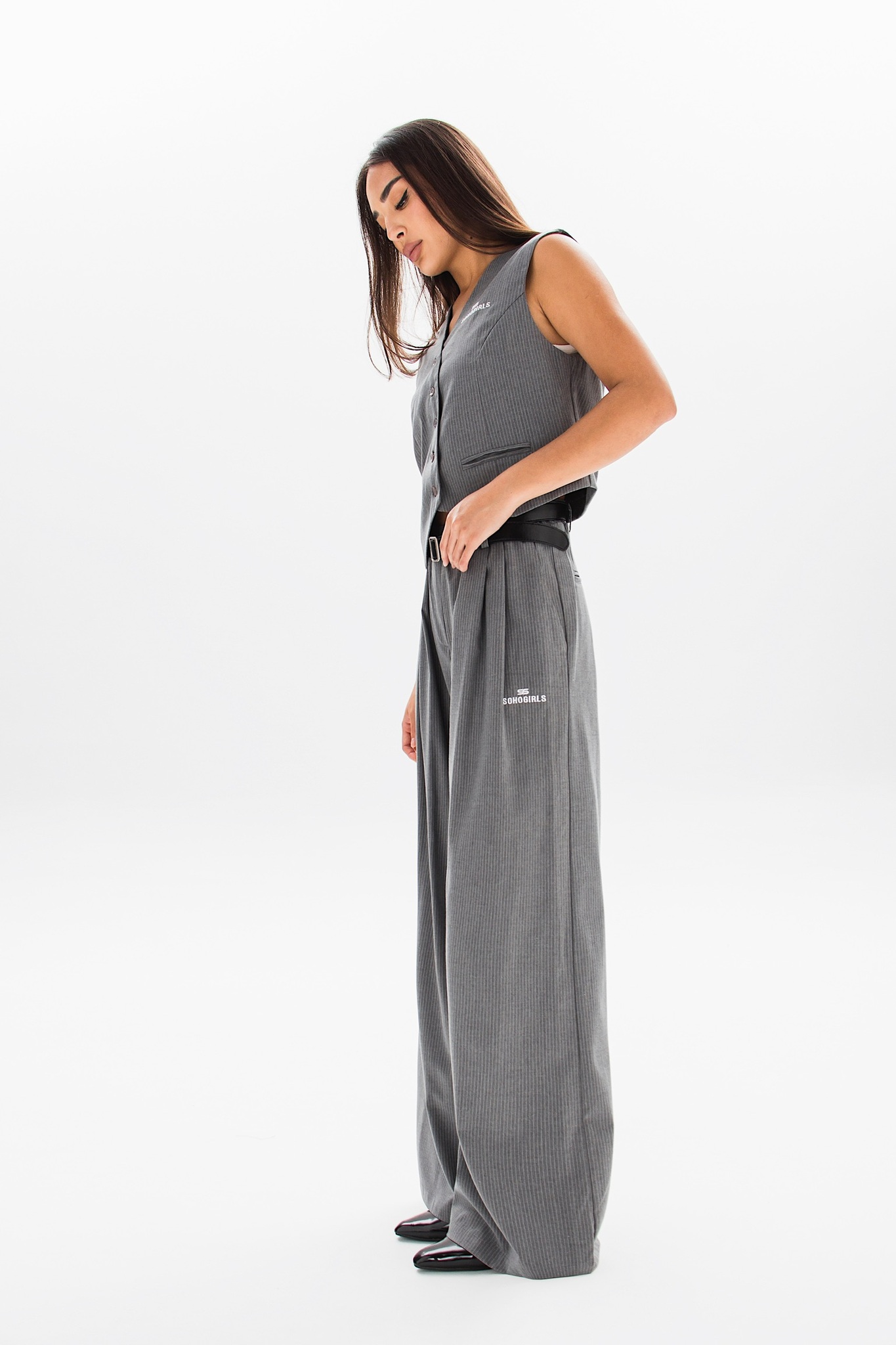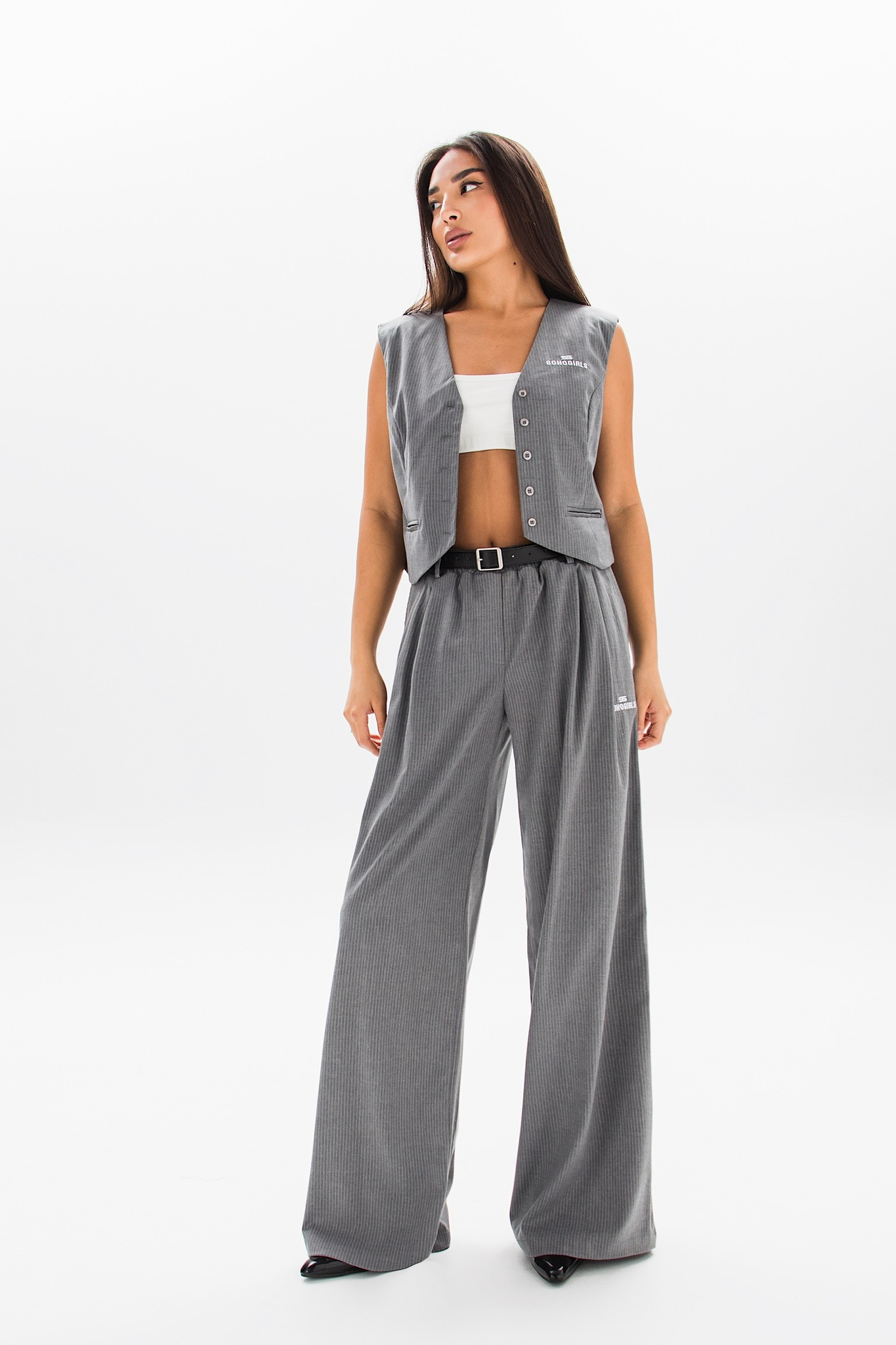 Но главный акцент — съёмный пояс-имитация резинки от белья, который можно легко пристегнуть или убрать. С ним брюки приобретают расслабленное настроение, без него — выглядят как классика. Материал — костюмная ткань в полоску.