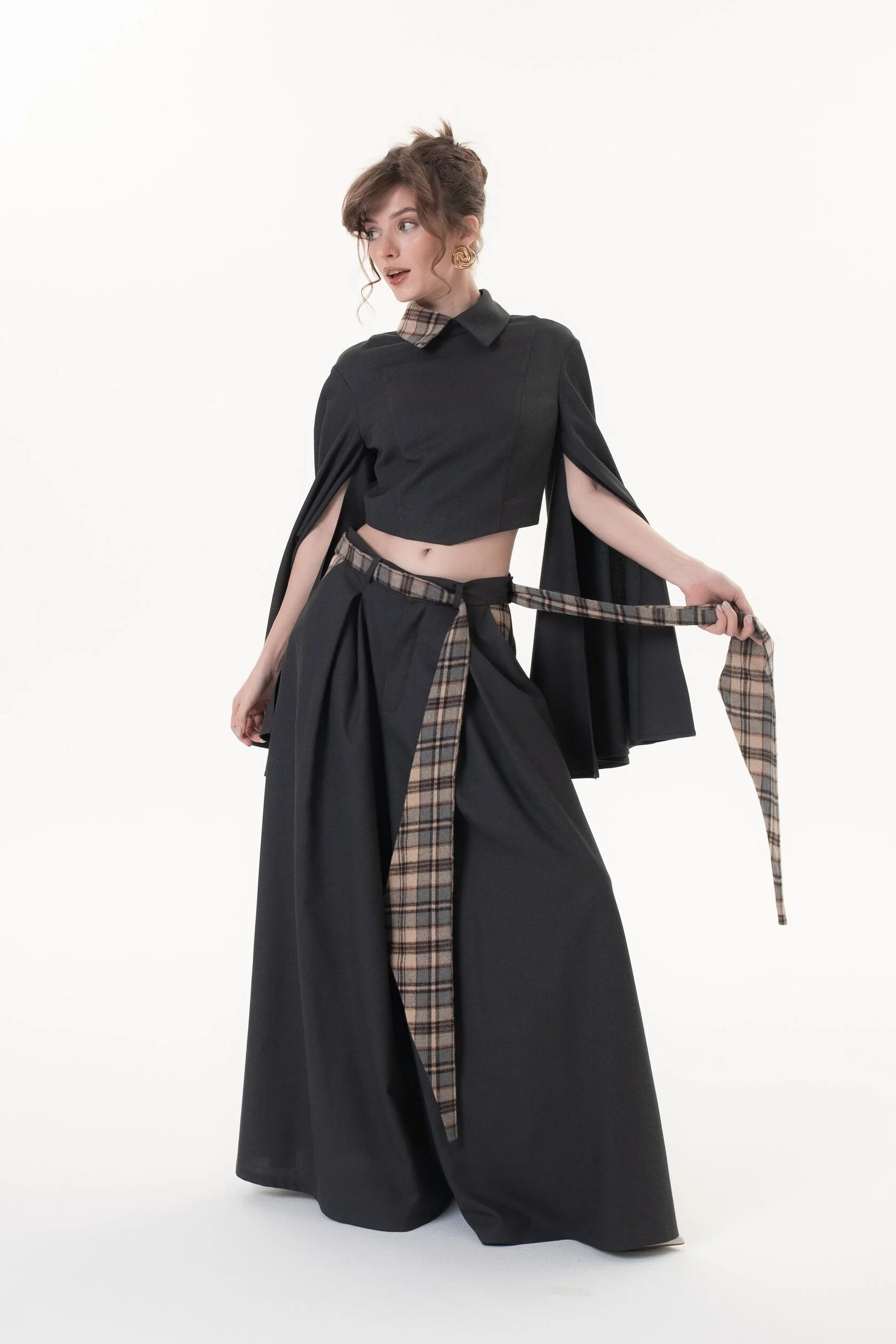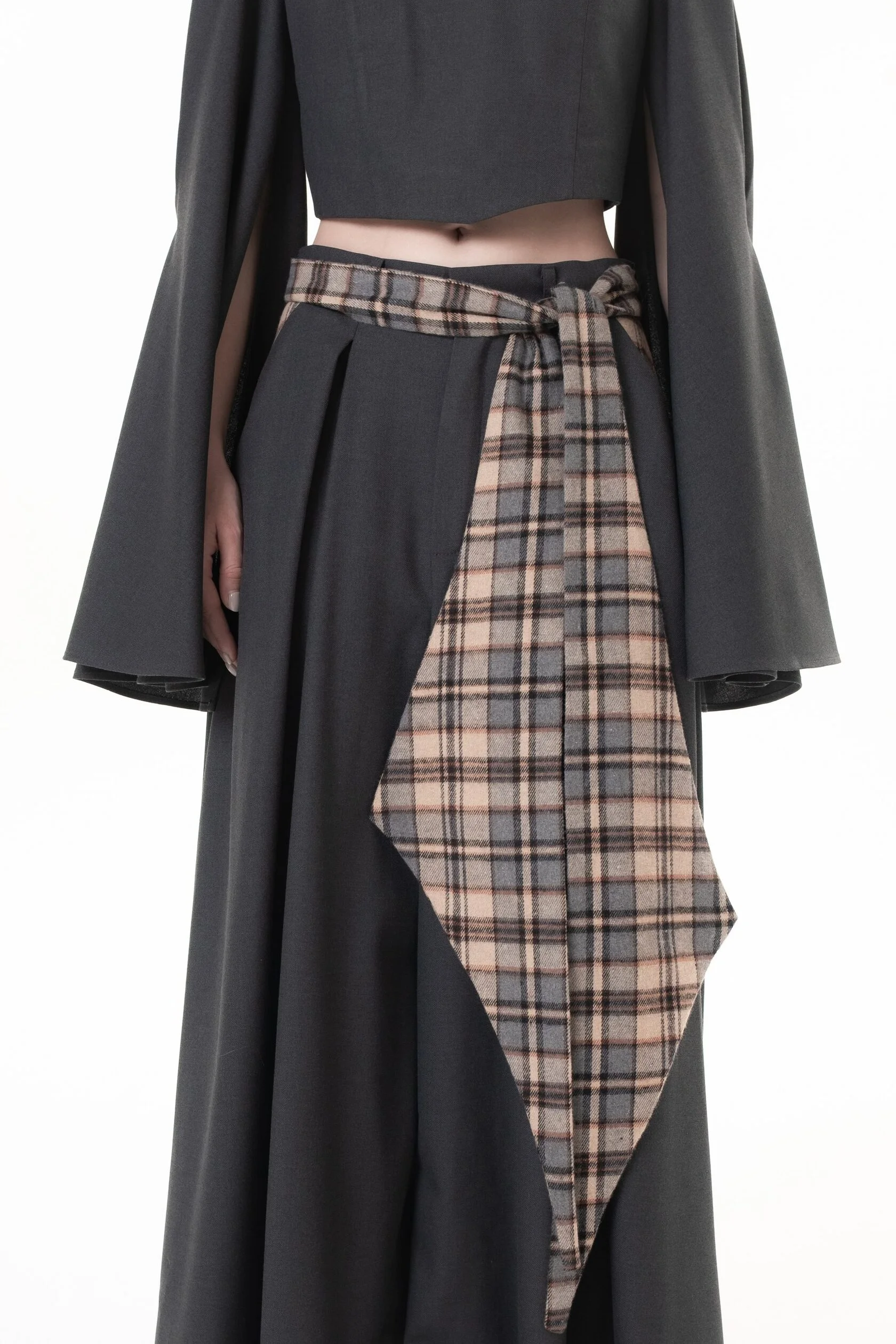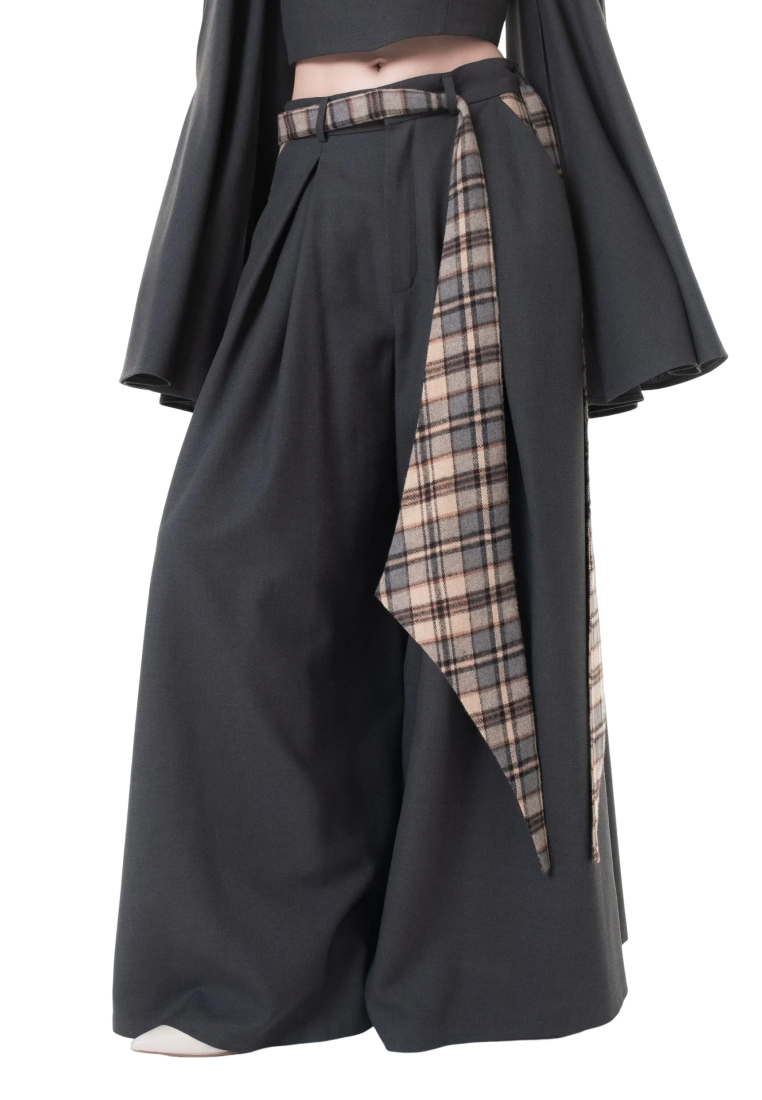 Графитовый цвет брюк разбавляет клетчатый пояс с акцентными широкими концами, который можно завязать множеством способов, тем самым по-разному обыграть образ.