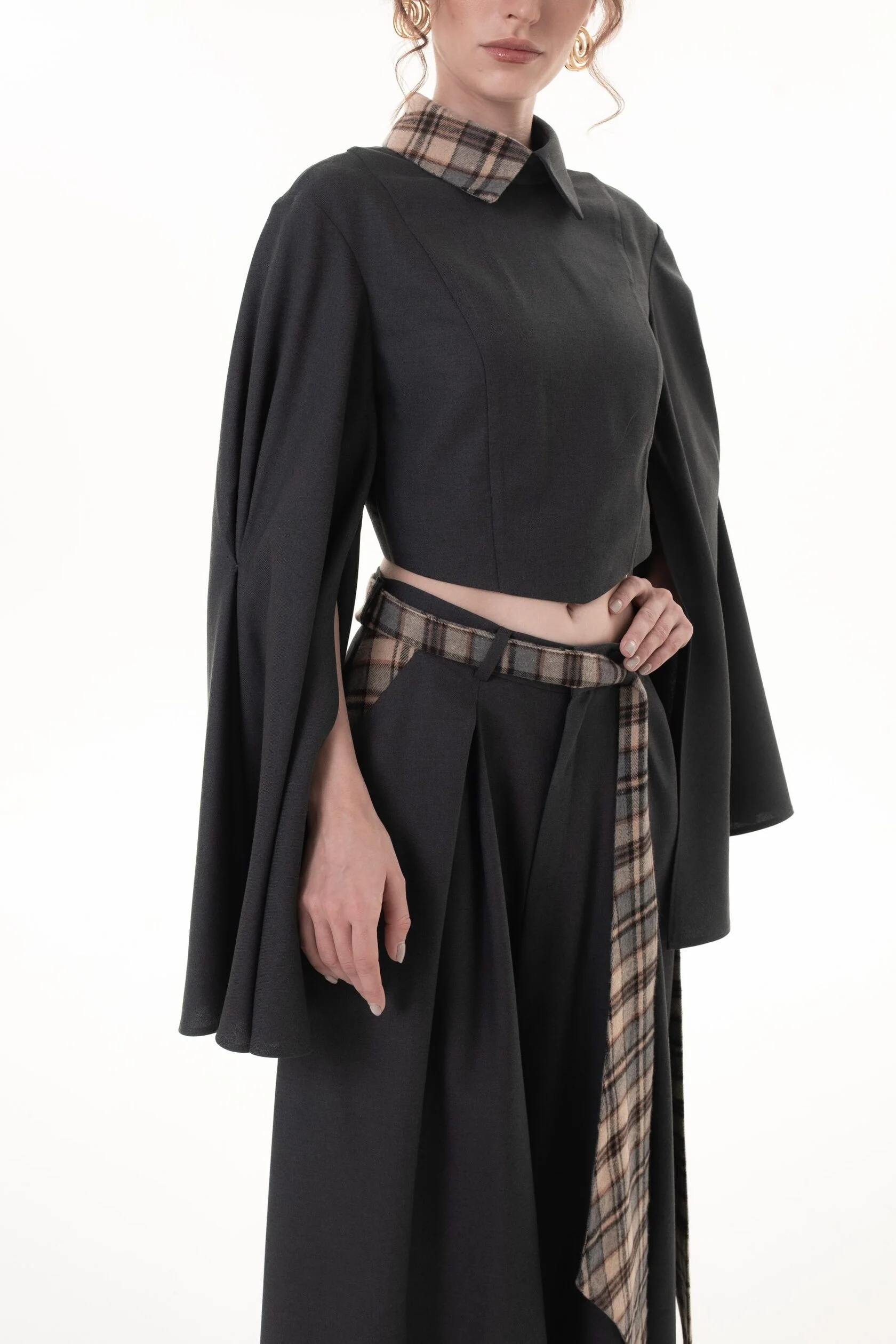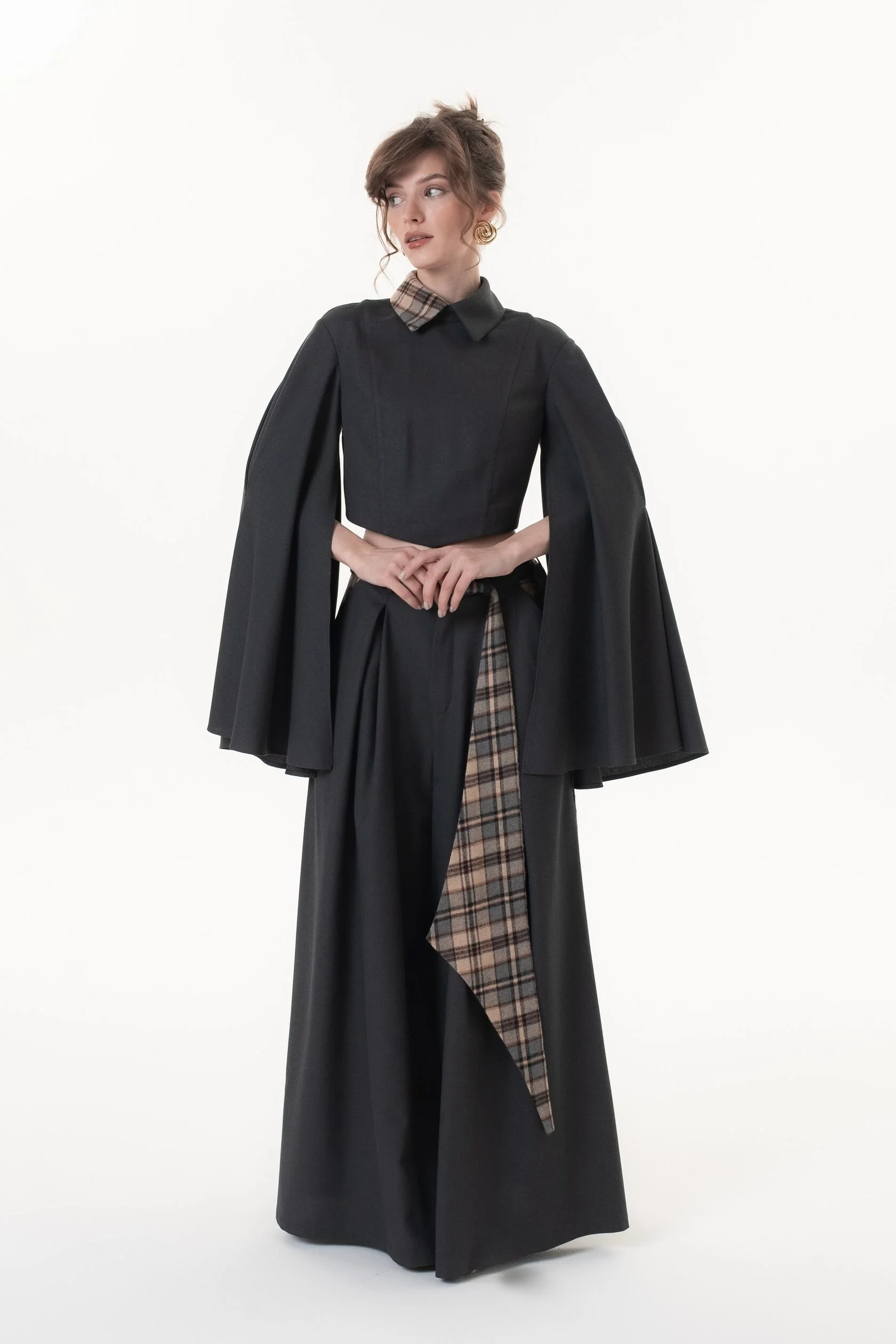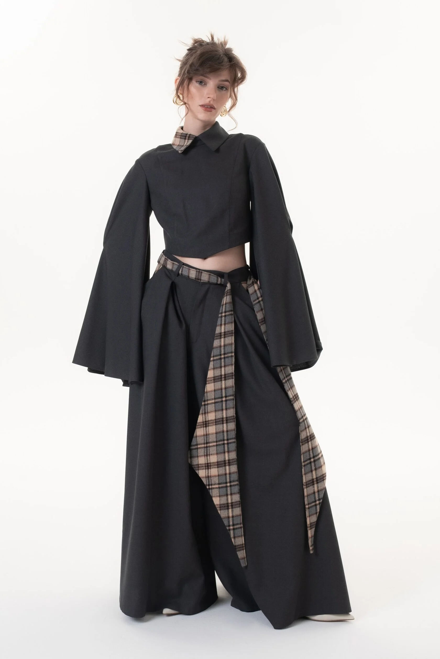 Графитовый цвет брюк разбавляет клетчатый пояс с акцентными широкими концами, который можно завязать множеством способов, тем самым по-разному обыграть образ.