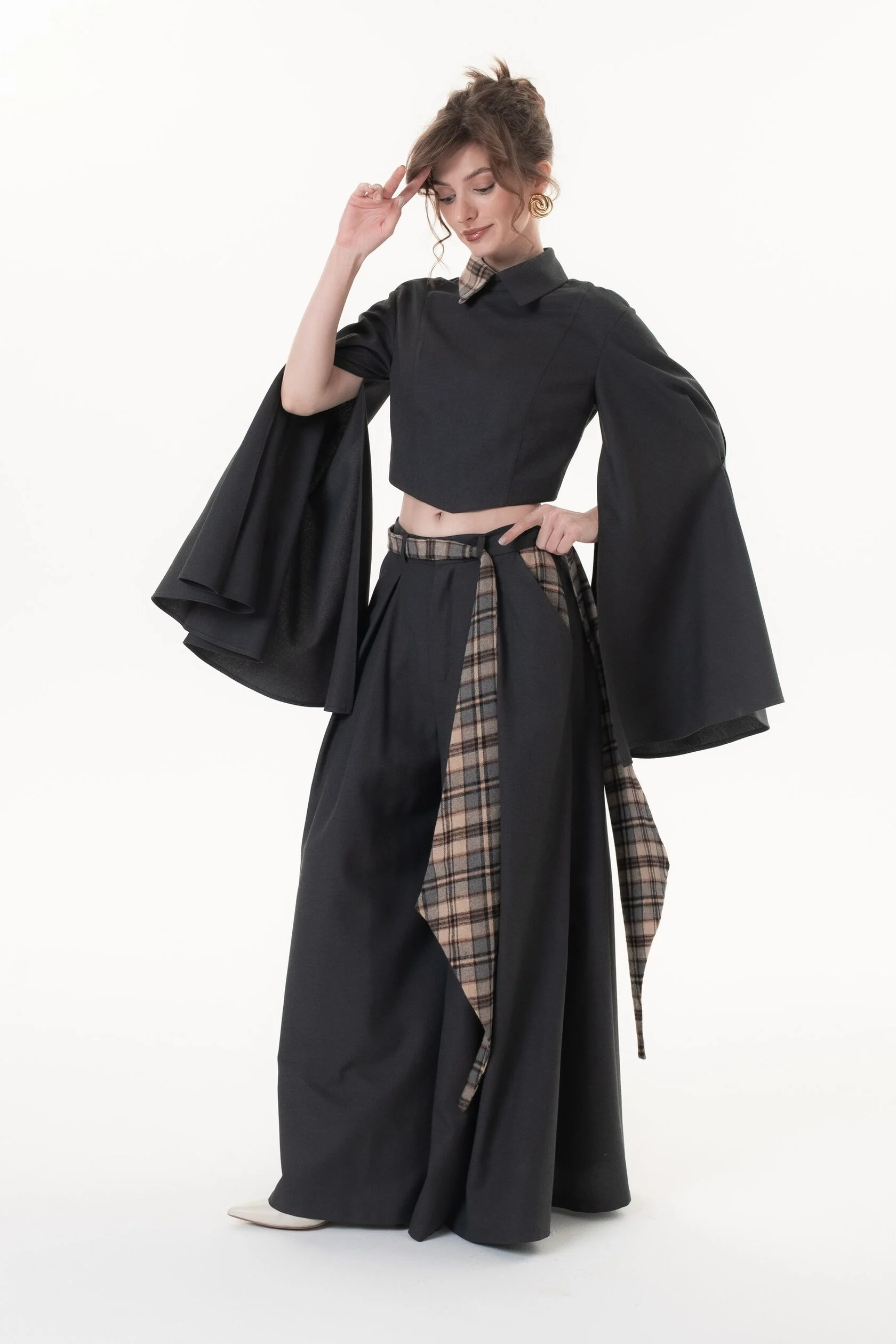 Мы специально сделали посадку брюк чуть ниже талии, чтобы у нашей блузой с разрезами красиво читался фигурный низ.