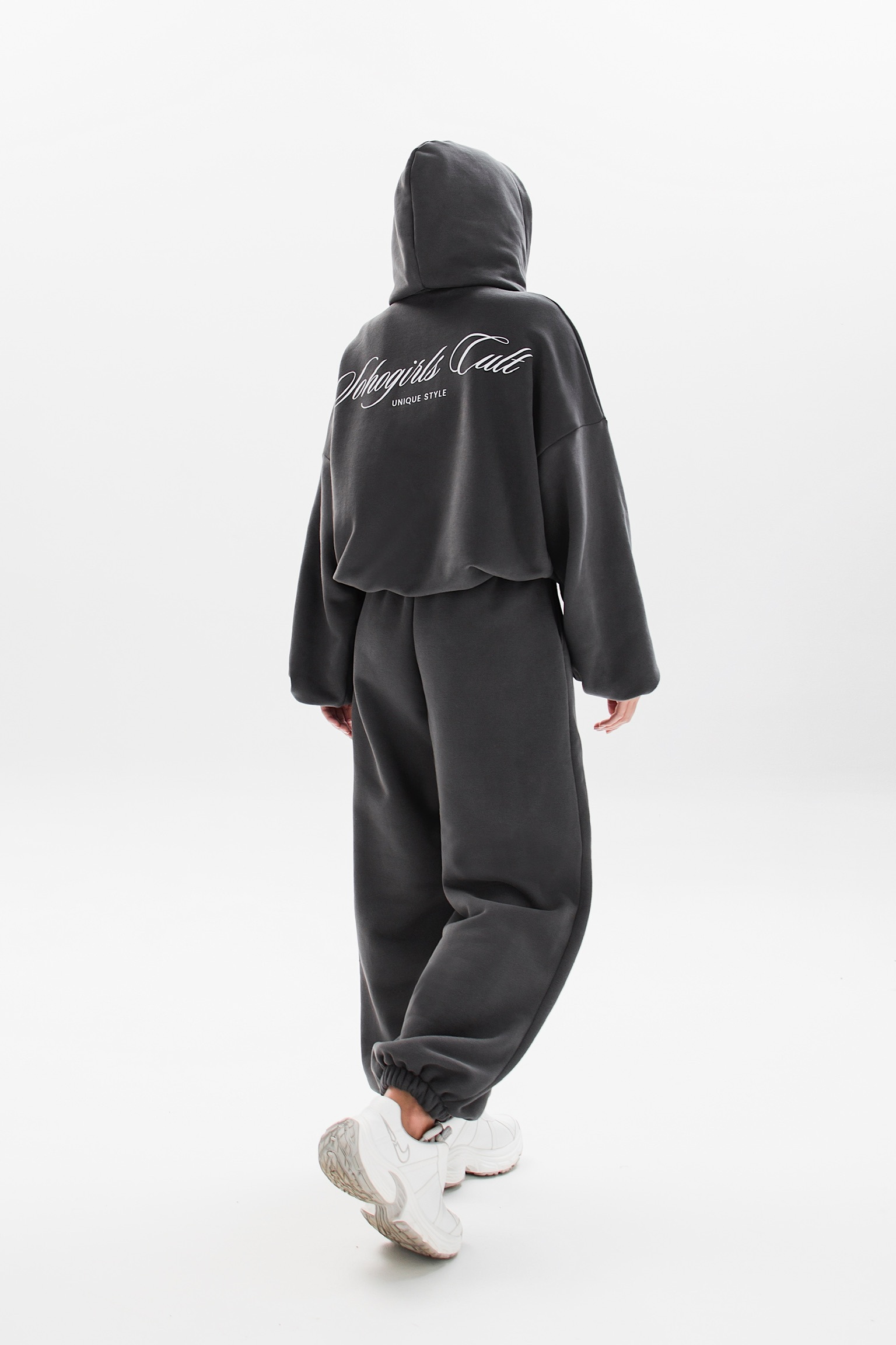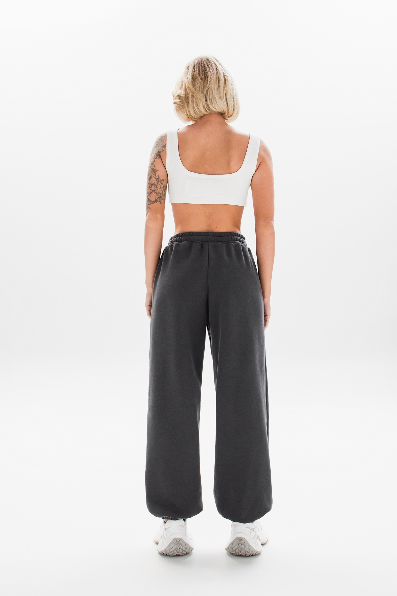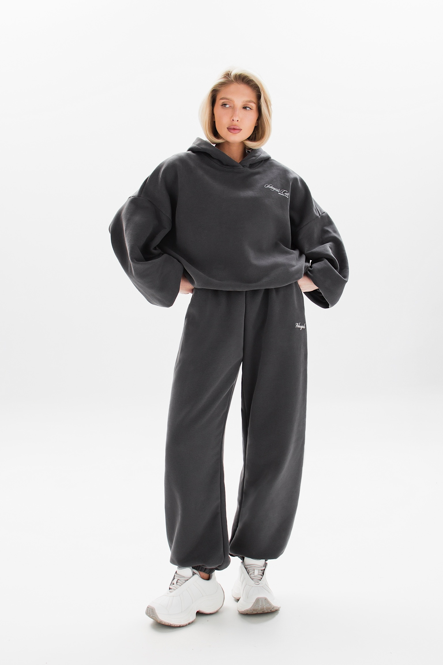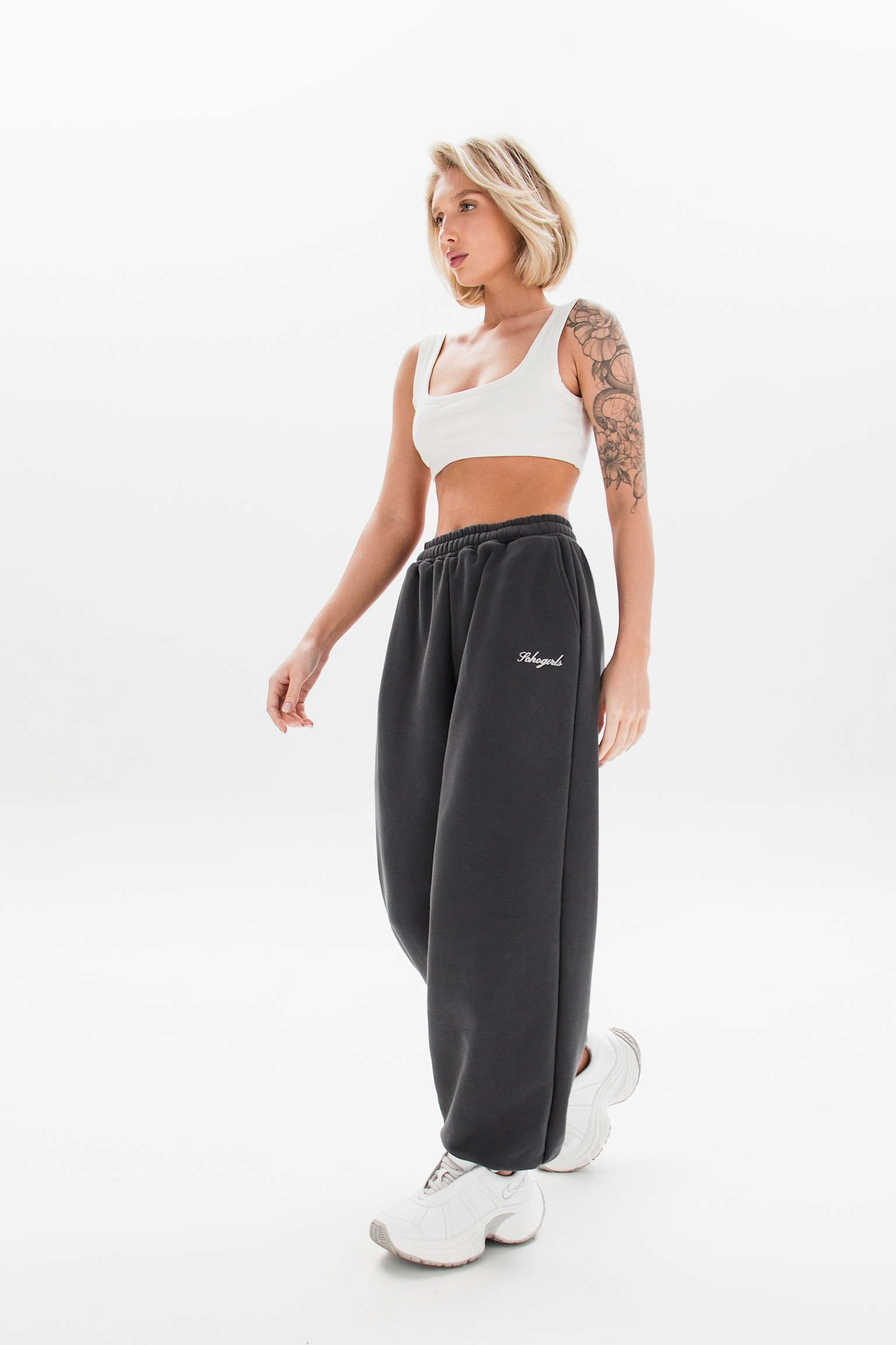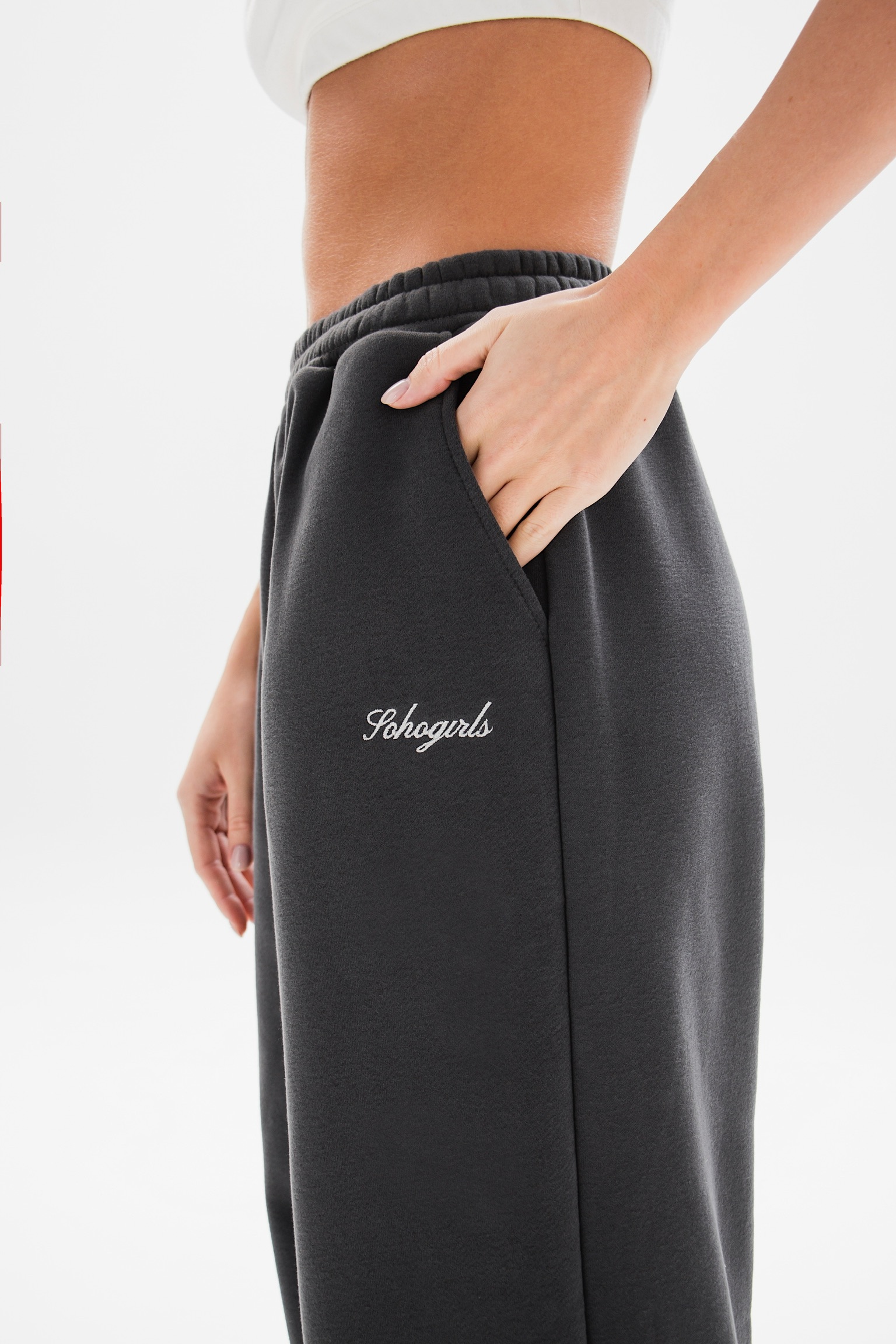 Модель с завышенной талией, свободным кроем и широкой резинкой идеально подчеркивает фигуру. Декоративные вышивки у карманов добавляют акцент.
