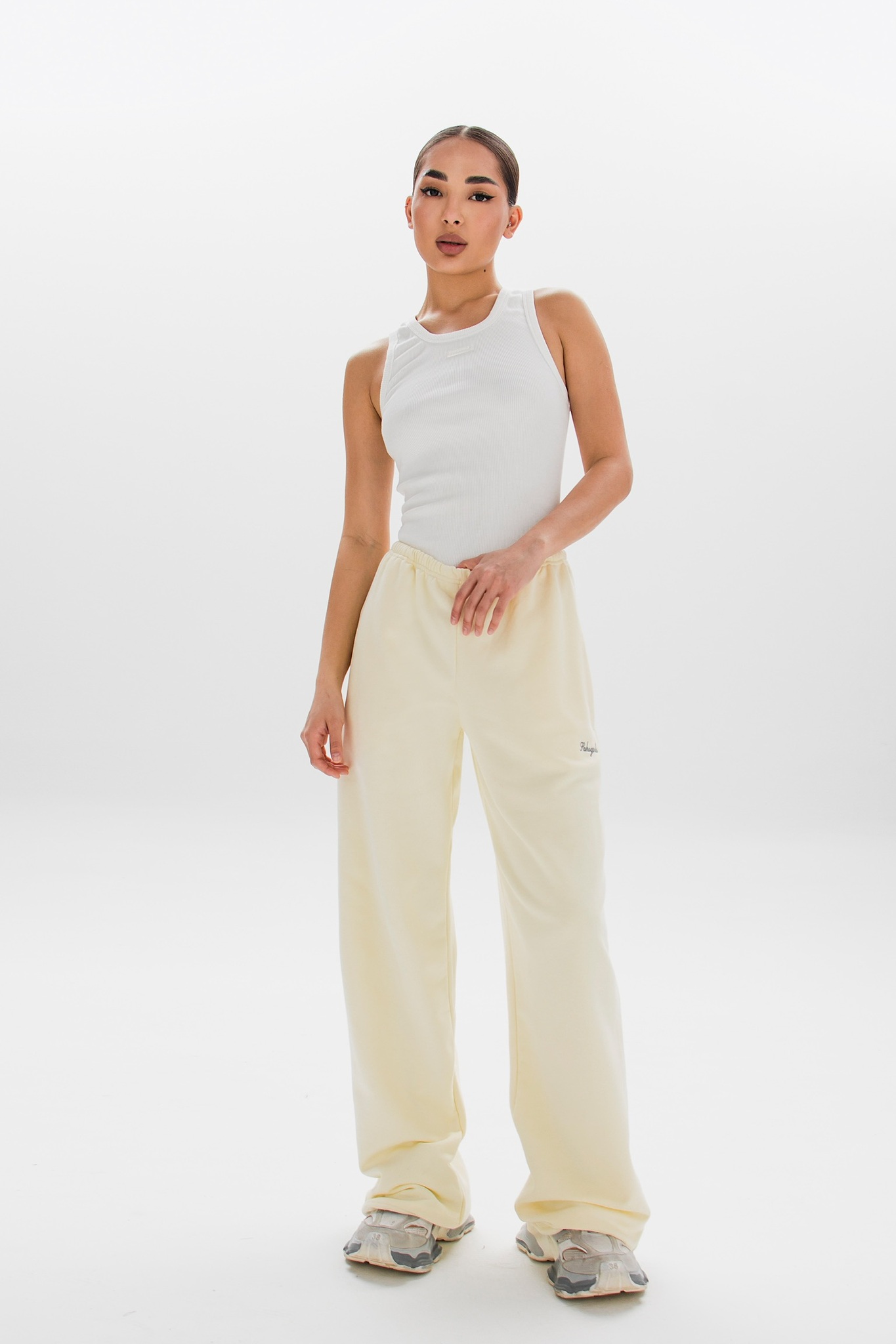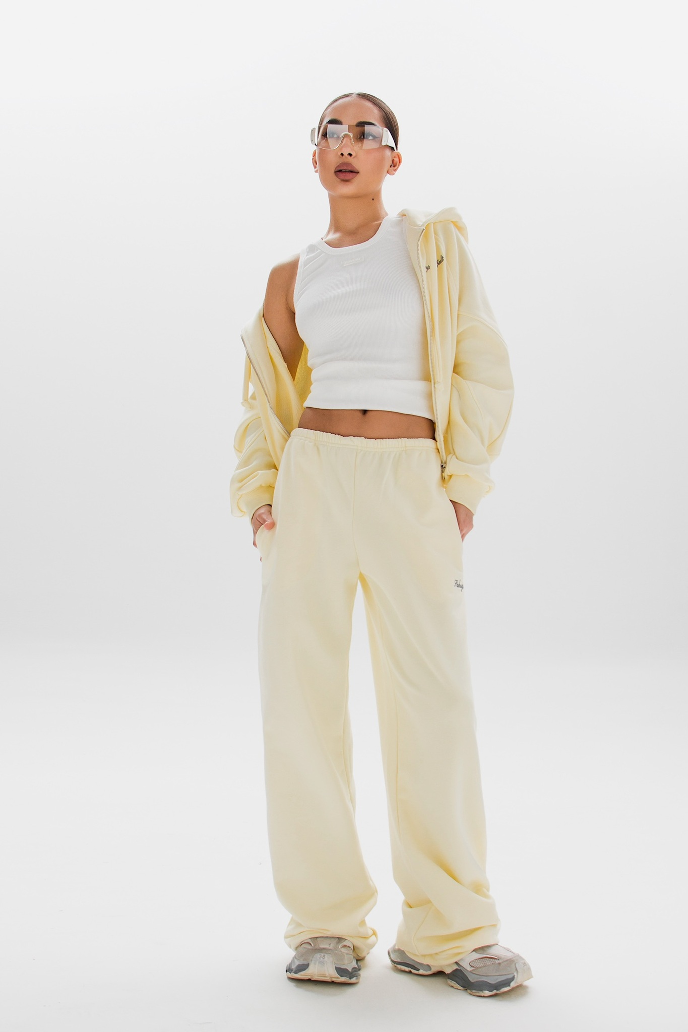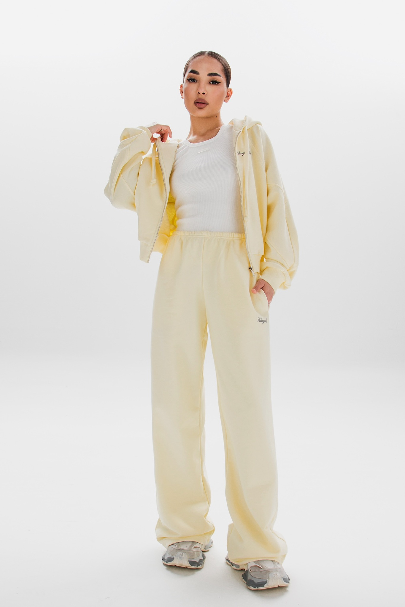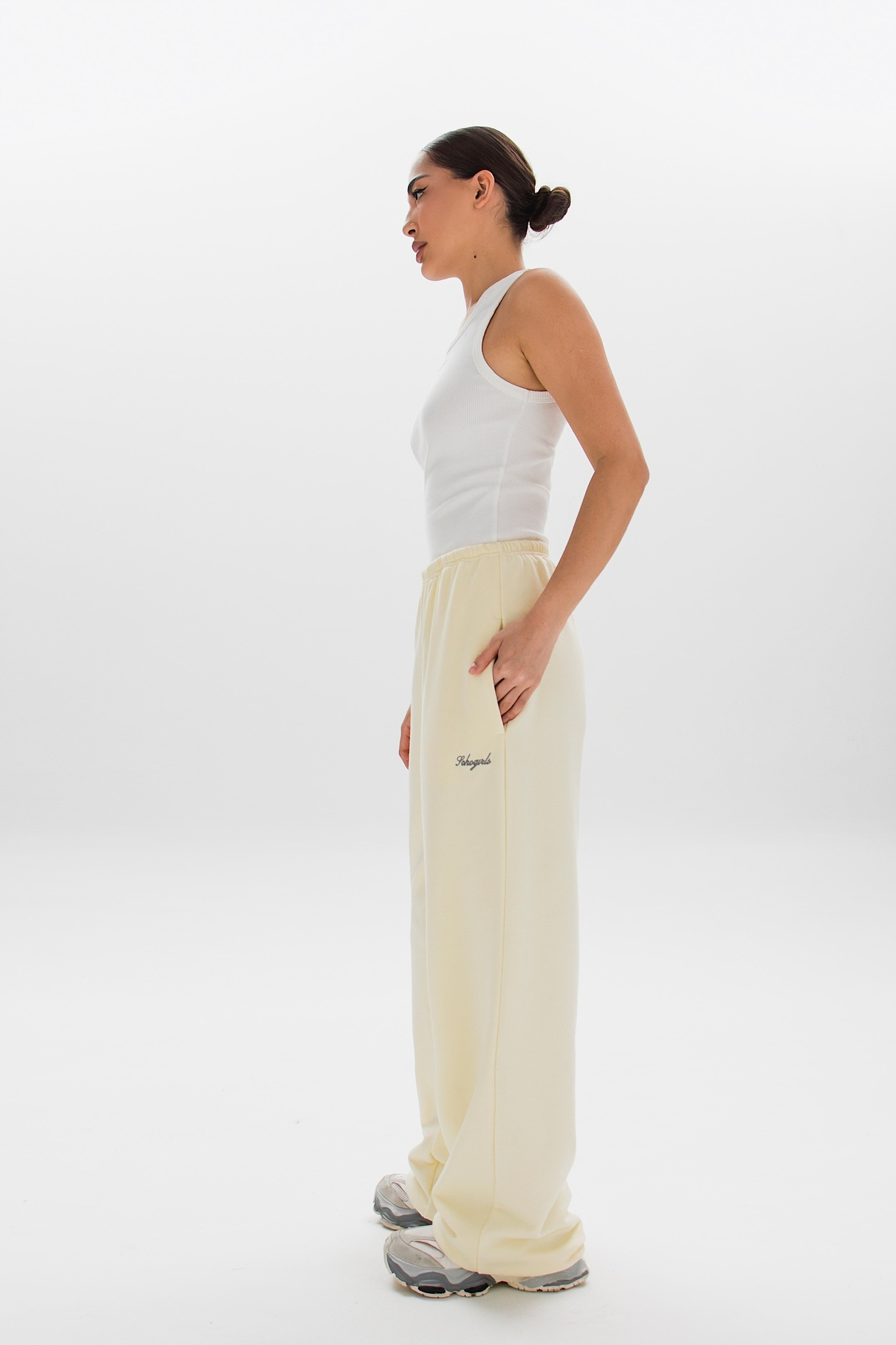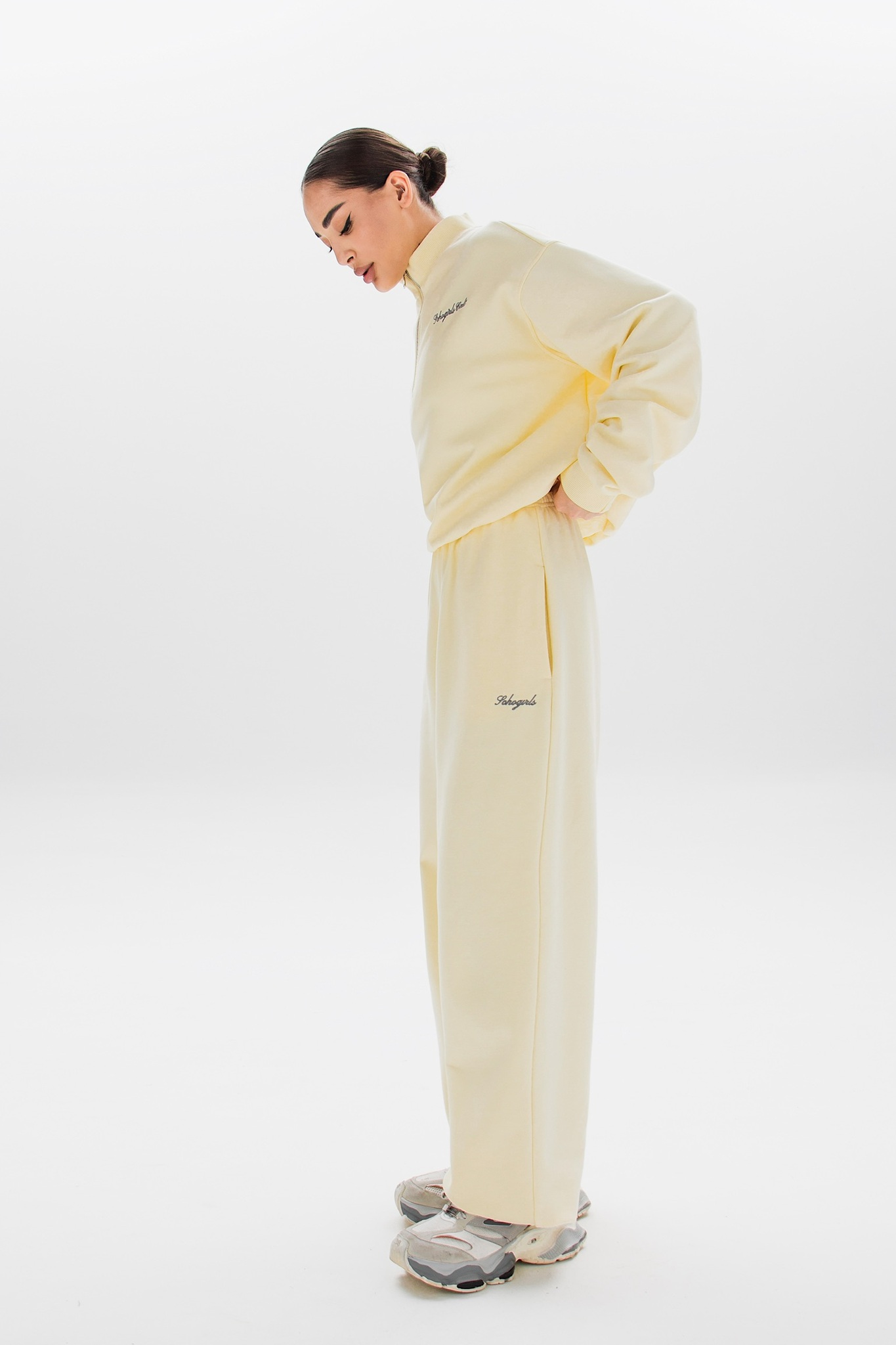 Широкие брюки-трубы на высокой посадке с плотным эластичным поясом, дополненный завязкой с логотипом бренда. Модель идеально садится на девушек ростом от 170 см. Для составления уютного и теплого комплекта вы можете выбрать вязаный джемпер из такой же мягкой ткани.