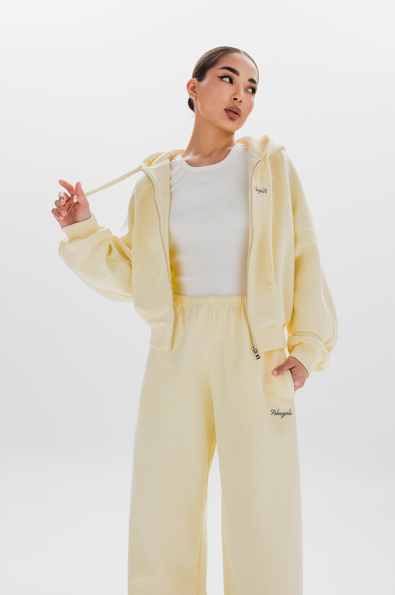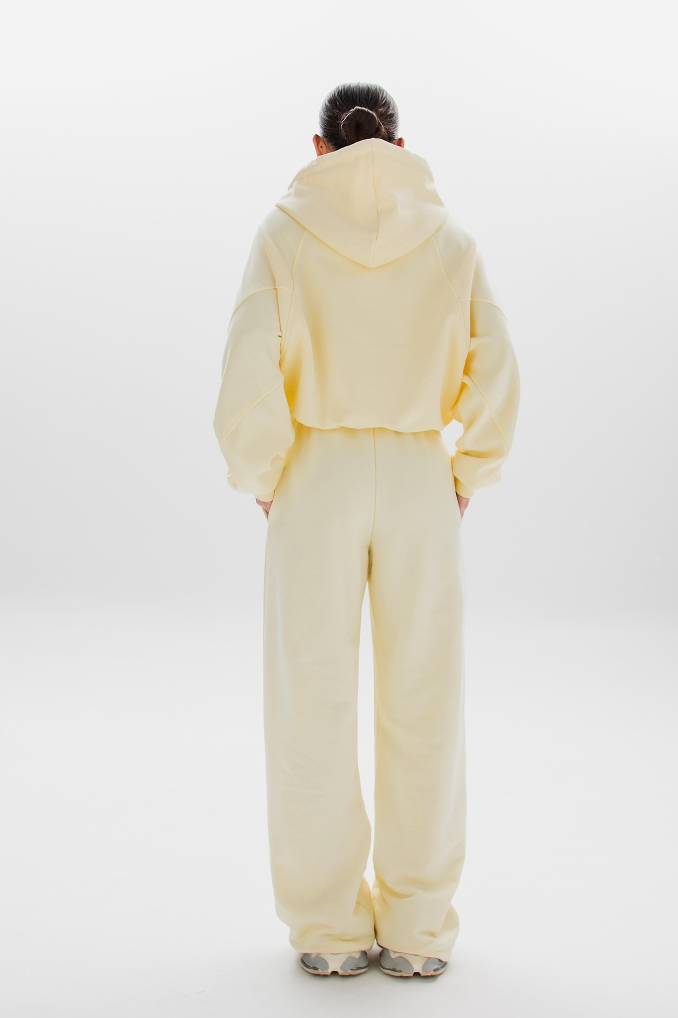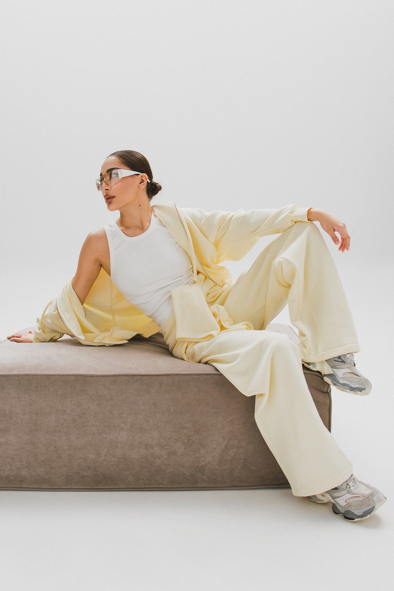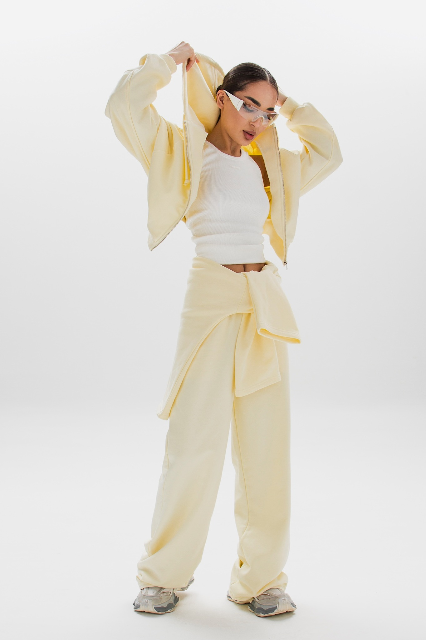 Брюки можно носить как классические палаццо или трансформировать в стильные джоггеры, используя скрытые фиксаторы снизу. Такой функциональный дизайн подойдет для создания различных образов