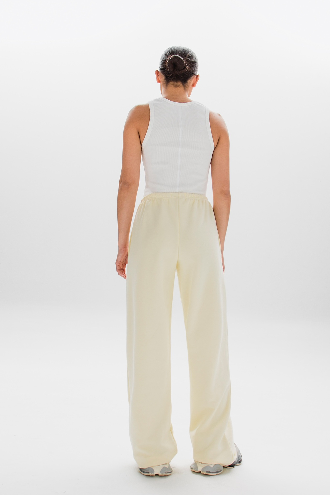Лаконичные прямые брюки с широкой мягкой резинкой, облегающие бедра и свободные книзу. Модель выполнена из теплой мягкой ткани в составе с шерстью.