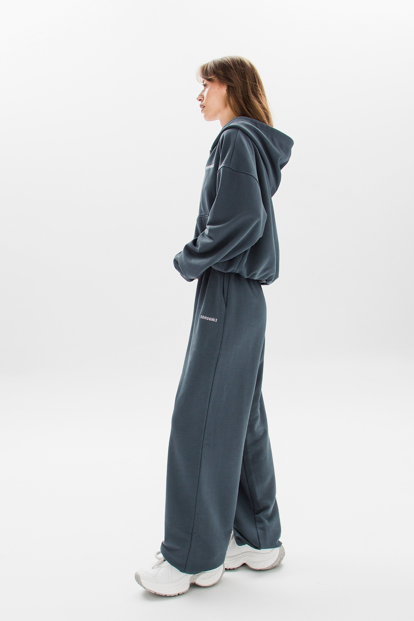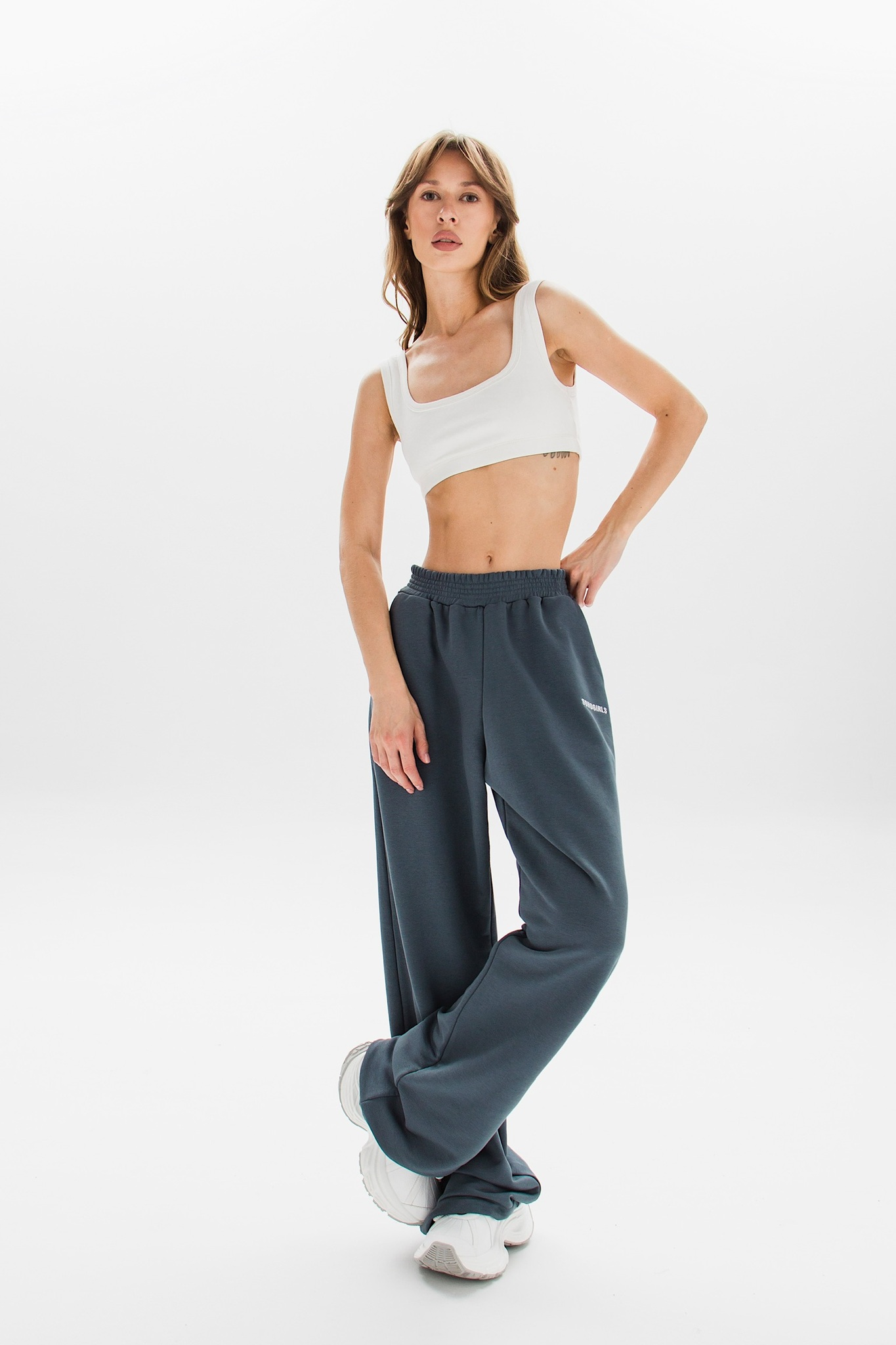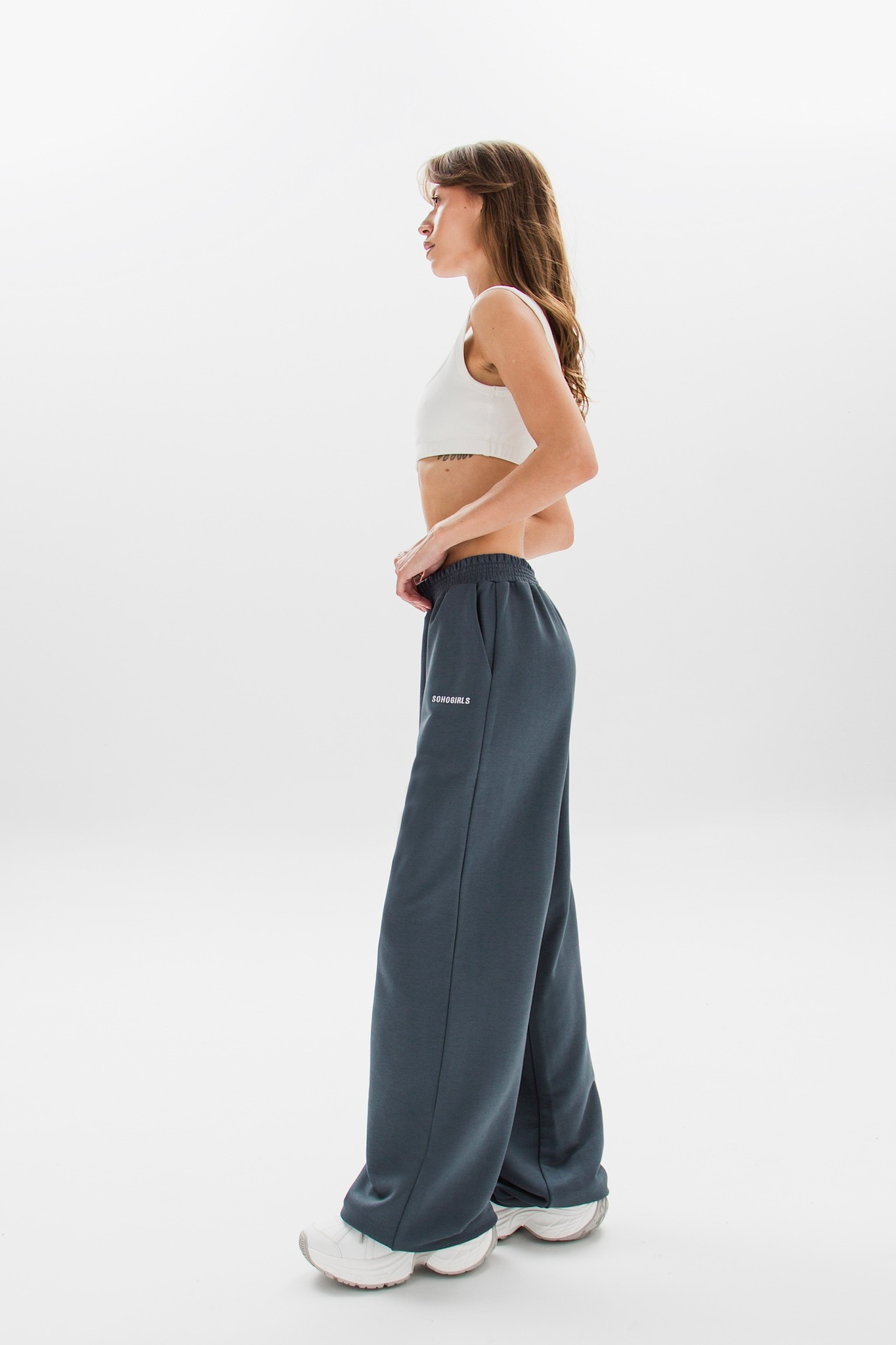 Широкие брюки-трубы на высокой посадке с плотным эластичным поясом, дополненный завязкой с логотипом бренда. Модель идеально садится на девушек ростом от 170 см. Для составления уютного и теплого комплекта вы можете выбрать вязаный джемпер из такой же мягкой ткани.