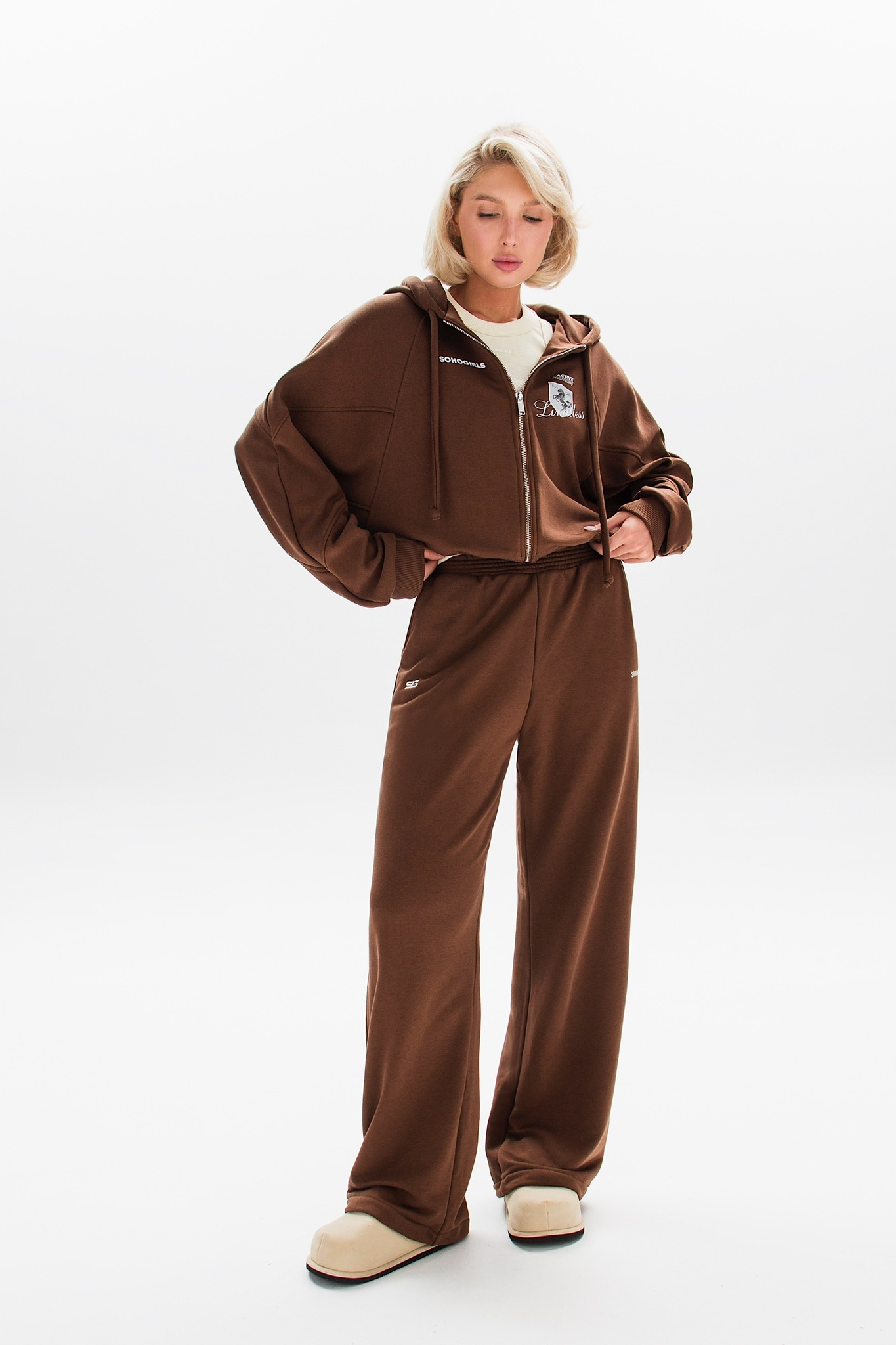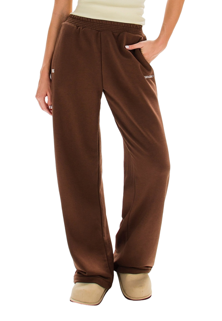 Широкие брюки-трубы на высокой посадке с плотным эластичным поясом, дополненный завязкой с логотипом бренда. Модель идеально садится на девушек ростом от 170 см. Для составления уютного и теплого комплекта вы можете выбрать вязаный джемпер из такой же мягкой ткани.