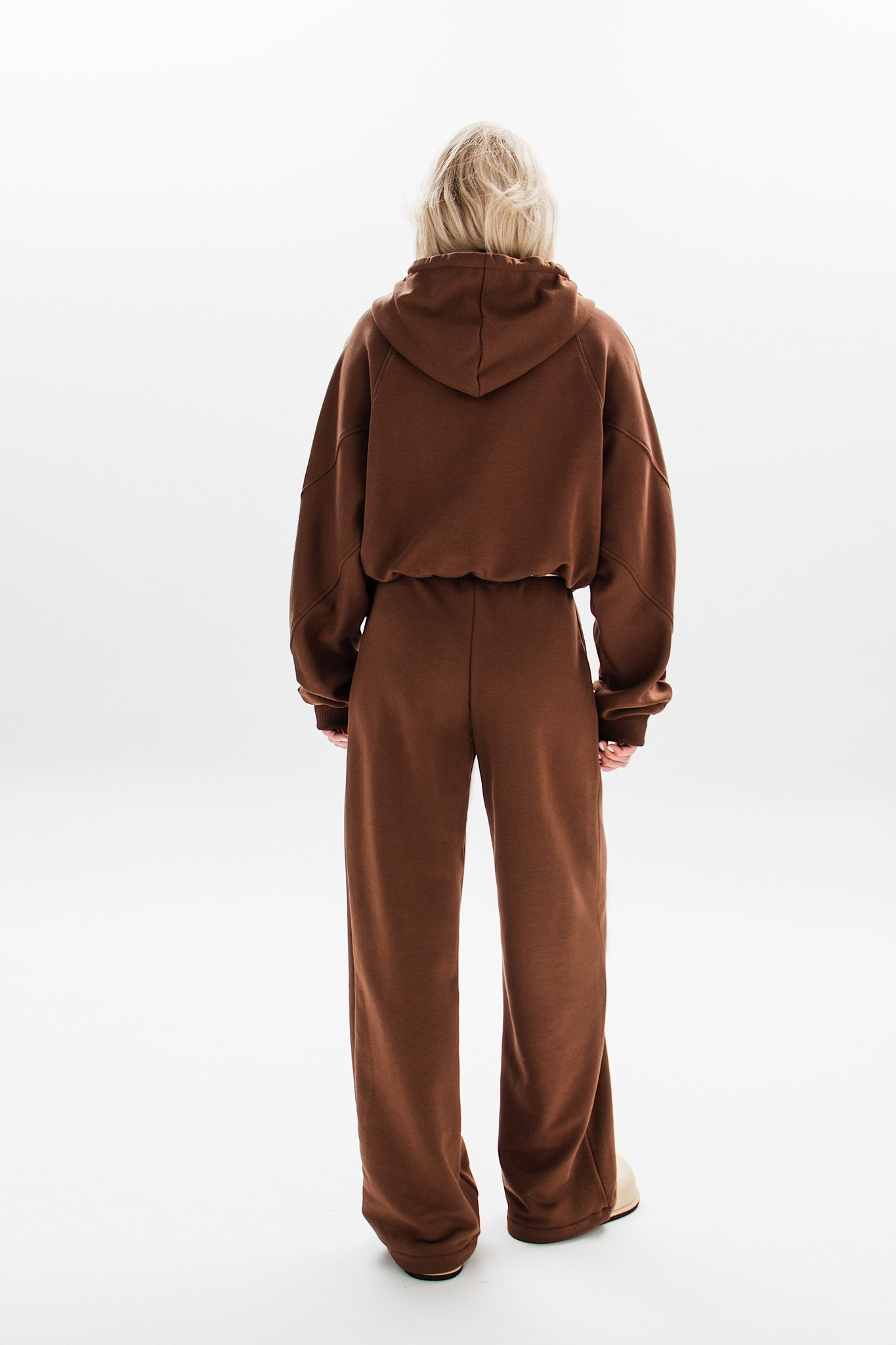 Брюки можно носить как классические палаццо или трансформировать в стильные джоггеры, используя скрытые фиксаторы снизу.