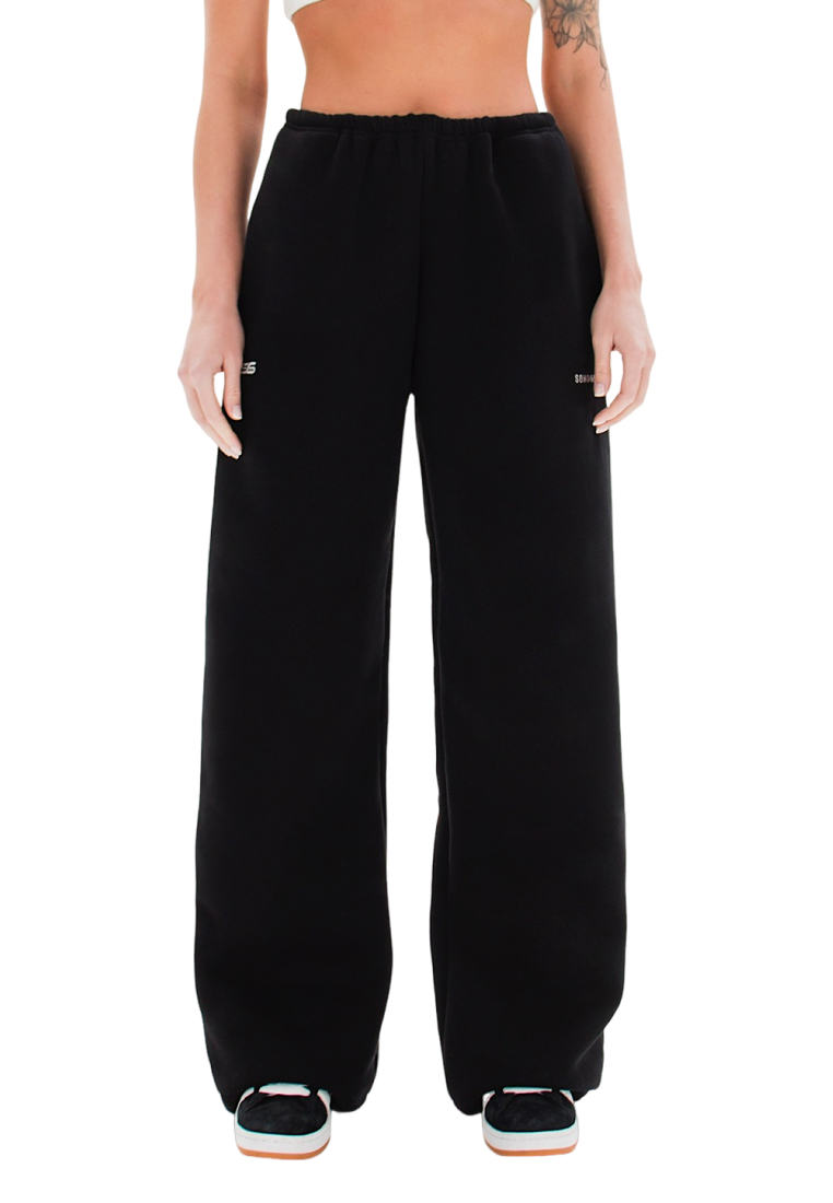 Трикотажные брюки свободного кроя из плотного и мягкого футера с начесом. Из деталей: мягкая широкая резинка, контрастный шнурок, стрелки. Брюки составляют идеальную пару с худи из той же ткани, а также они легко способны подружиться со всем вашим базовым гардеробом.