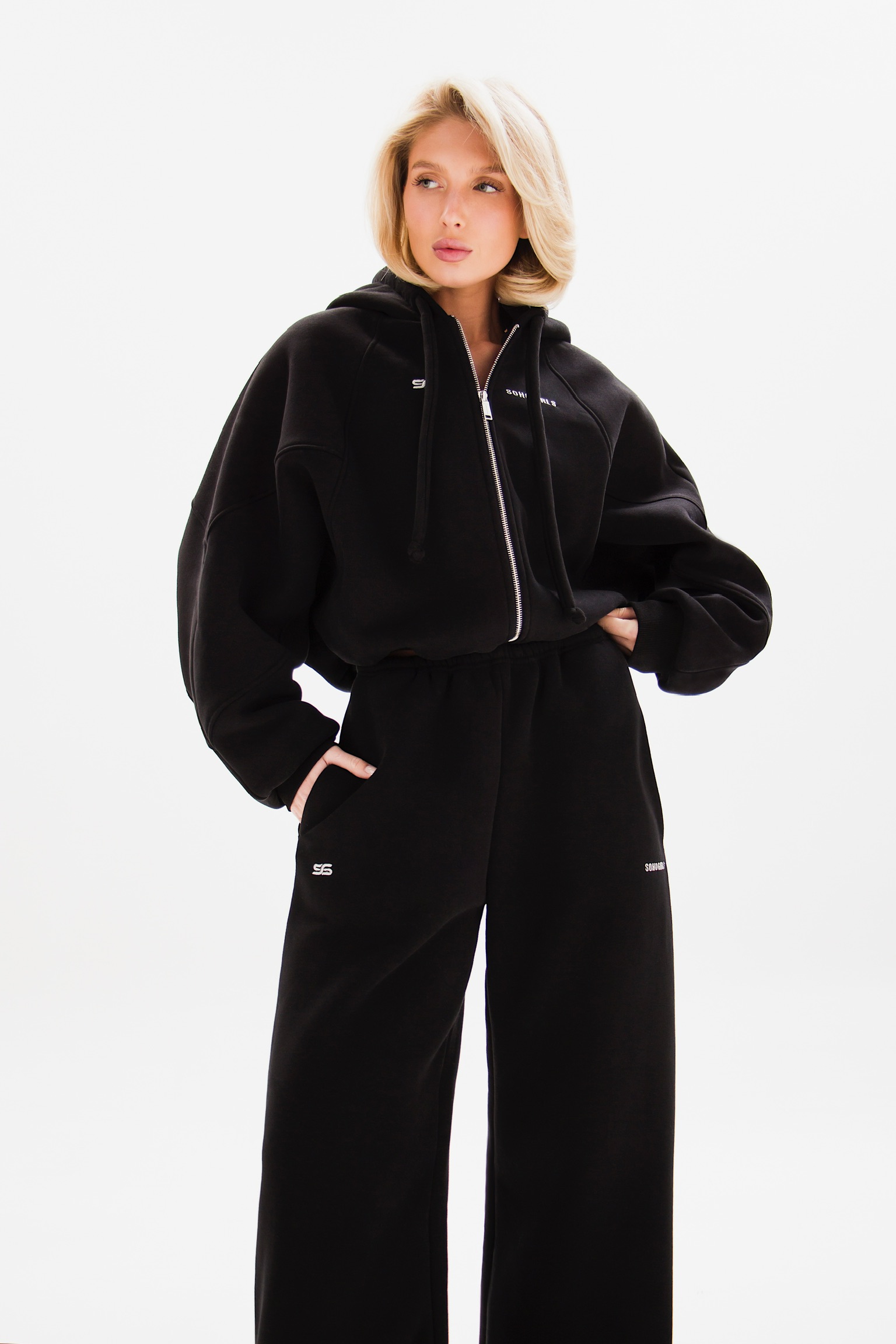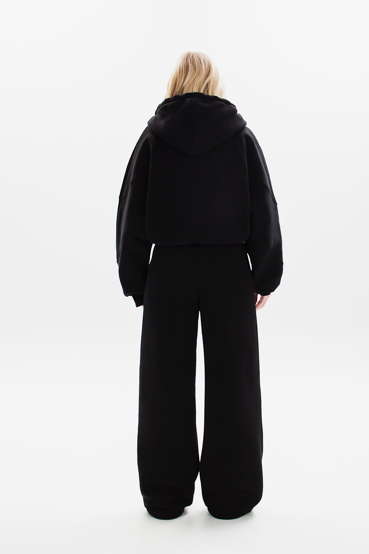 Брюки можно носить как классические палаццо или трансформировать в стильные джоггеры, используя скрытые фиксаторы снизу. Такой функциональный дизайн подойдет для создания различных образов