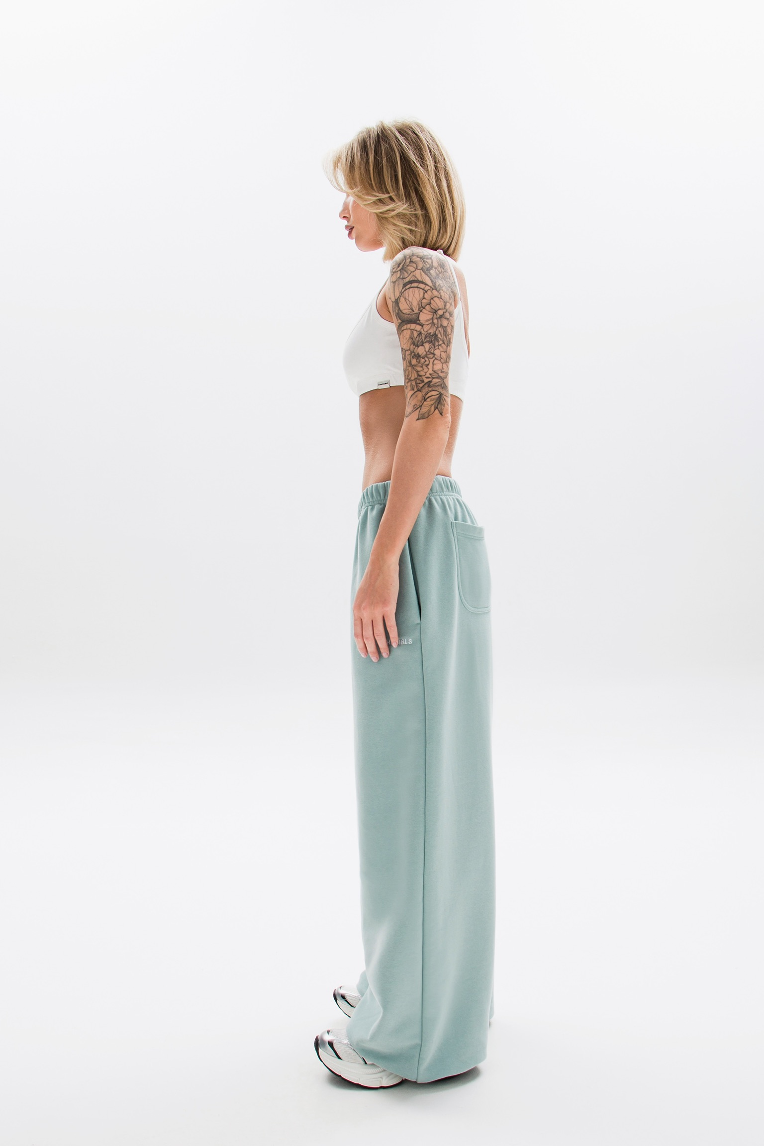 Снизу предусмотрены фиксаторы, которые позволяют регулировать силуэт — носить брюки более свободно или собирать по низу.