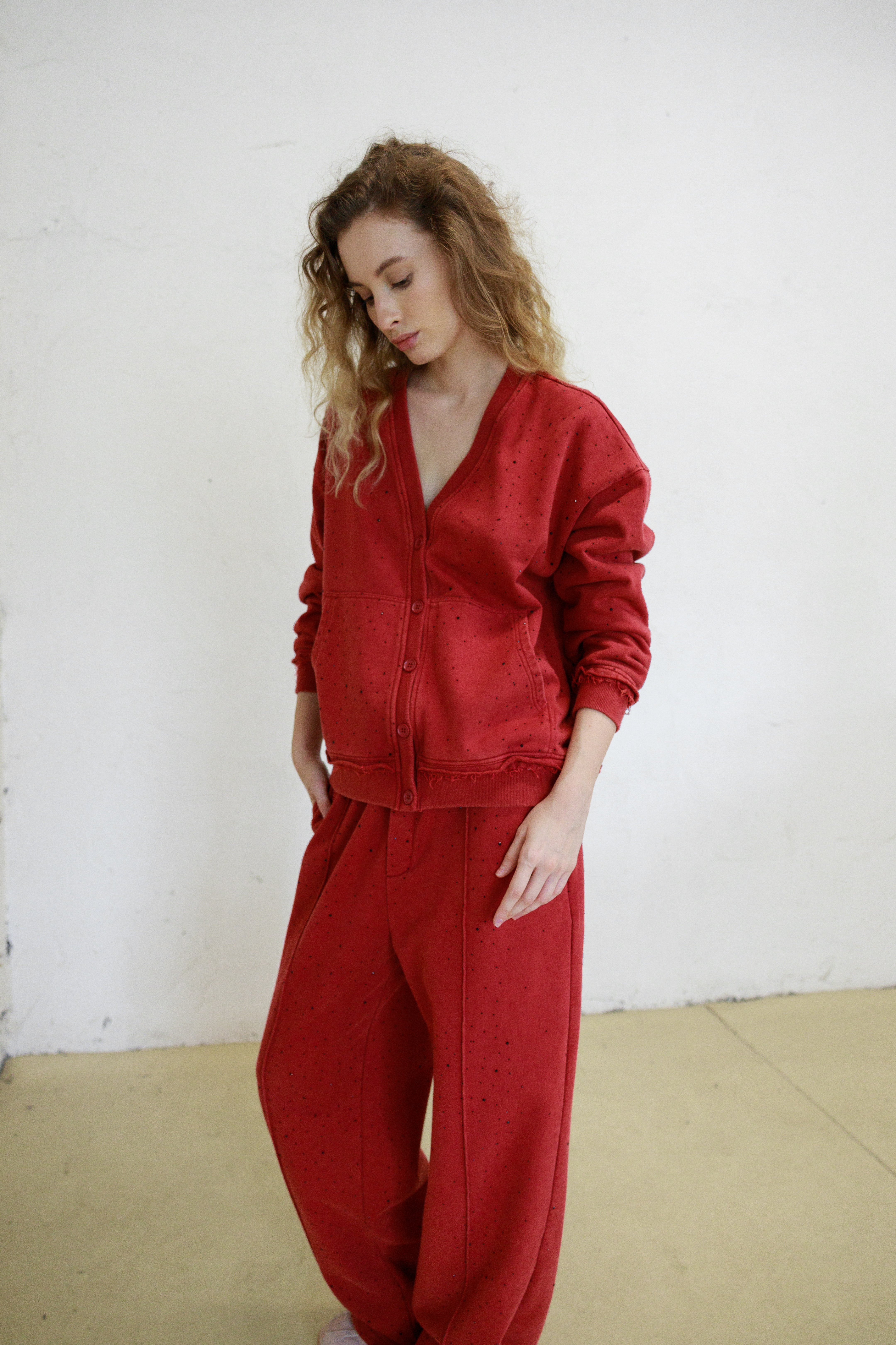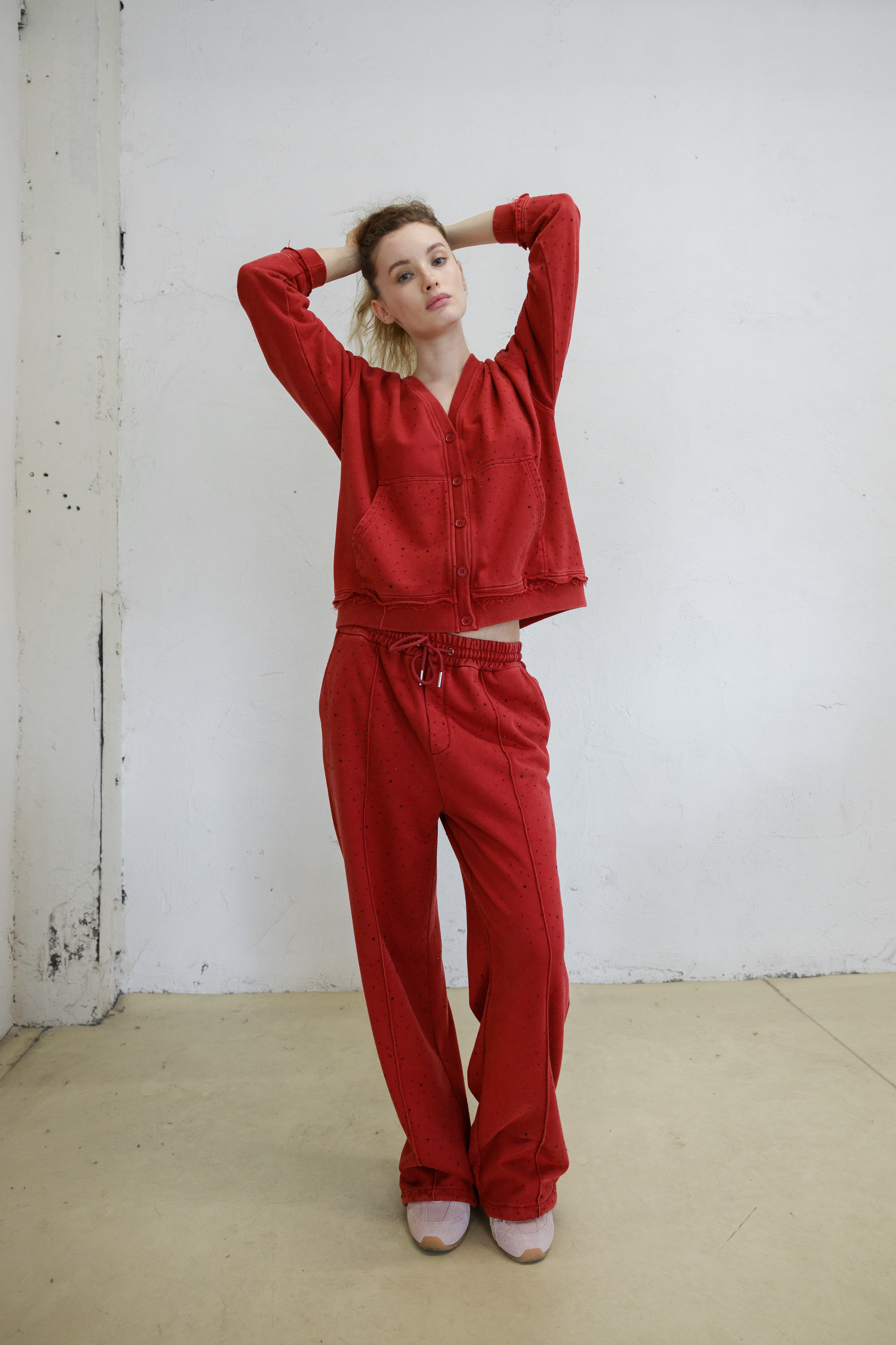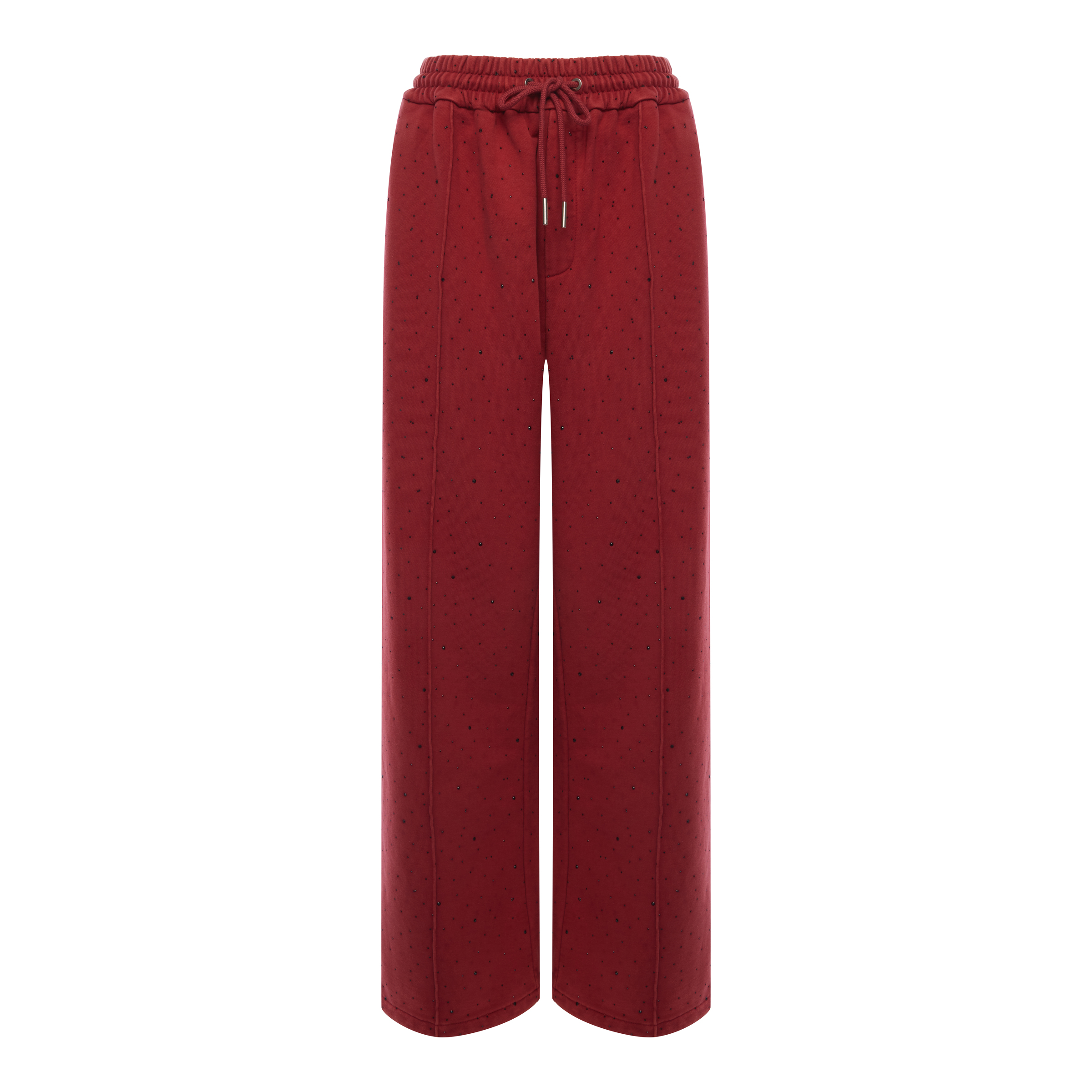 Брюки из футера со стразами. Изделие обладает дышащими свойствами, хорошо сохраняет тепло и поддерживает оптимальный микроклимат. Практичная деталь - четыре кармана - сочетает стильный внешний вид с удобством. Регулируемый низ штанин позволяет изменять длину и силуэт, адаптируя брюки под разное настроение. Равномерное распределение страз по поверхности создает эффектный блестящий акцент, делая вещь универсальной для повседневной носки и вечерних выходов