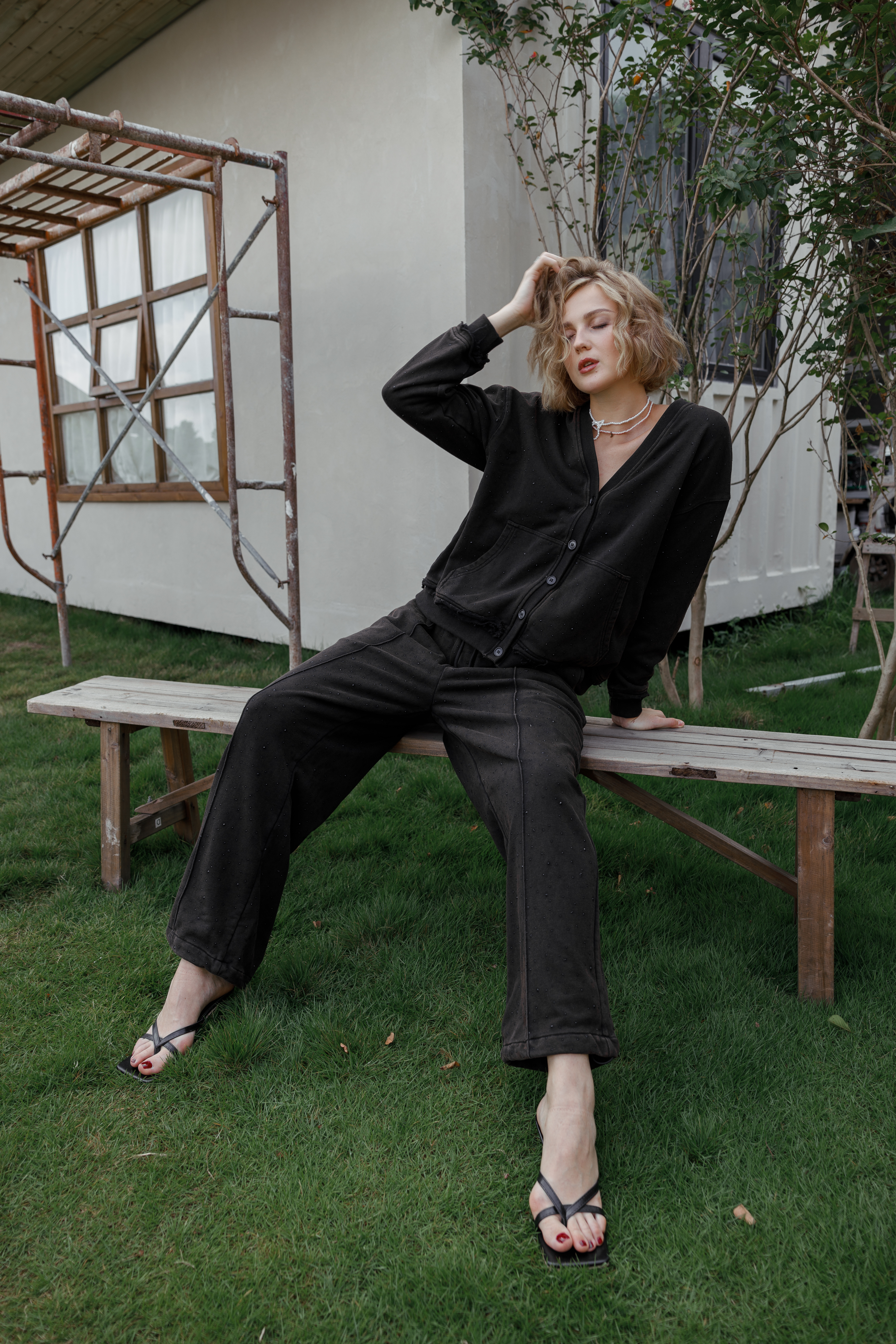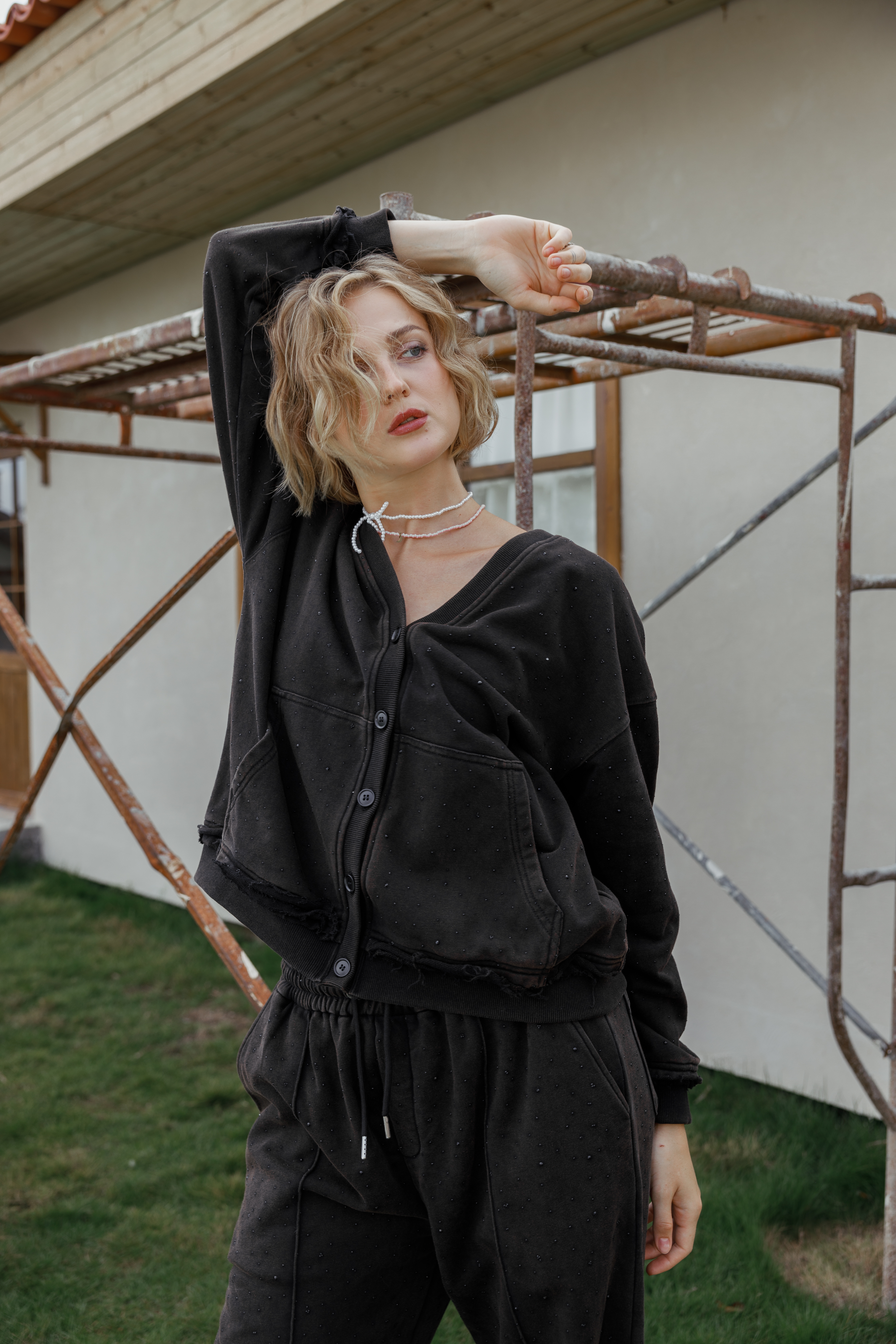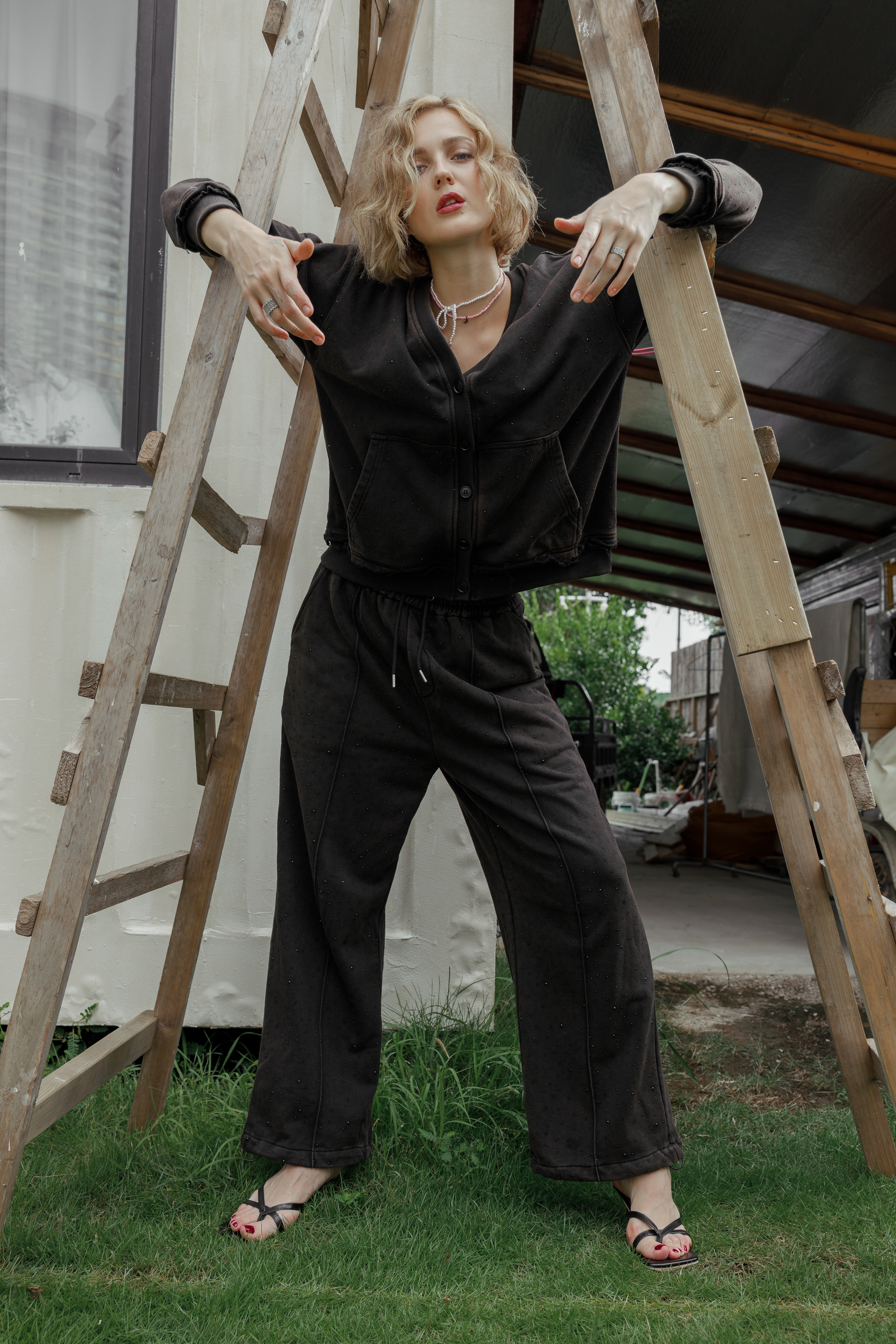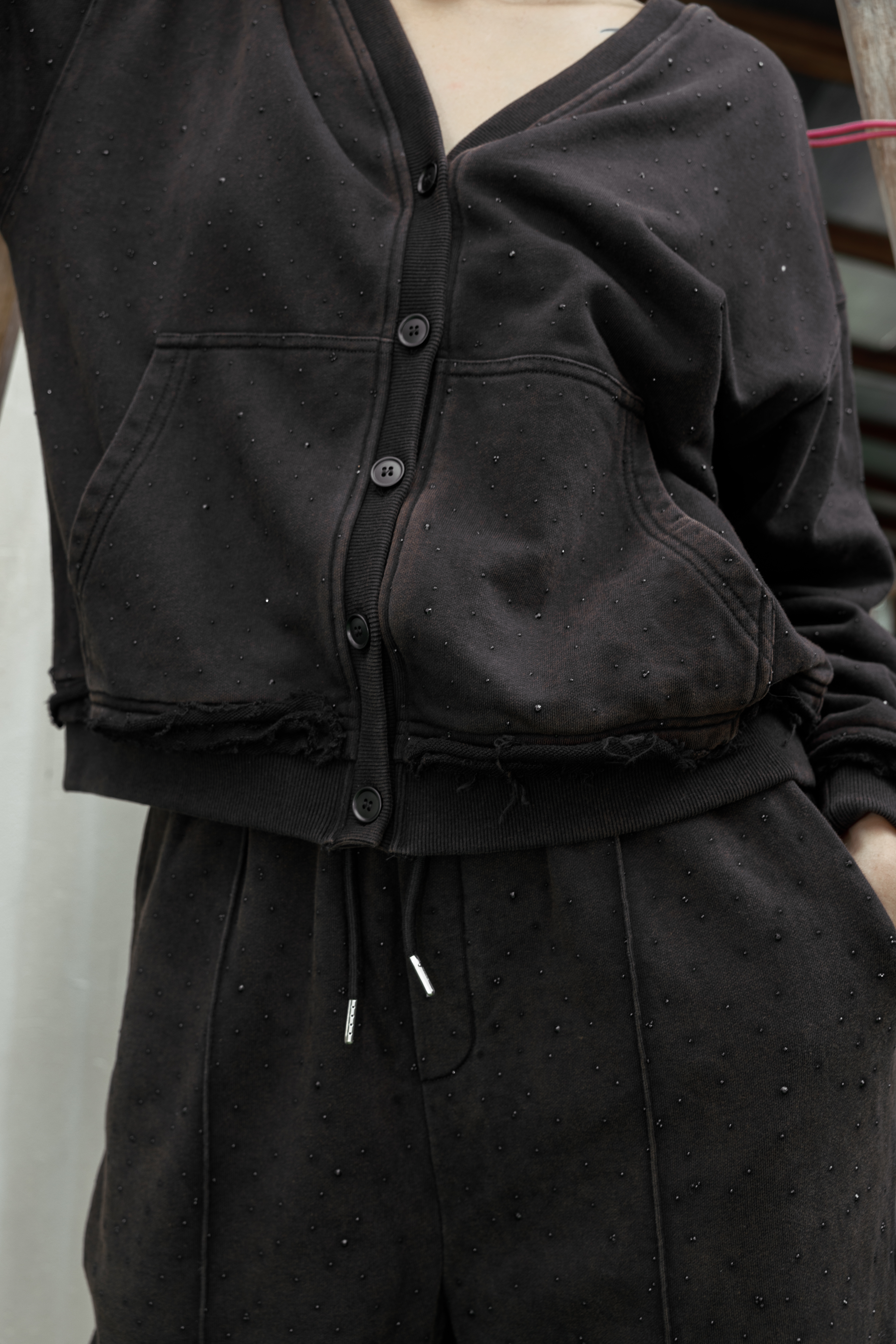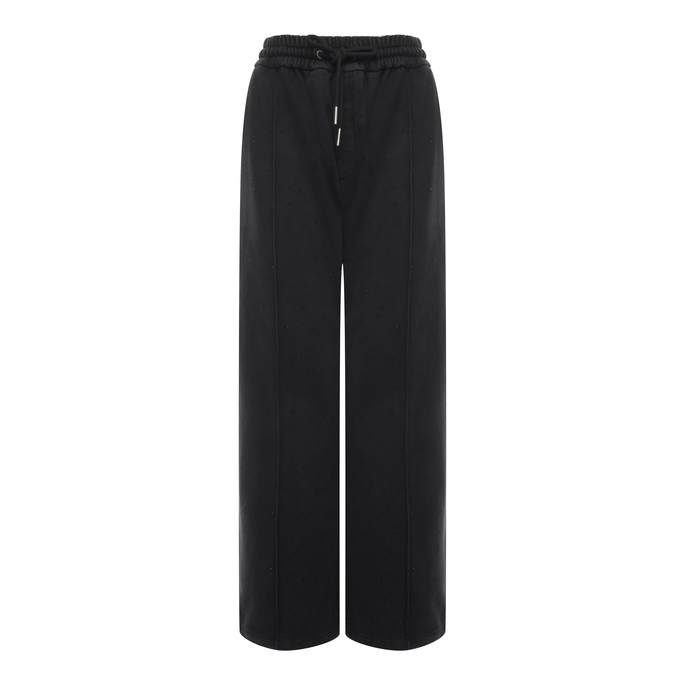 Брюки из футера со стразами. Изделие обладает дышащими свойствами, хорошо сохраняет тепло и поддерживает оптимальный микроклимат. Практичная деталь - четыре кармана - сочетает стильный внешний вид с удобством. Регулируемый низ штанин позволяет изменять длину и силуэт, адаптируя брюки под разное настроение. Равномерное распределение страз по поверхности создает эффектный блестящий акцент, делая вещь универсальной для повседневной носки и вечерних выходов