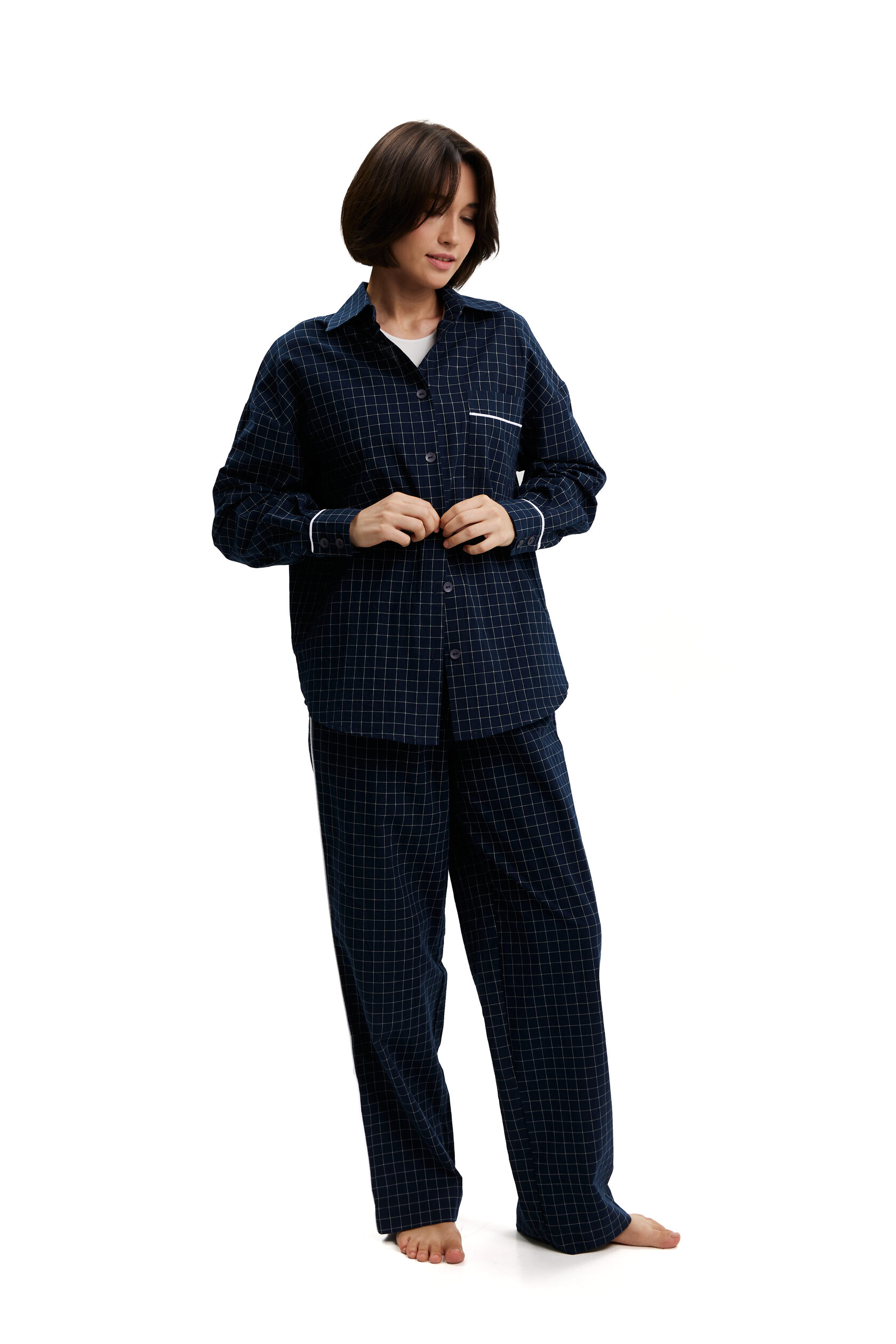 Верхняя часть пижамы выполнена в виде рубашки с длинными рукавами, которая обеспечивает дополнительную теплоту и комфорт. Брюки пижамы имеют эластичный пояс, который обеспечивает идеальную посадку на вашей талии.