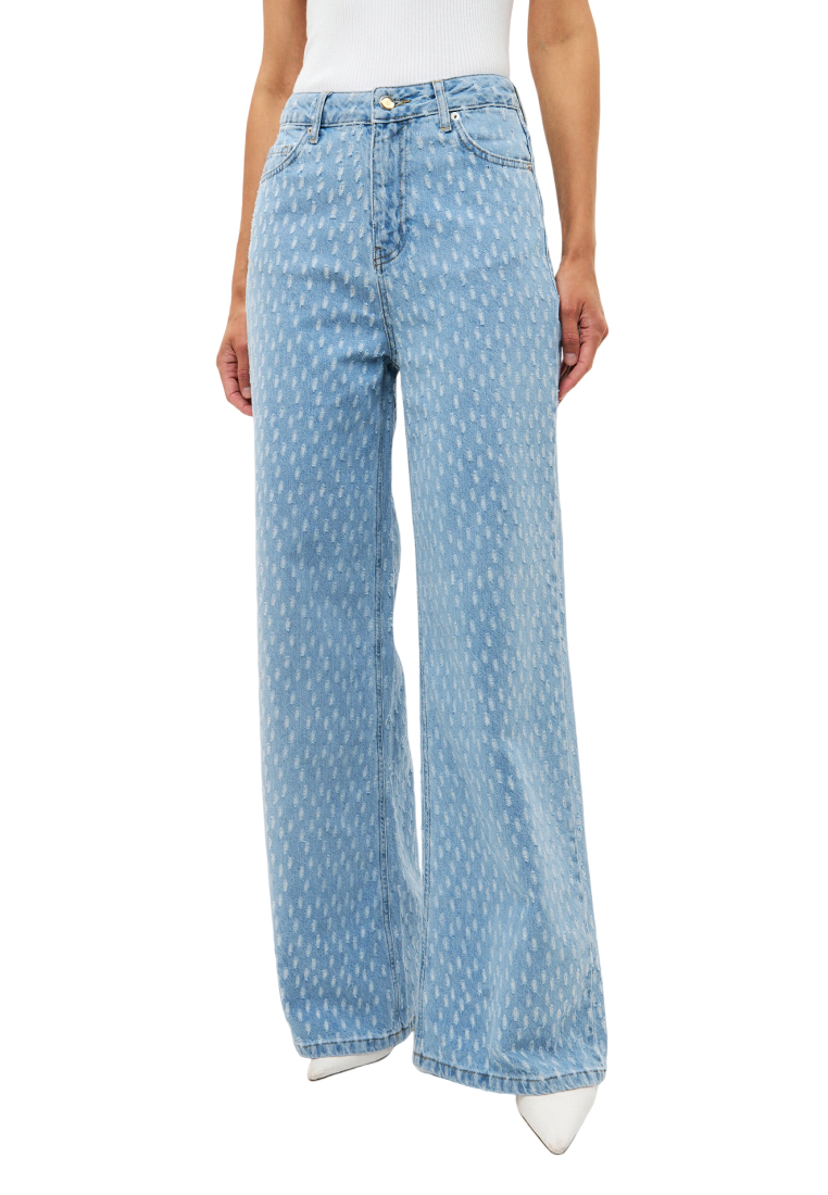 Широкие джинсы на слегка завышенной посадке винтажного голубого оттенка визуально вытягивают силуэт и эффектно смотрятся с обувью на каблуке. Модель оснащена четырьмя карманами, застёжкой на молнию и пуговицу. Благодаря актуальному фасон прекрасно садится на любую фигуру.