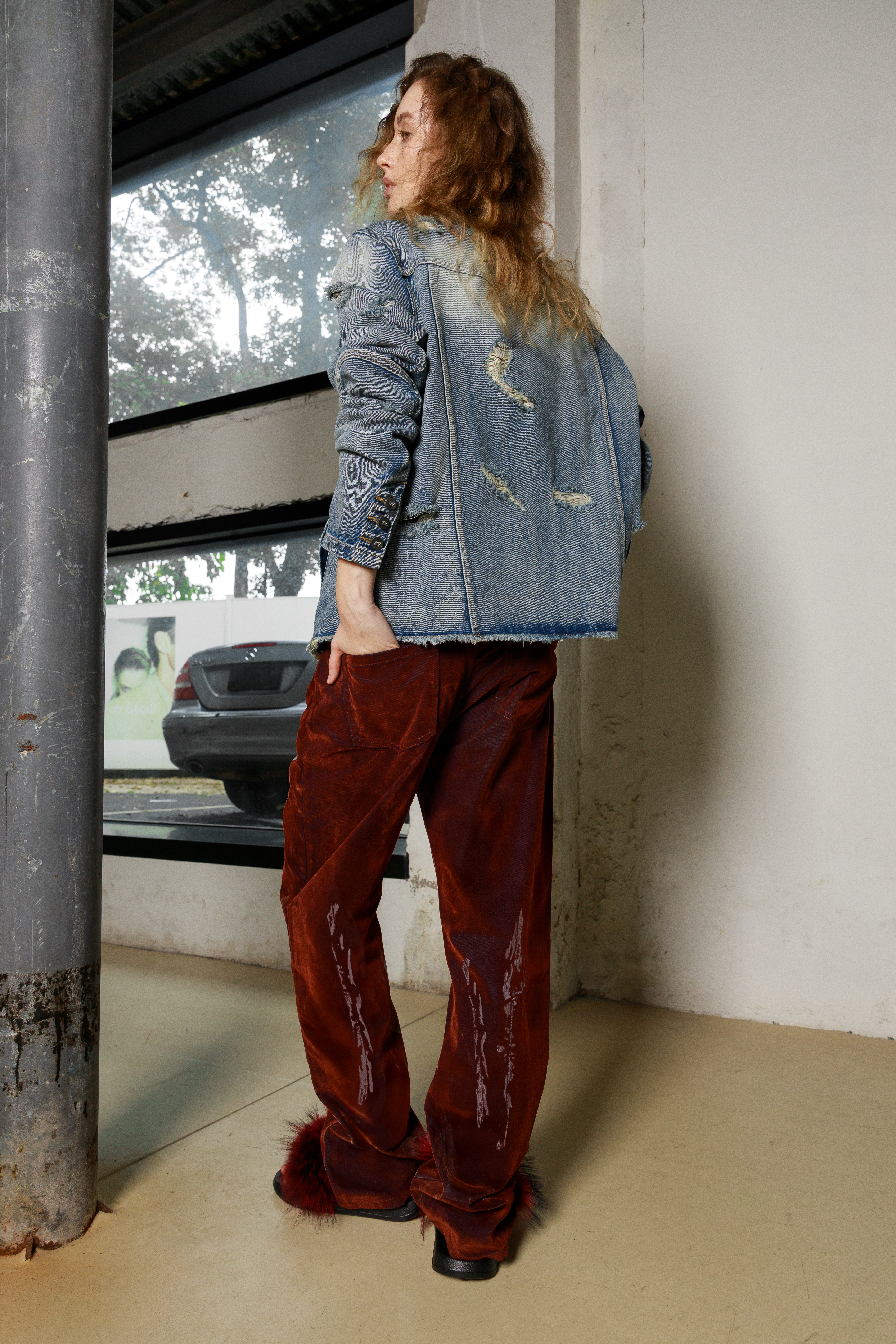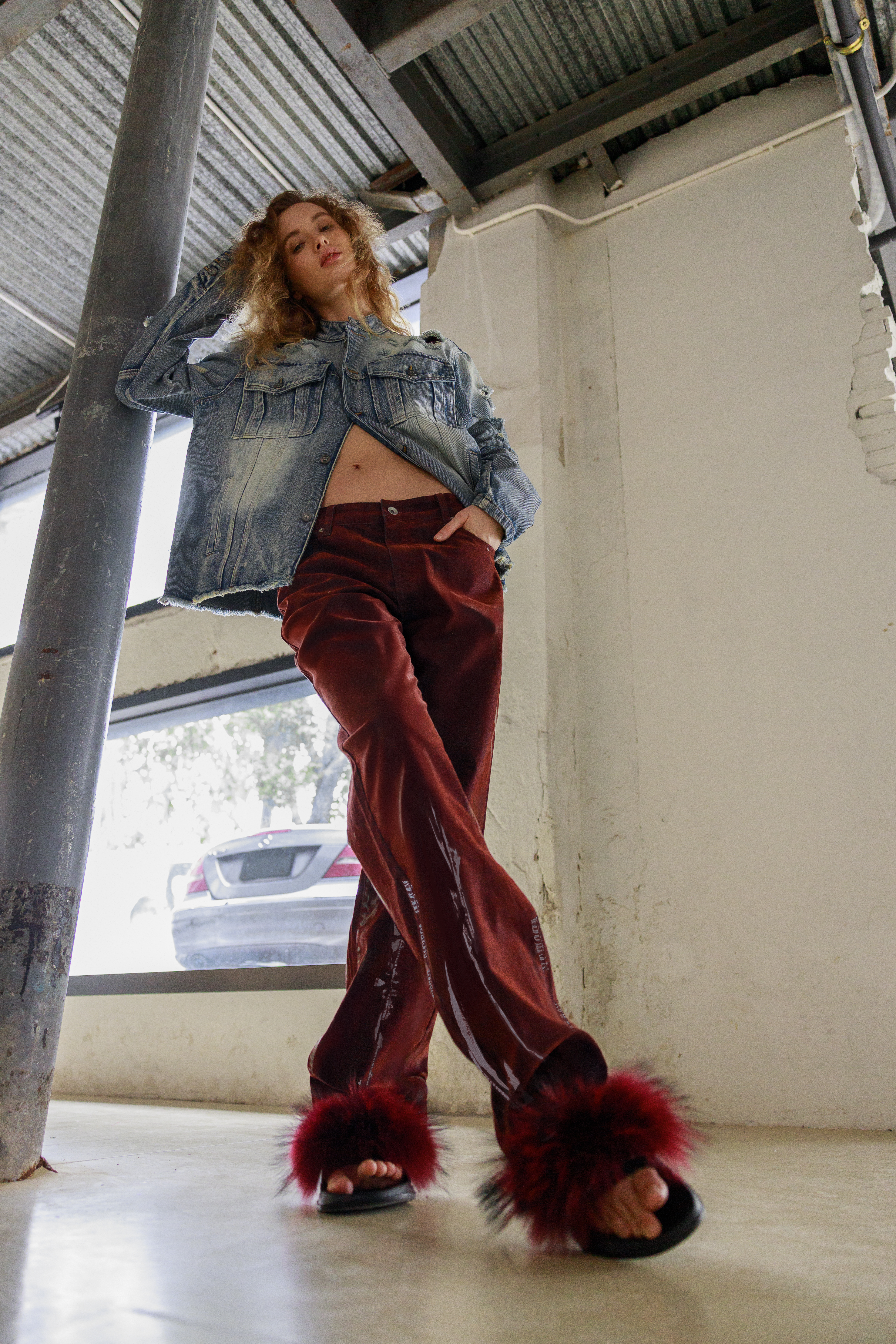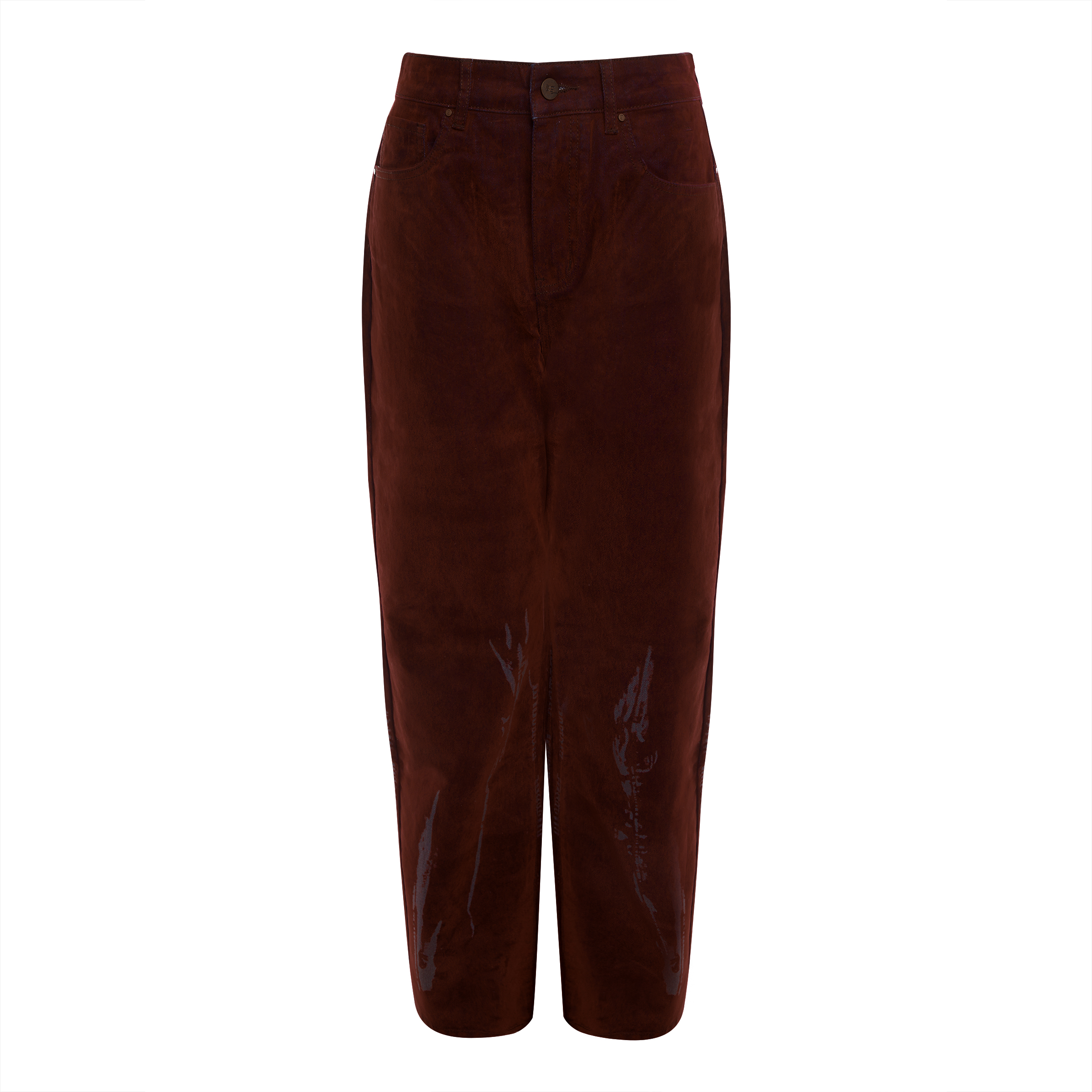 Джинсы с велюровым покрытием и дизайнерским принтом. Изделие выполнено в насыщенном коричневом оттенке, который подчеркивает фактурную поверхность ткани. Велюровое напыление создает эффект мягкого бархатистого блеска, придавая образу уютную и в то же время стильную эстетику. Удобный крой обеспечивает комфорт в течение всего дня. Практичная и долговечная ткань сохраняет насыщенность цвета даже при активной носке, сочетаясь с различными элементами базового гардероба