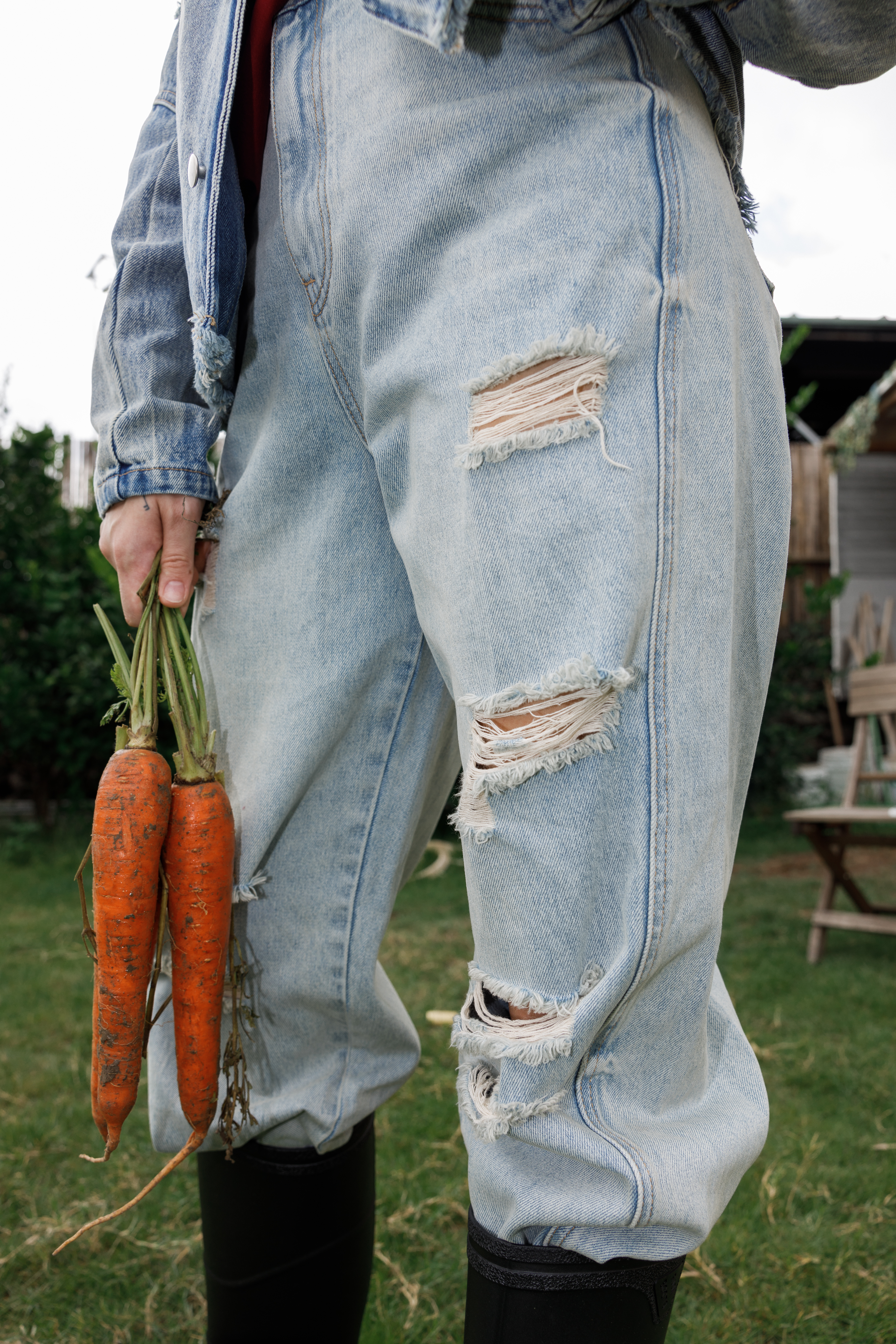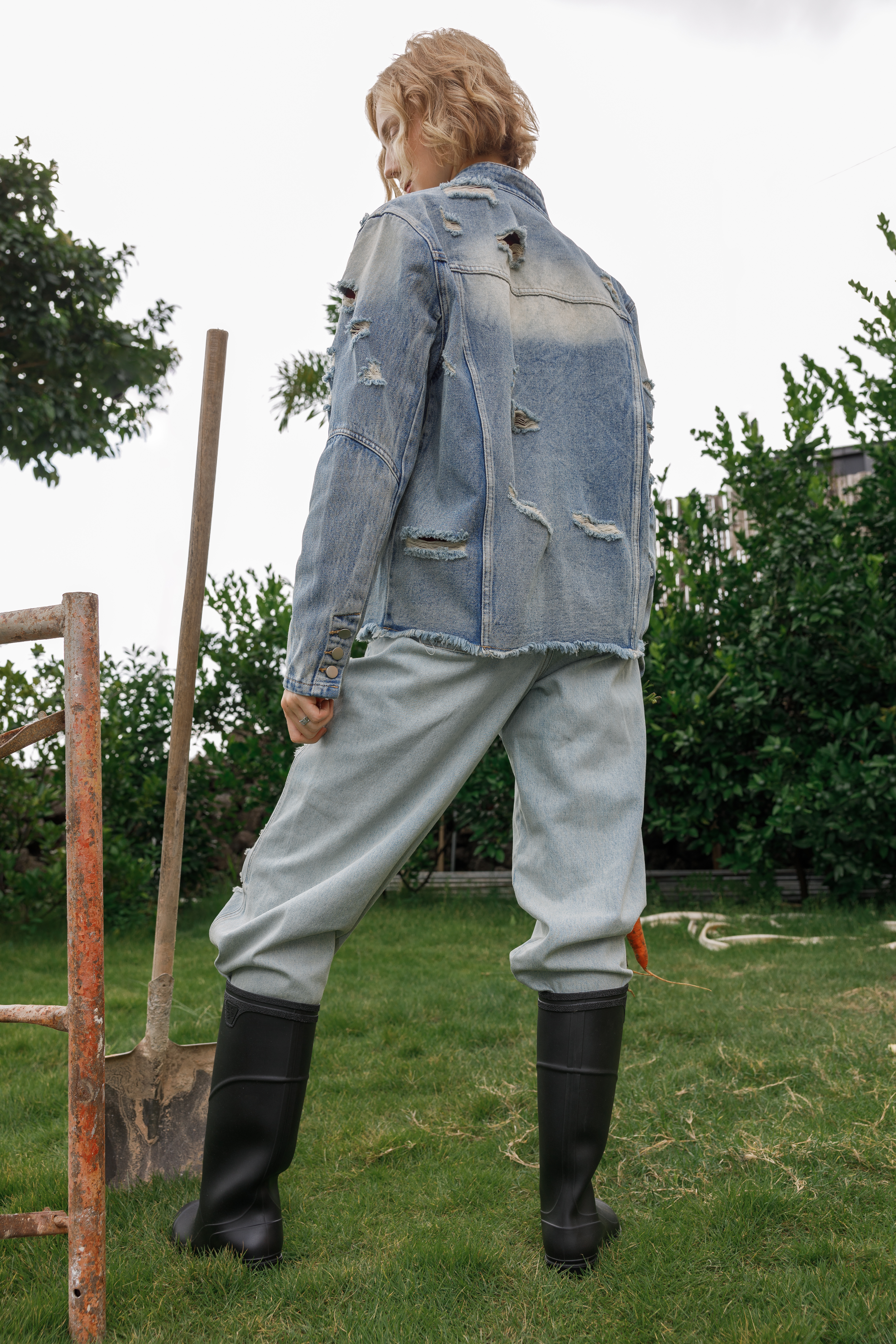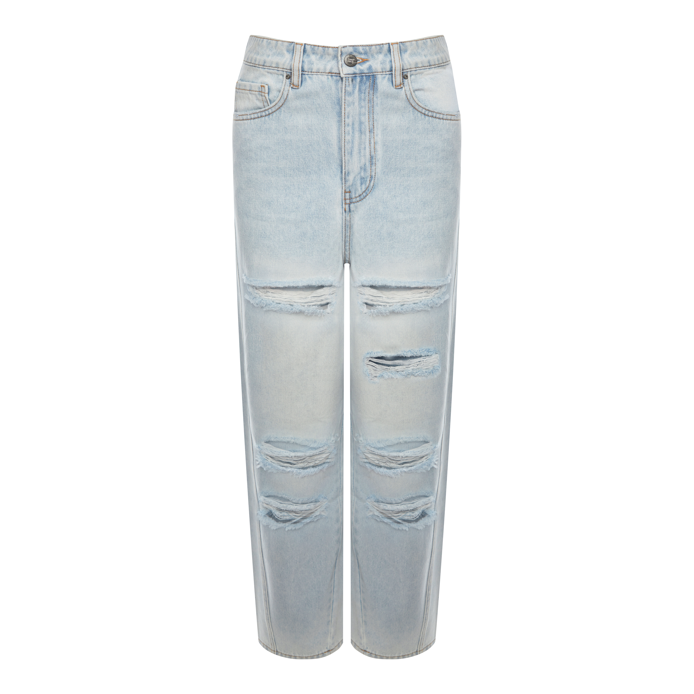 Рваные джинсы прямого кроя со светло-голубым оттенком сочетают в себе дерзкий уличный стиль и повседневный комфорт. Дышащий материал и свободный крой обеспечивают удобство в течение всего дня. Эффектные потертости и рваные элементы добавляют образу динамичности и индивидуальности. Изделие легко комбинируется с различной обувью и верхней одеждой, подходя для создания как расслабленных casual-образов, так и более смелых луков