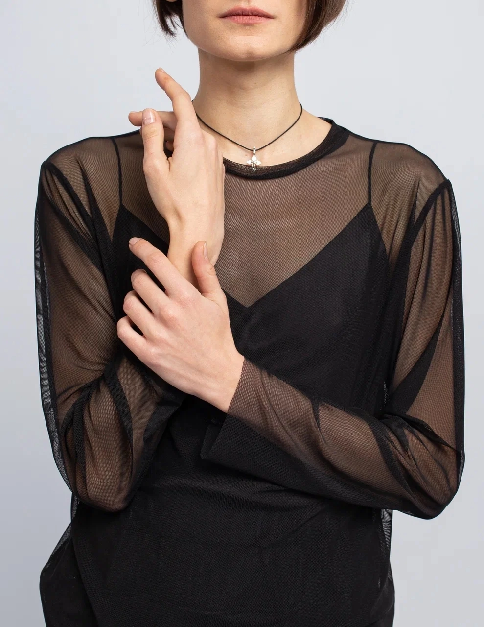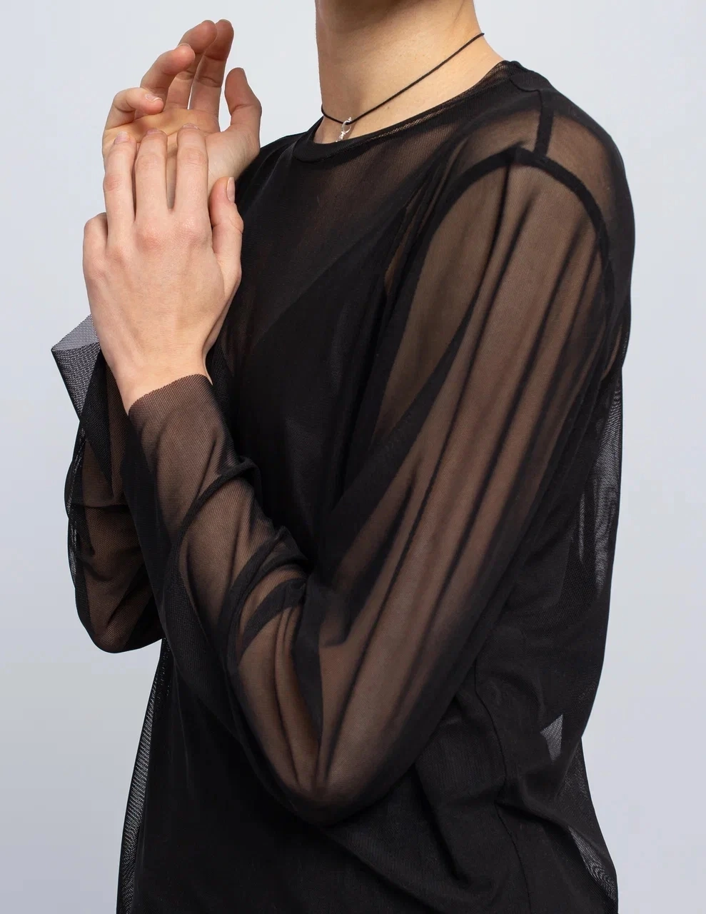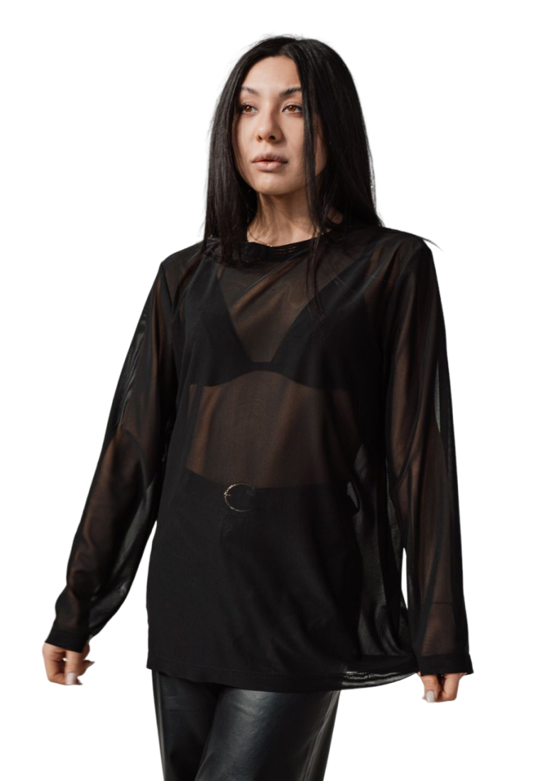 Лонгслив из полупрозрачной сетчатой ткани прямого, полуприлегающего силуэта. Классическая линия плеча, округлый вырез и лаконичный крой. Актуальная, базовая модель в гардеробе, которая дополнит многослойные образы с топами, жакетами и даже платьем-сарафаном.