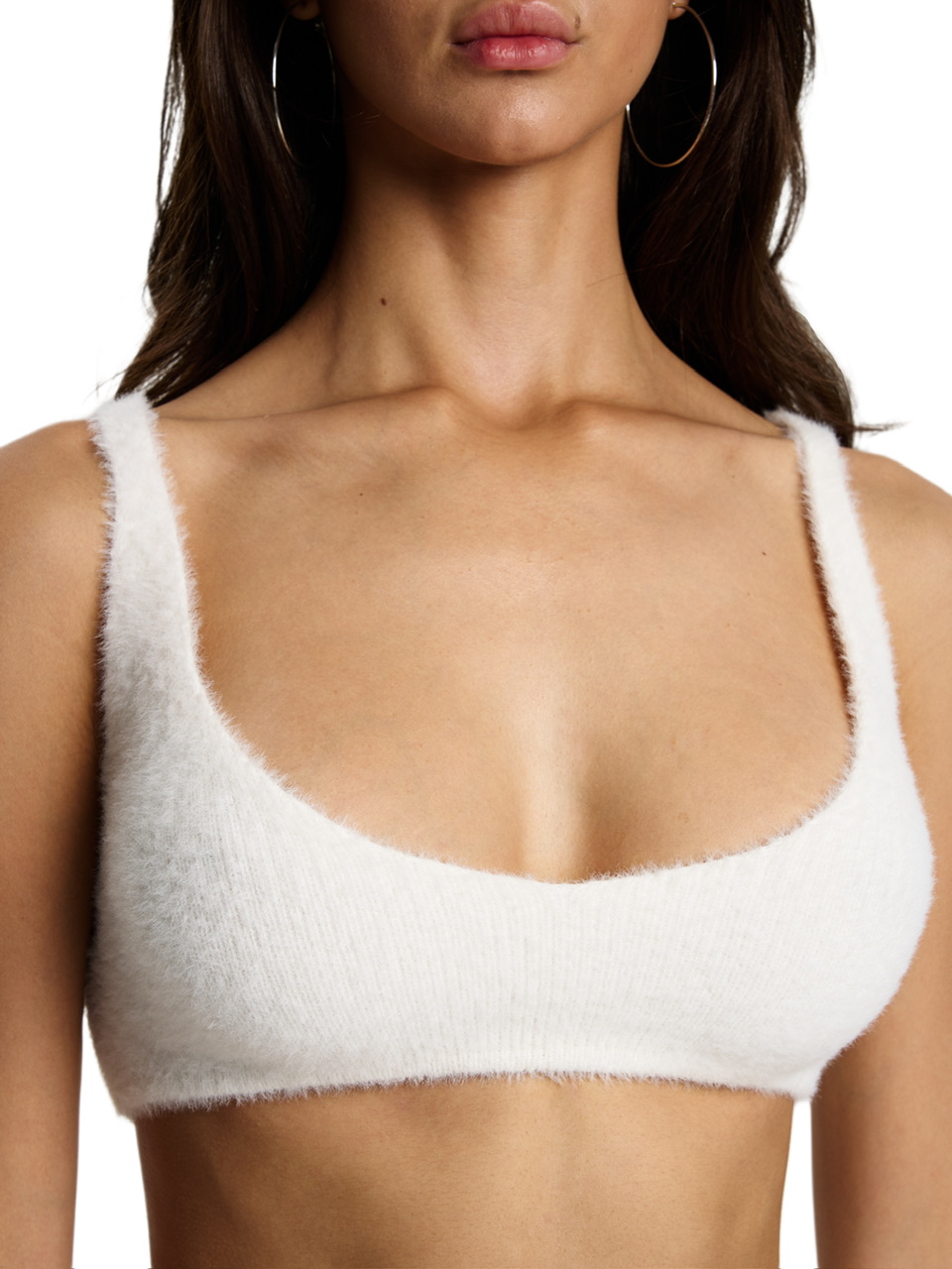 Пряжа невероятно пушистая, мягкая и совсем не колется. Топ отлично тянется, поэтому подойдёт и на маленький, и на более пышный размер груди