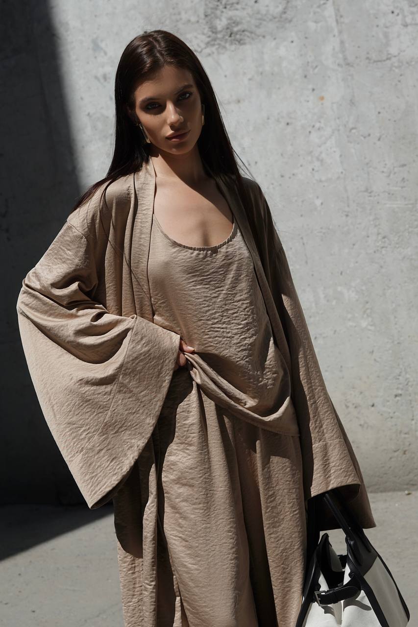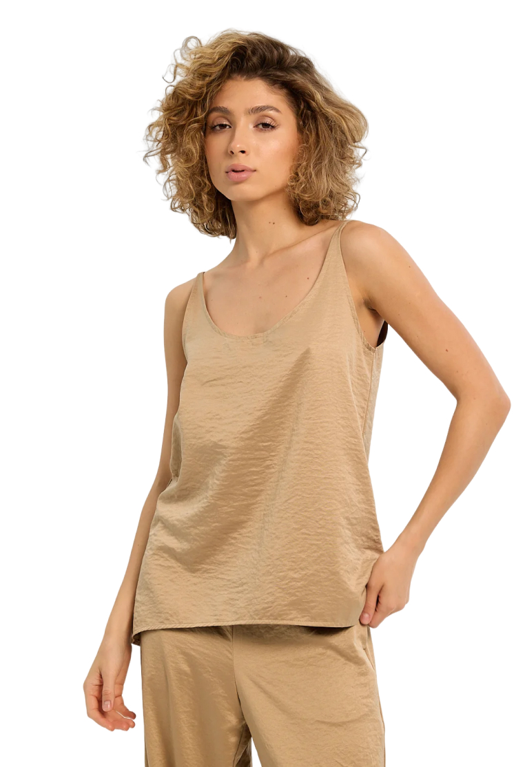 Выполненный из струящегося, летящего полотна «мокрый шелк» с высоким содержанием вискозы, топ становится оптимальным для жаркого лета. Так же станет прекрасной базой под любой жакет на более прохладную погоду.