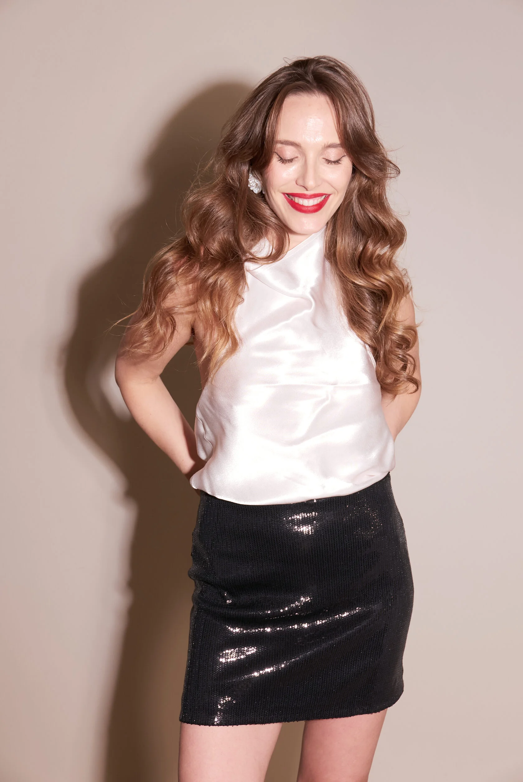 Топ из Итальяского атласа. Красиво подчеркивает грудь засчет плотного прилегания, а также сужения бретелей в зоне лифа. Ткань дышит, немного тянется, имеет красивый сдержанный блеск. Рекомендуем брать в комплекте с юбкой, но также роскошно будет смотреться и с брюками засчет необычной формы...