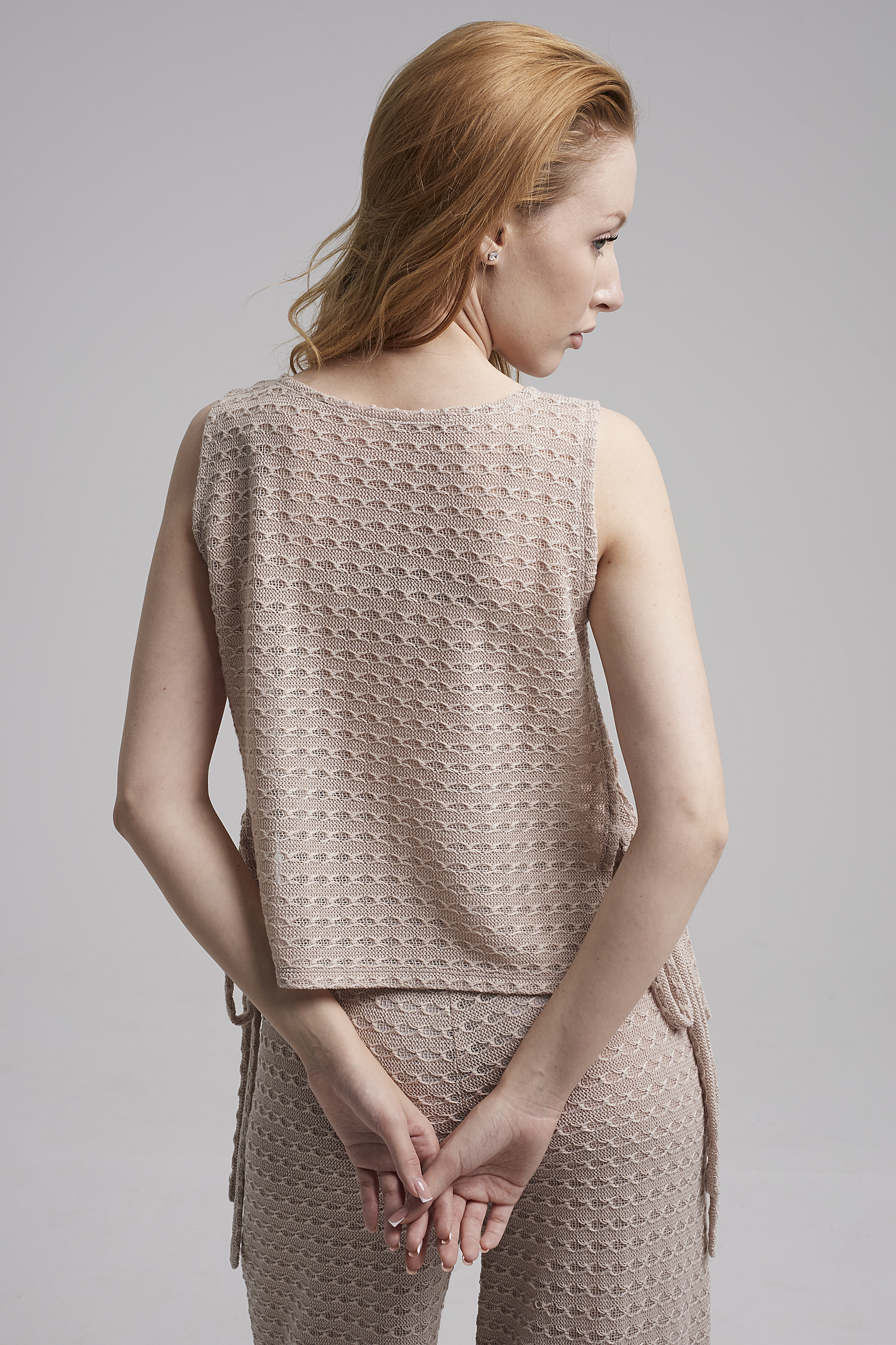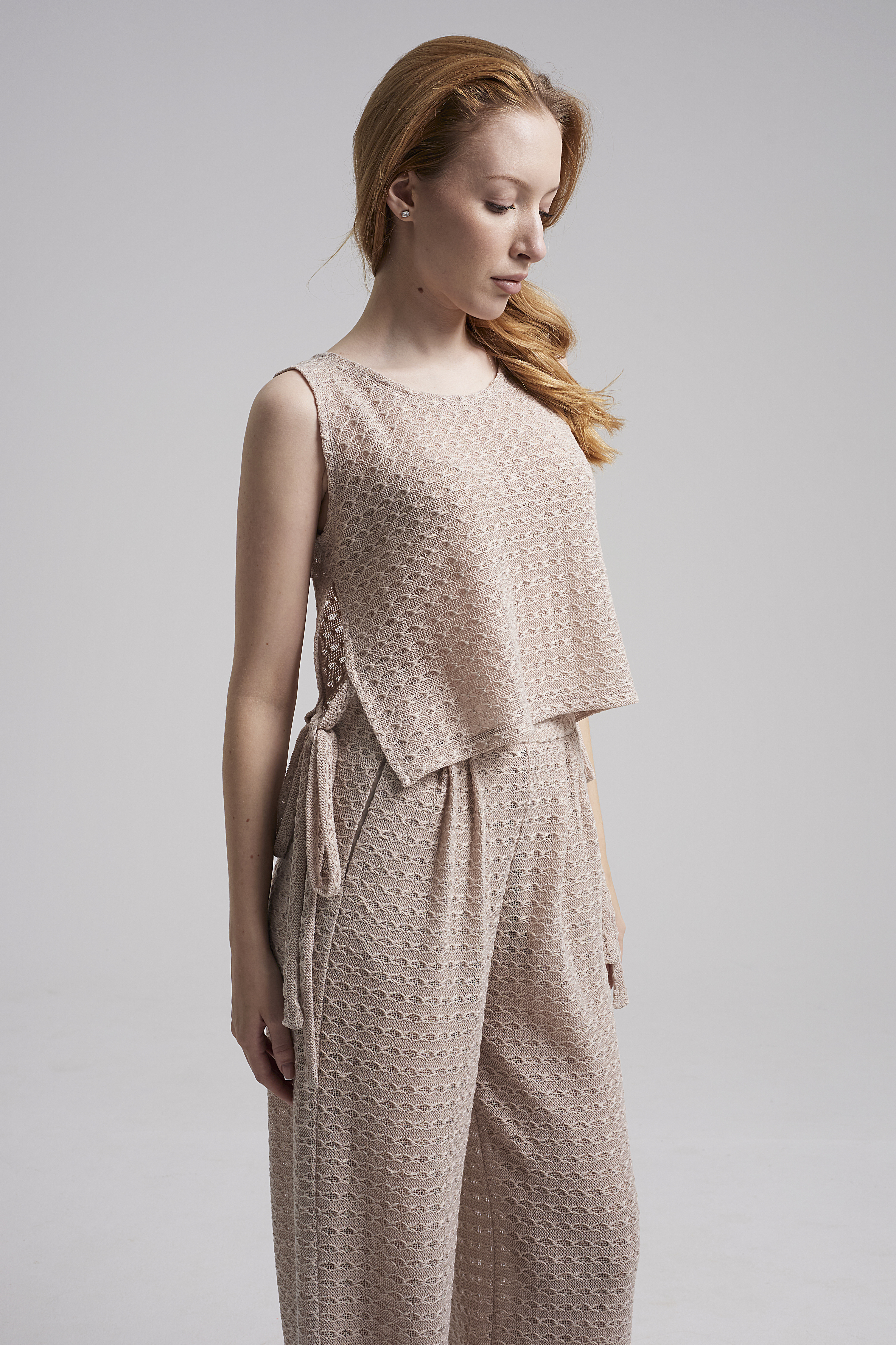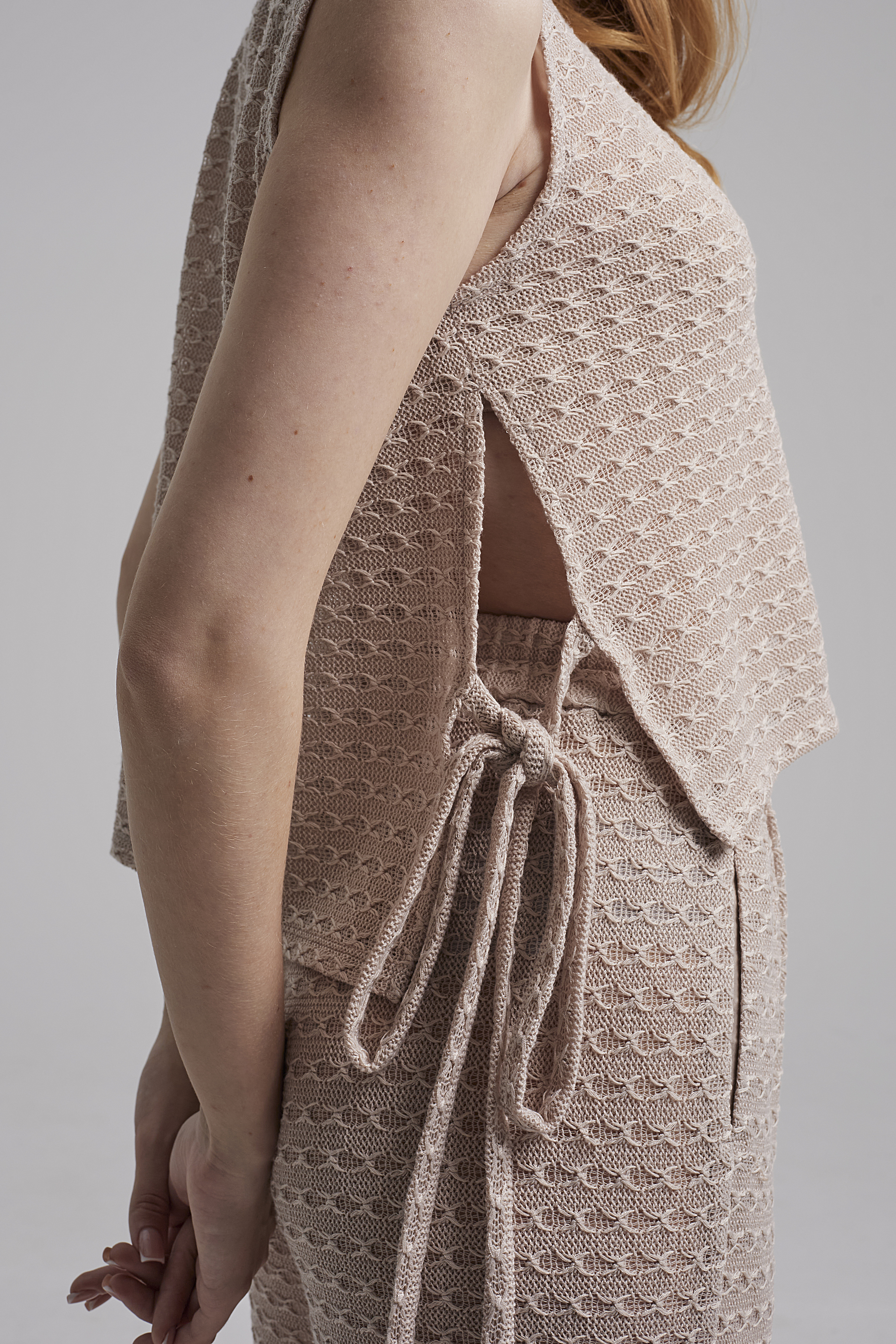 Топ из воздушной ажурной ткани оттенка крем-брюле с кокетливыми завязками по бокам.
