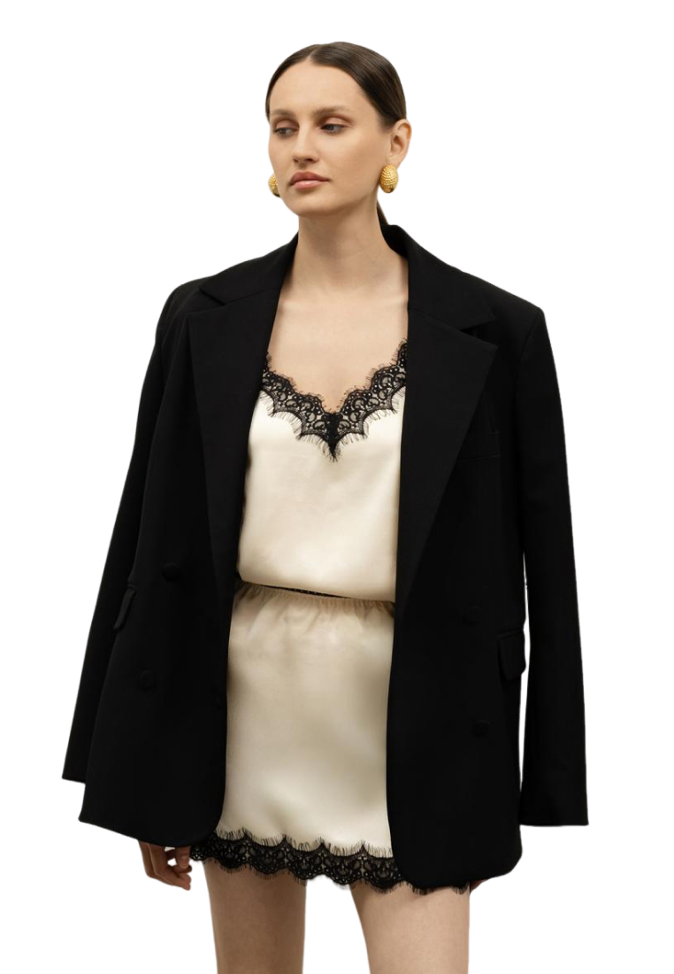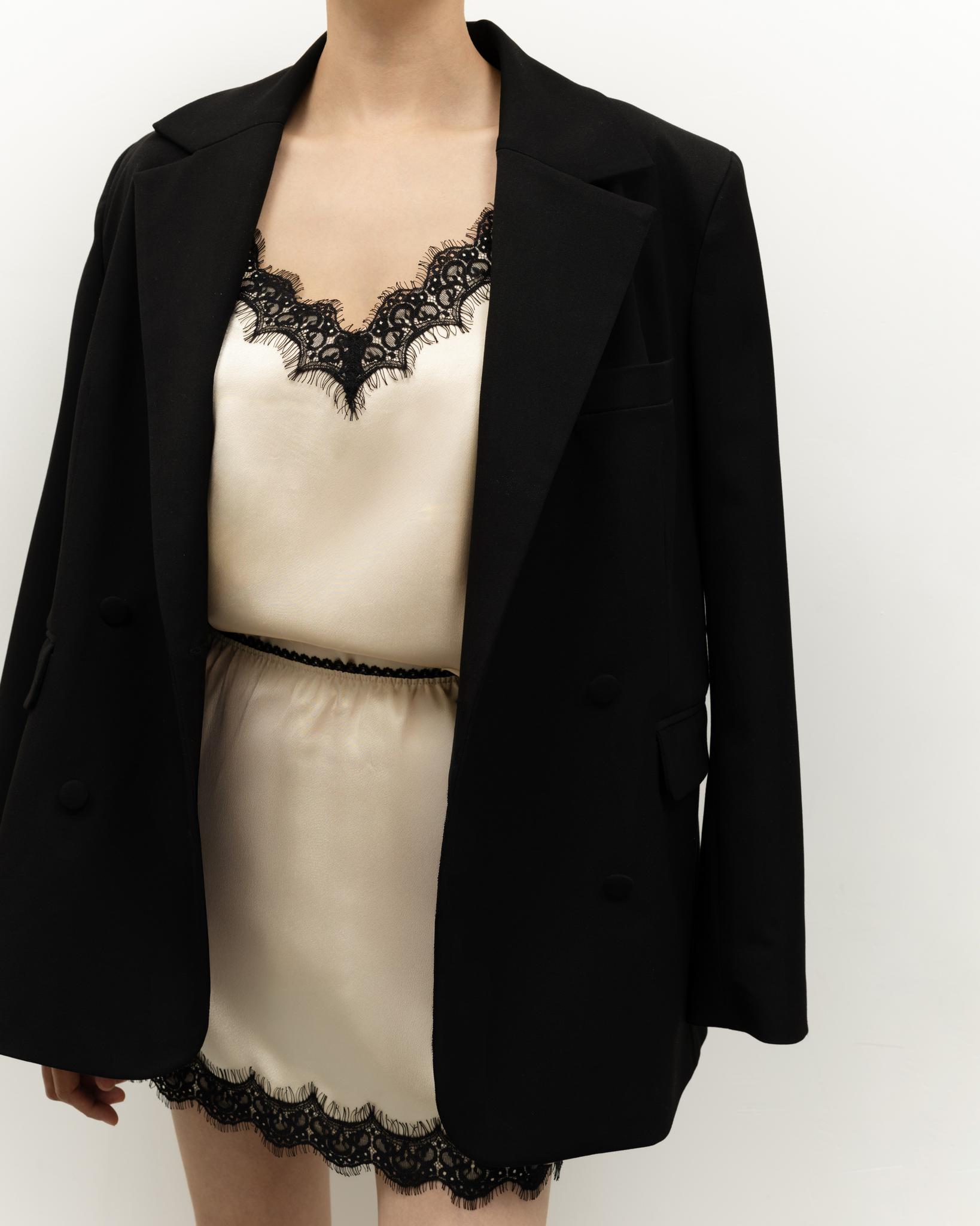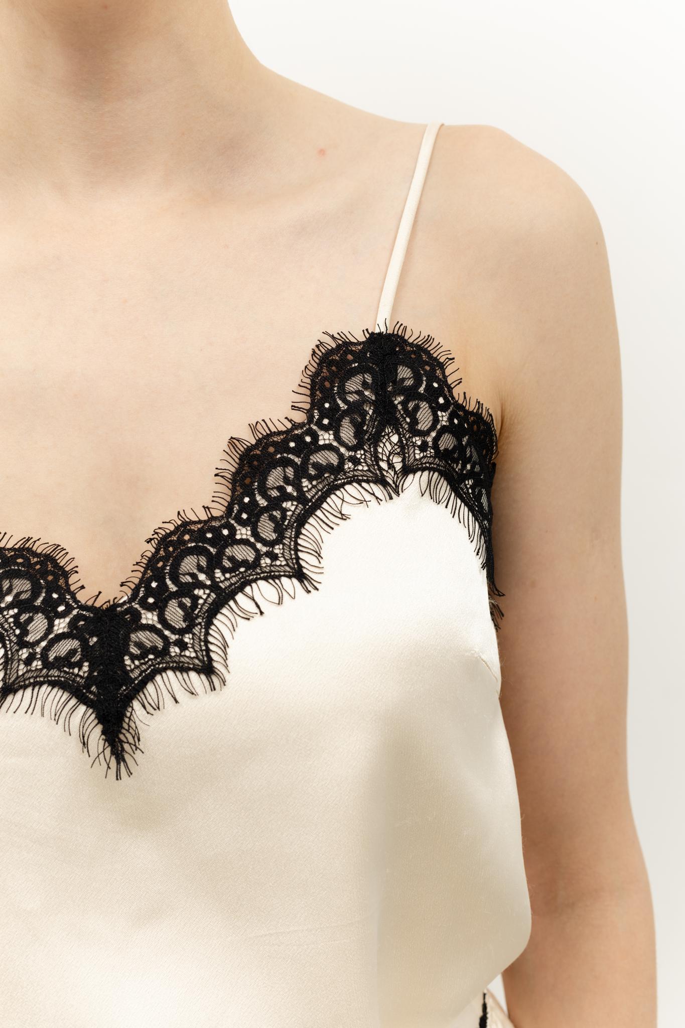 Топ на тонких бретелях из вареного атласа, дополненный изящным кружевом.