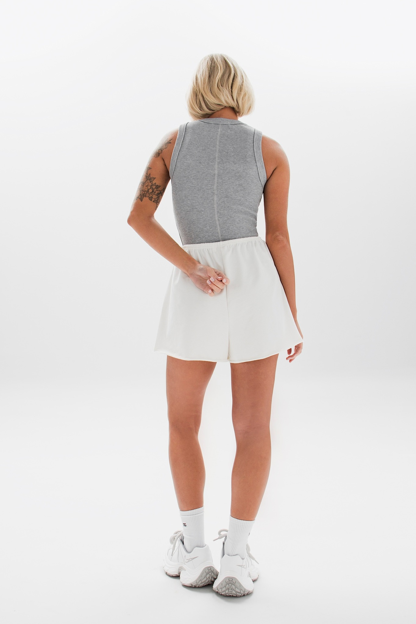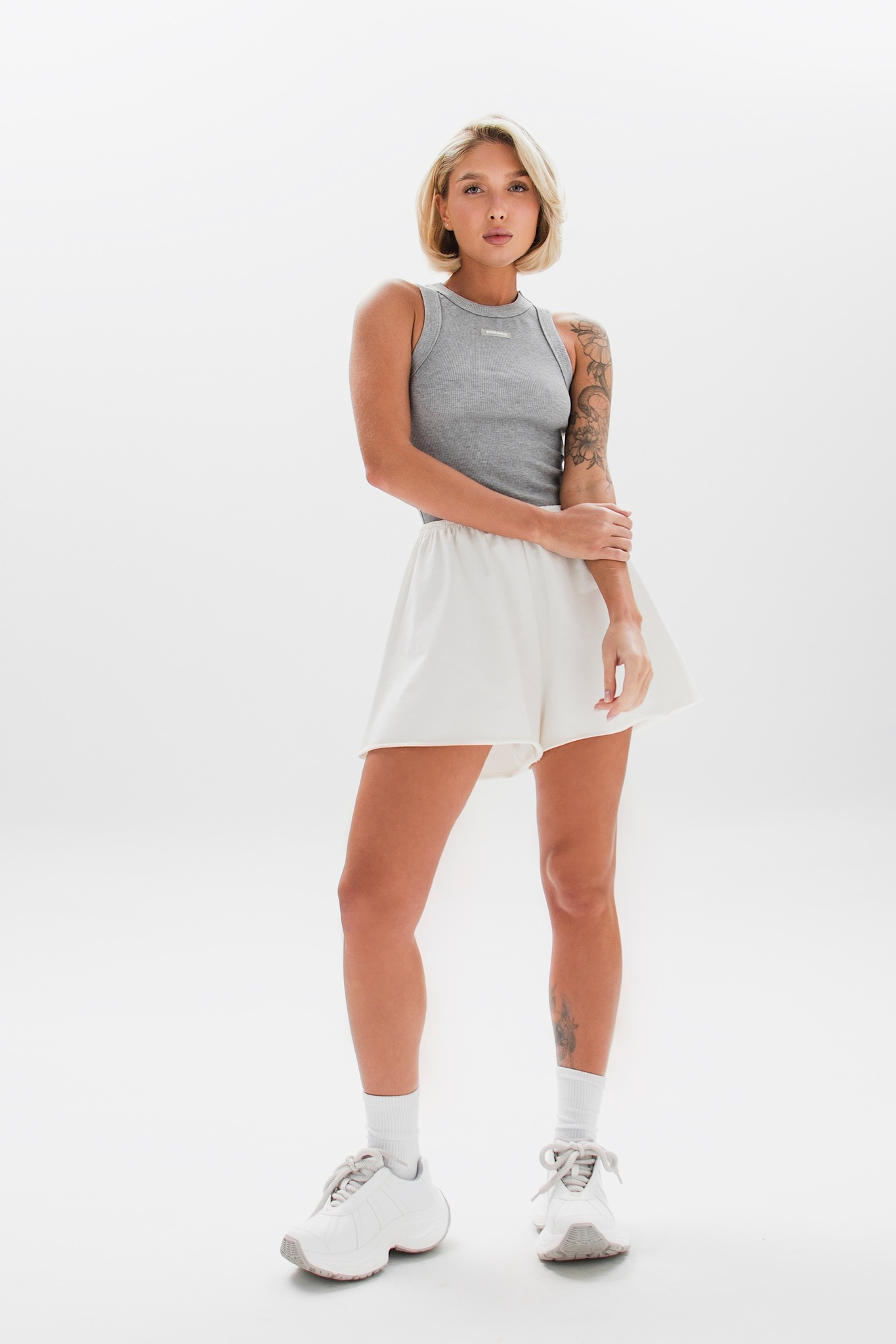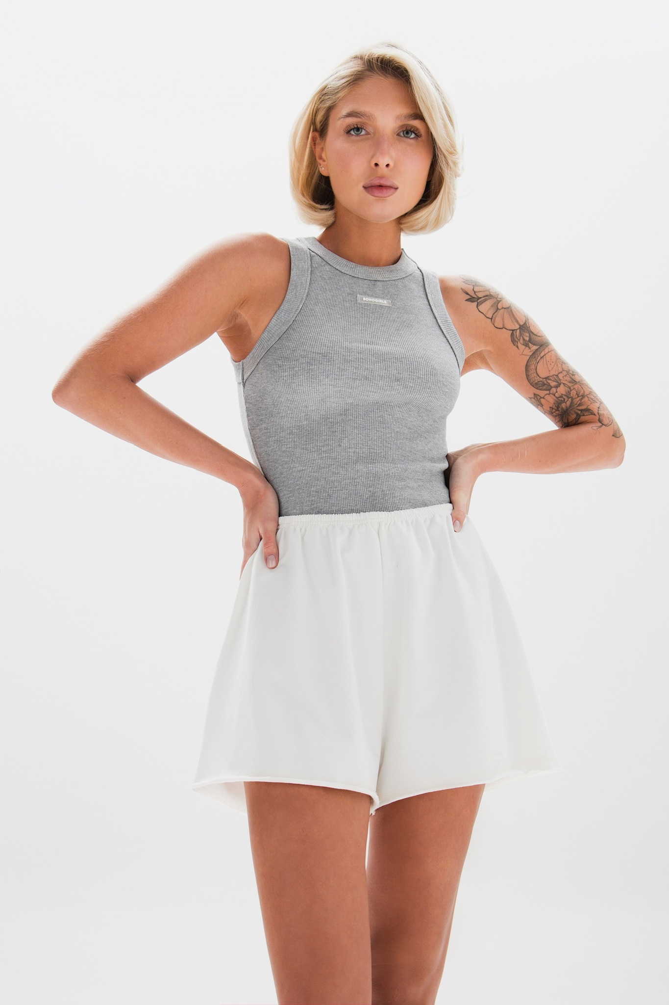 Топ в рубчик с акцентной широкой окантовкой. Эластичный материал комфортно прилегает к телу. Спереди - декоративная бирка с логотипом.