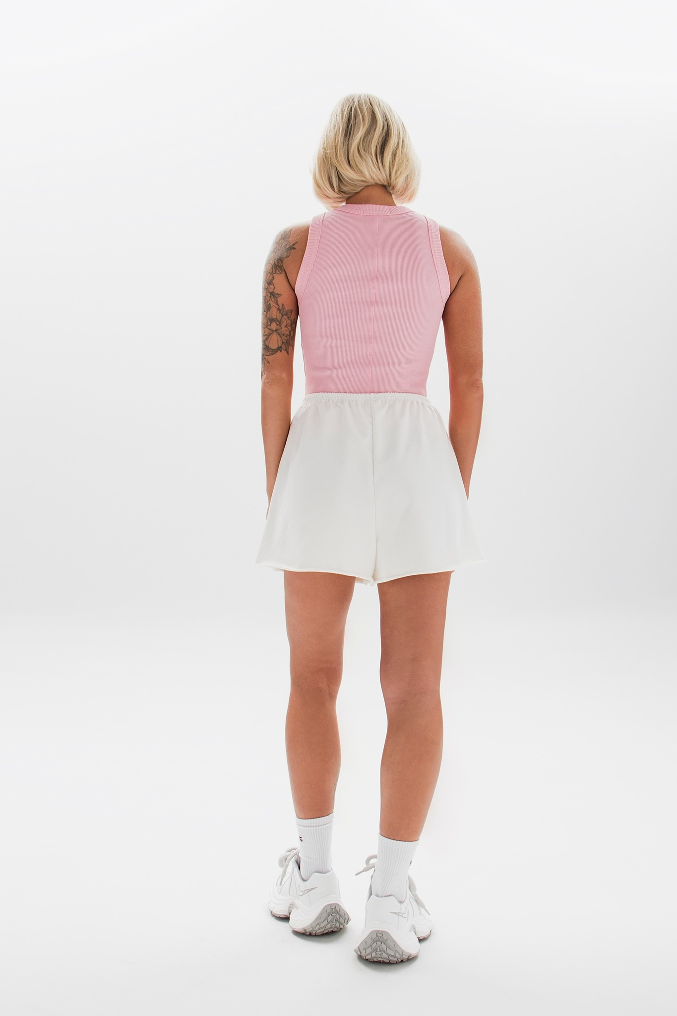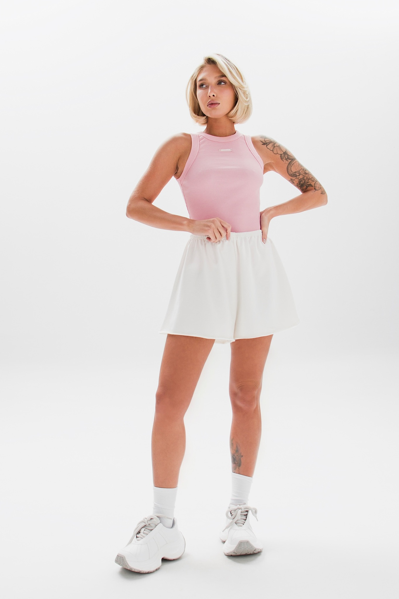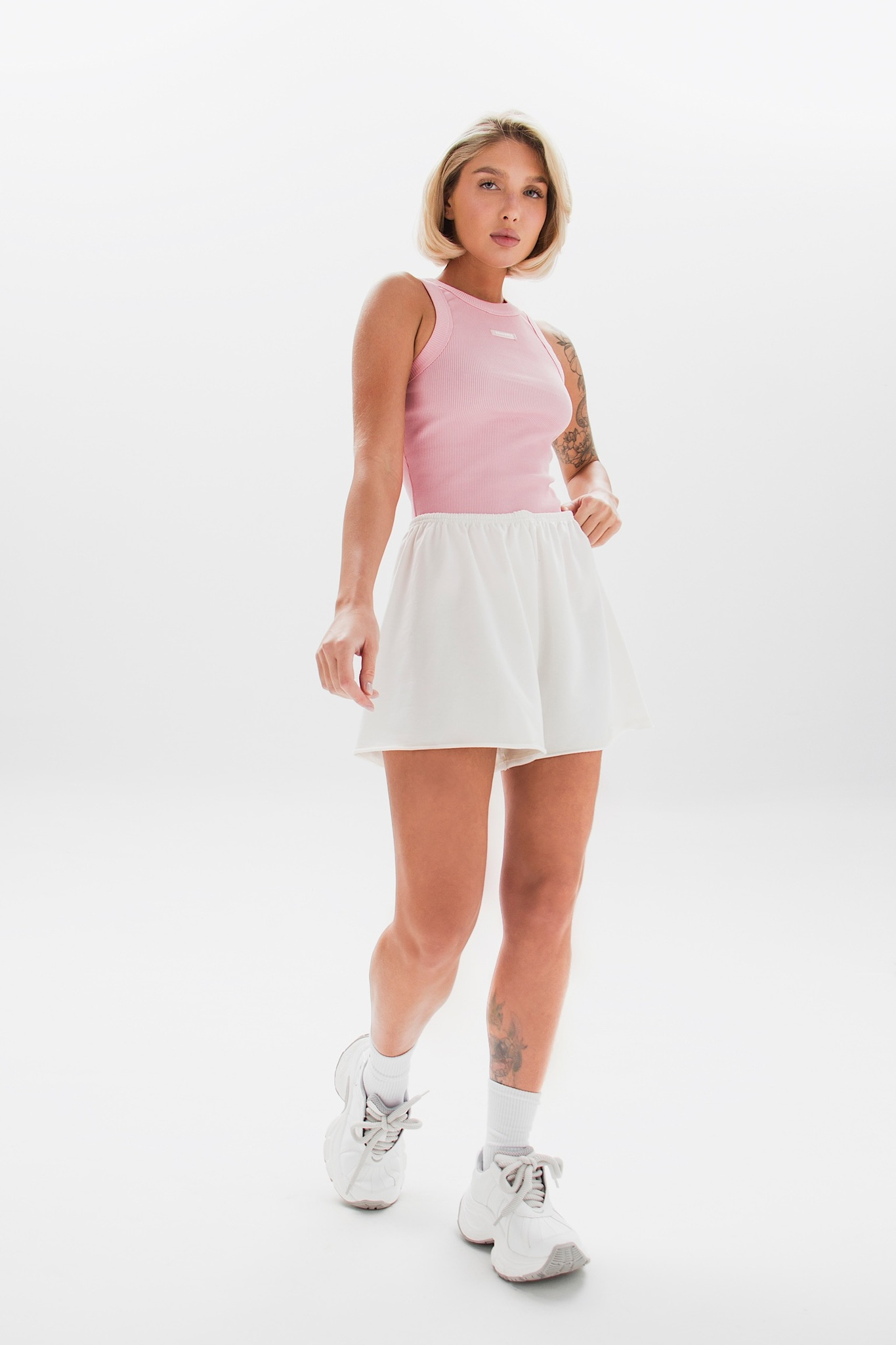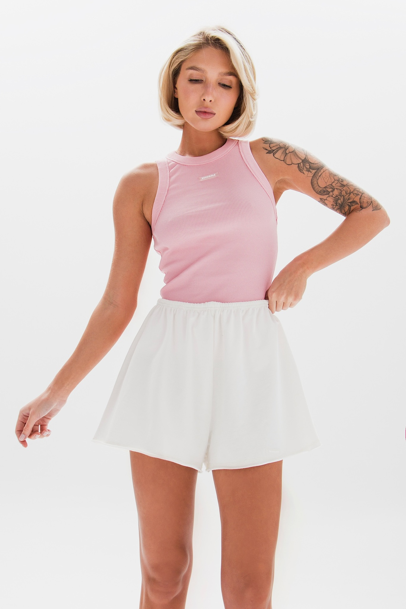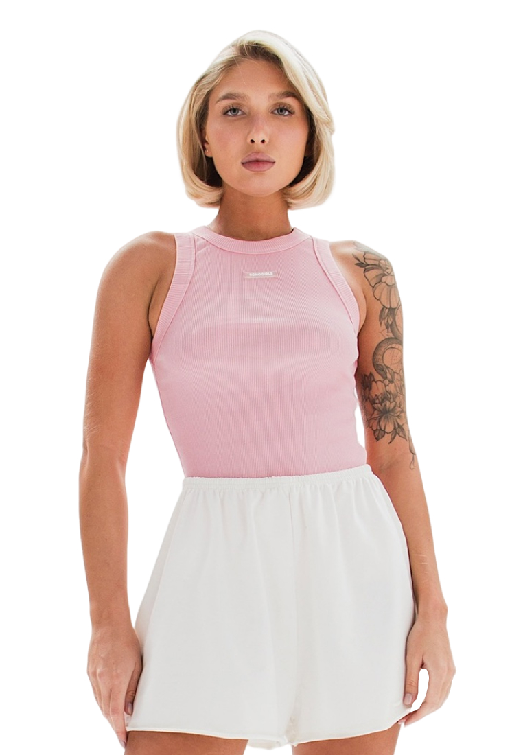 Топ в рубчик с акцентной широкой окантовкой. Эластичный материал комфортно прилегает к телу. Спереди - декоративная бирка с логотипом.