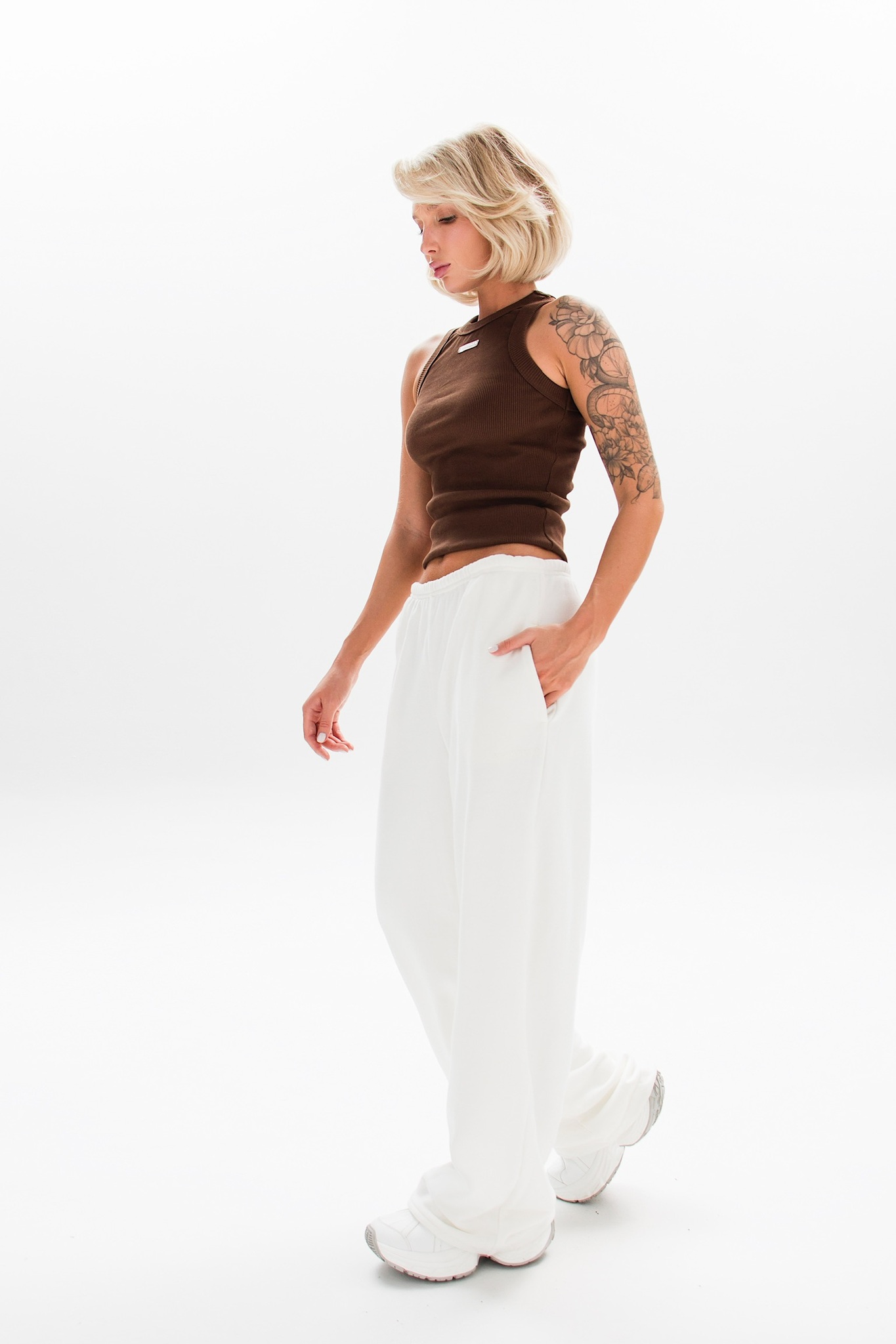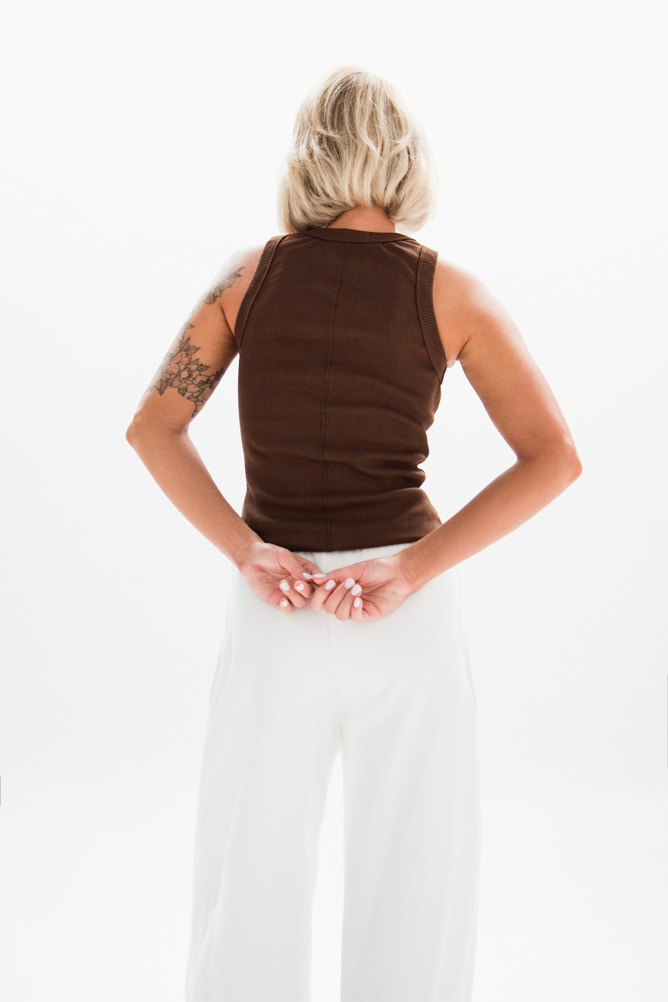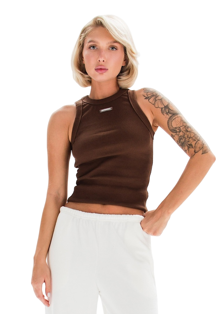 Топ в рубчик с акцентной широкой окантовкой. Эластичный материал комфортно прилегает к телу. Спереди - декоративная бирка с логотипом.