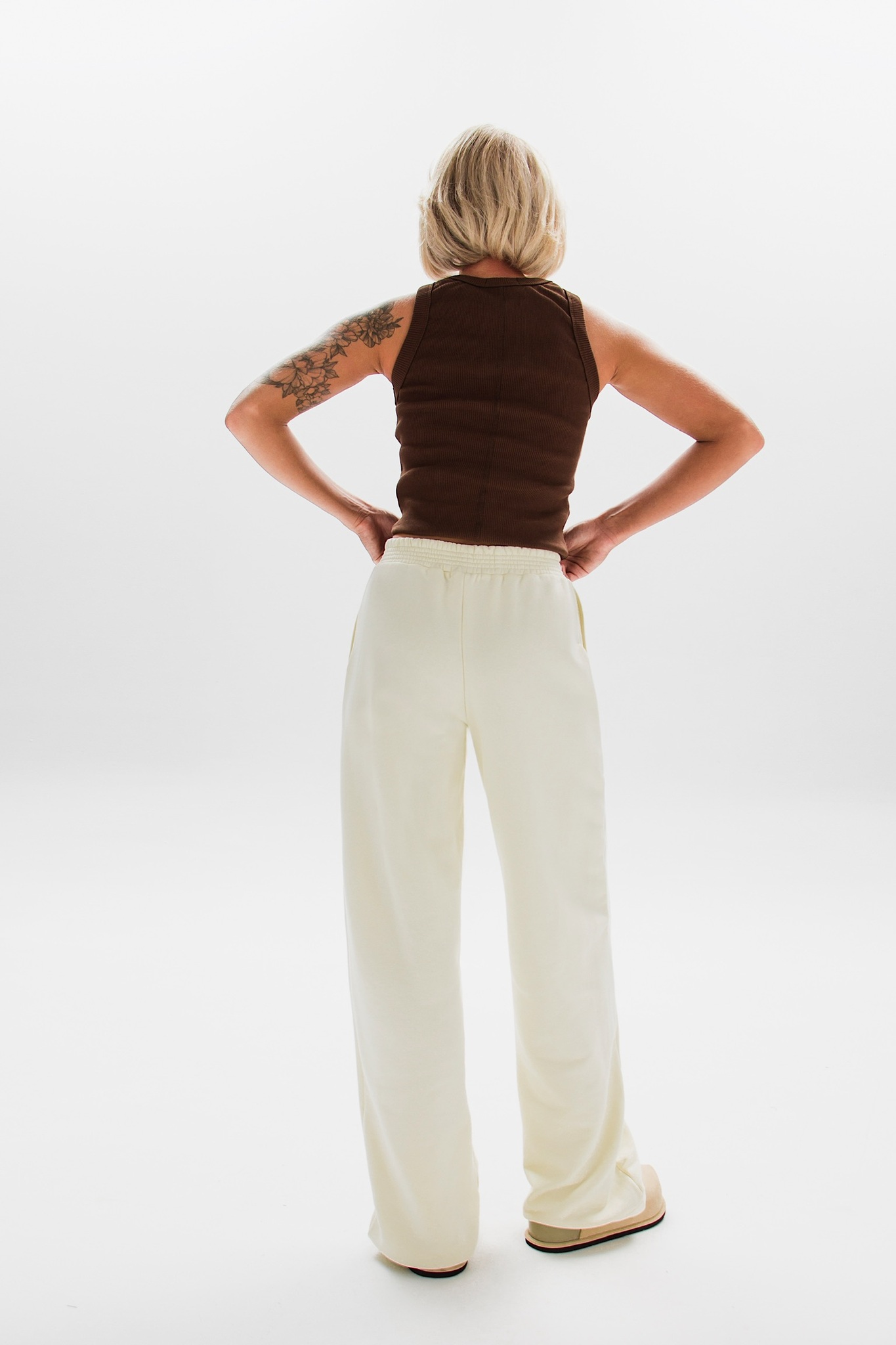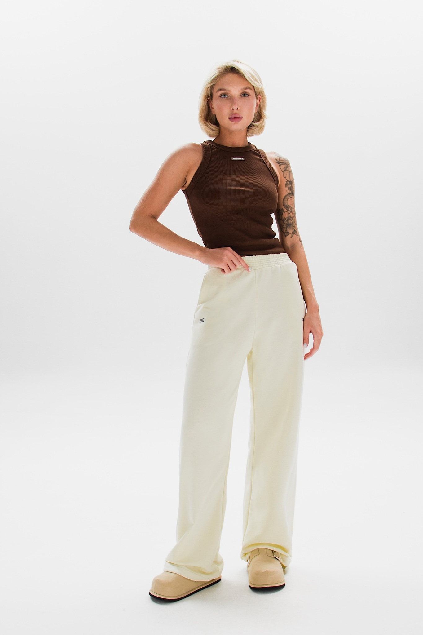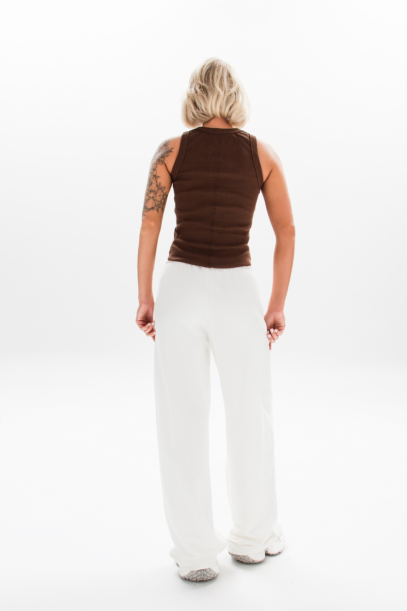 Топ в рубчик с акцентной широкой окантовкой. Эластичный материал комфортно прилегает к телу. Спереди - декоративная бирка с логотипом.