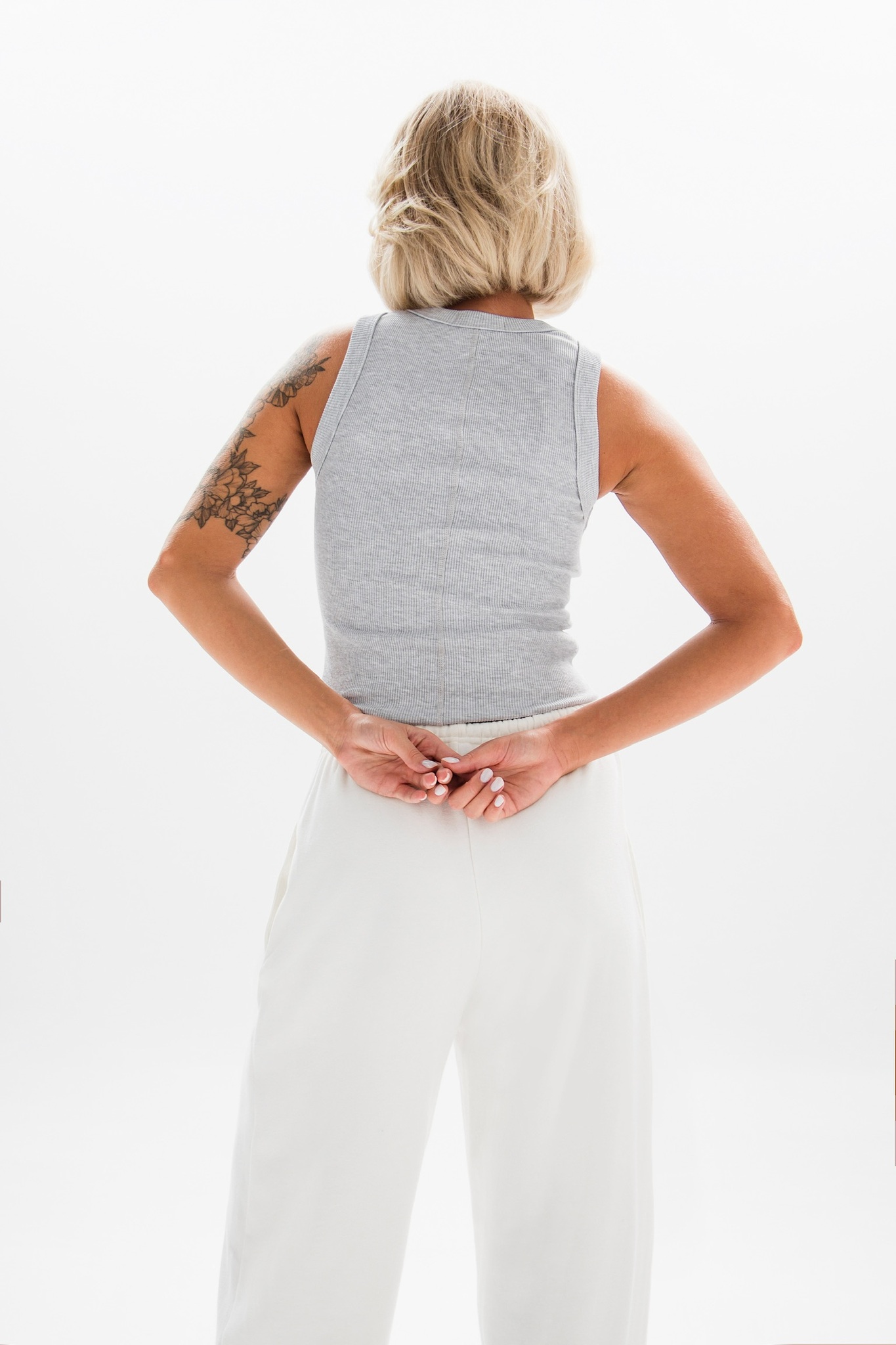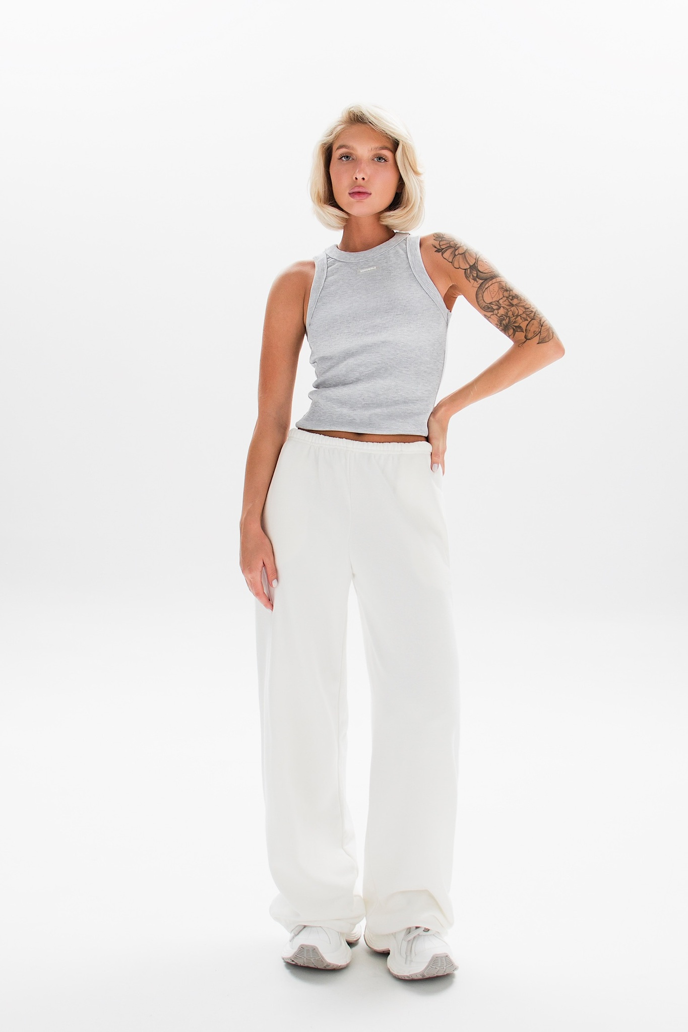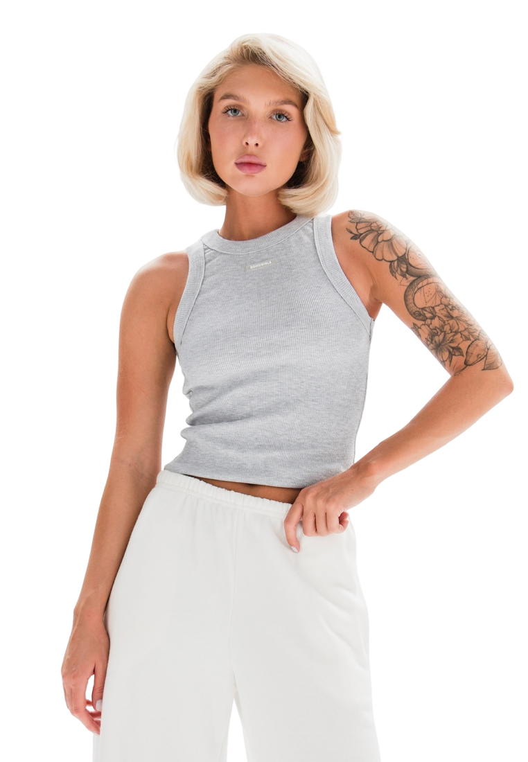 Топ в рубчик с акцентной широкой окантовкой. Эластичный материал комфортно прилегает к телу. Спереди - декоративная бирка с логотипом.