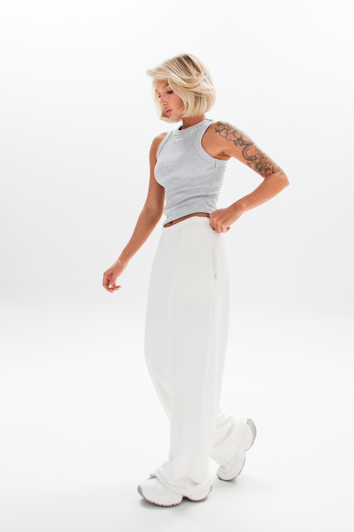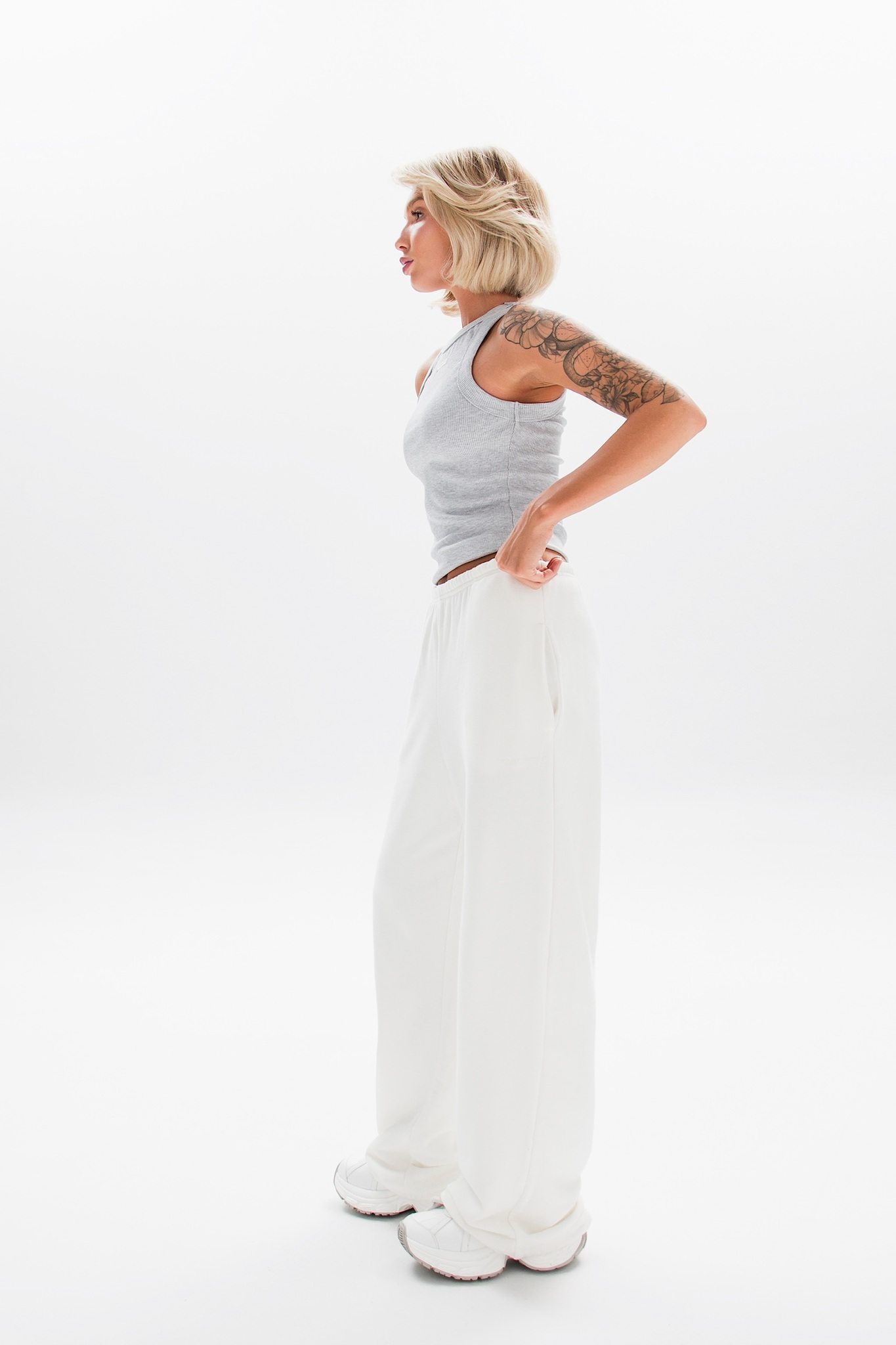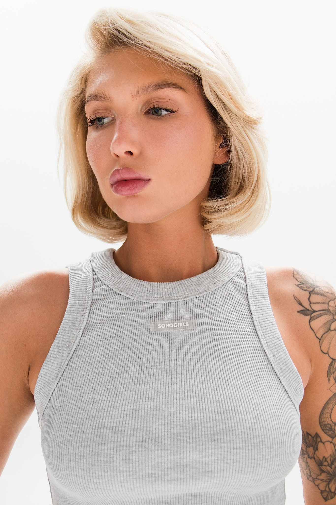 Топ в рубчик с акцентной широкой окантовкой. Эластичный материал комфортно прилегает к телу. Спереди - декоративная бирка с логотипом.