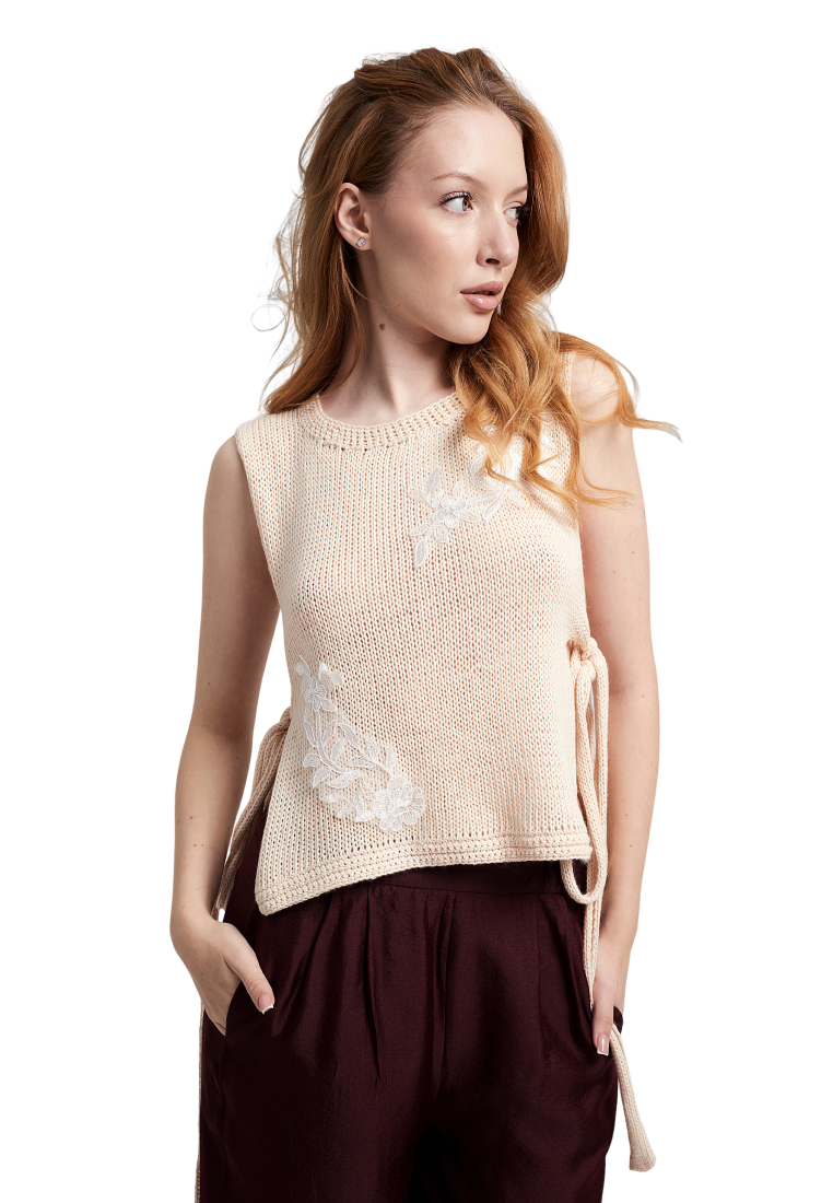 Топ выполнен из аккуратной пряжи бежевого цвета с нежными кружевными вставками, как вспененное молоко в чашке любимого латте.