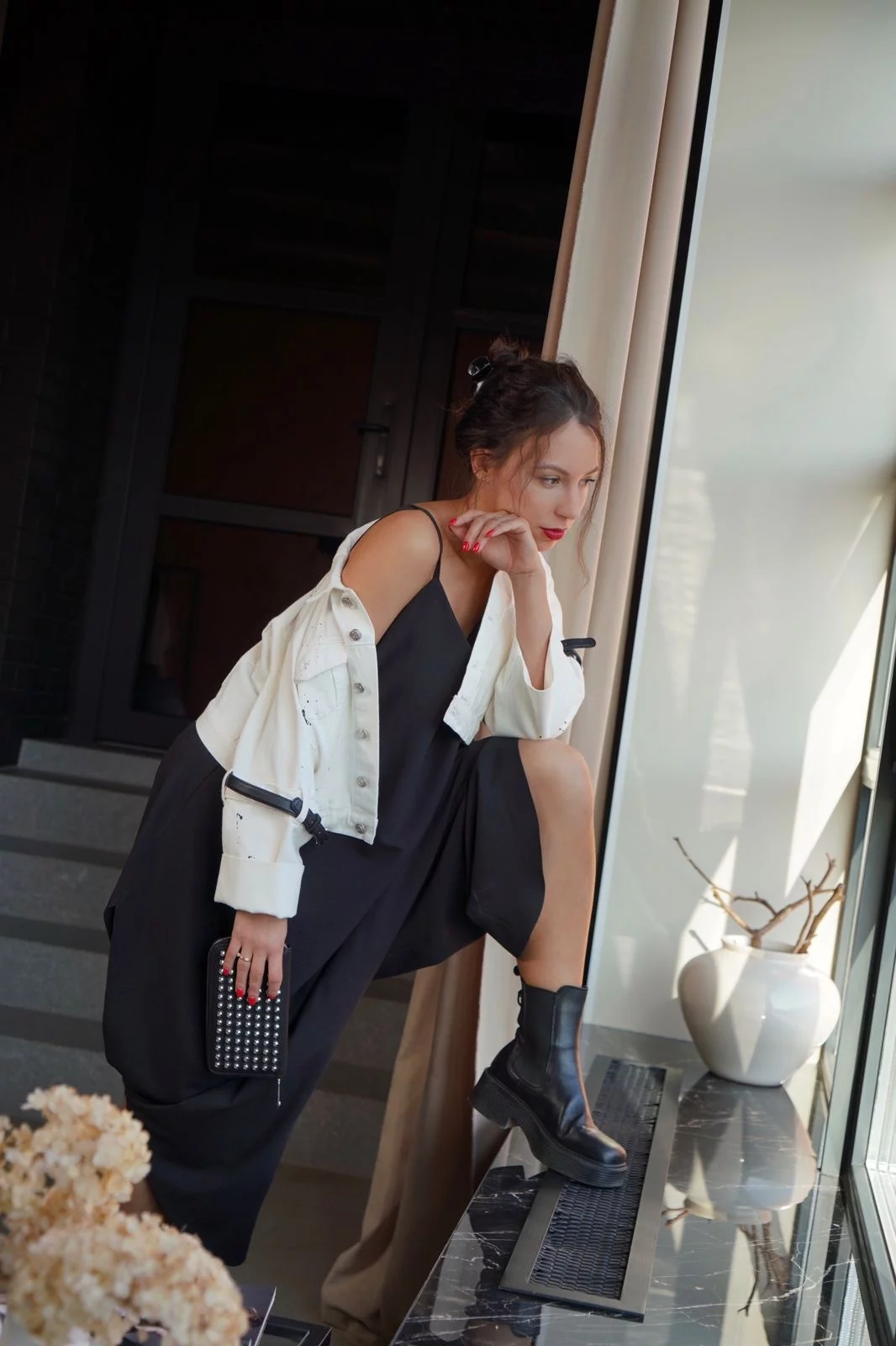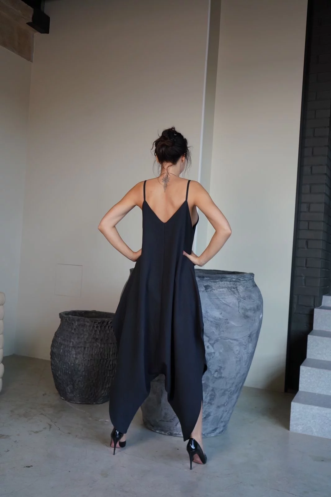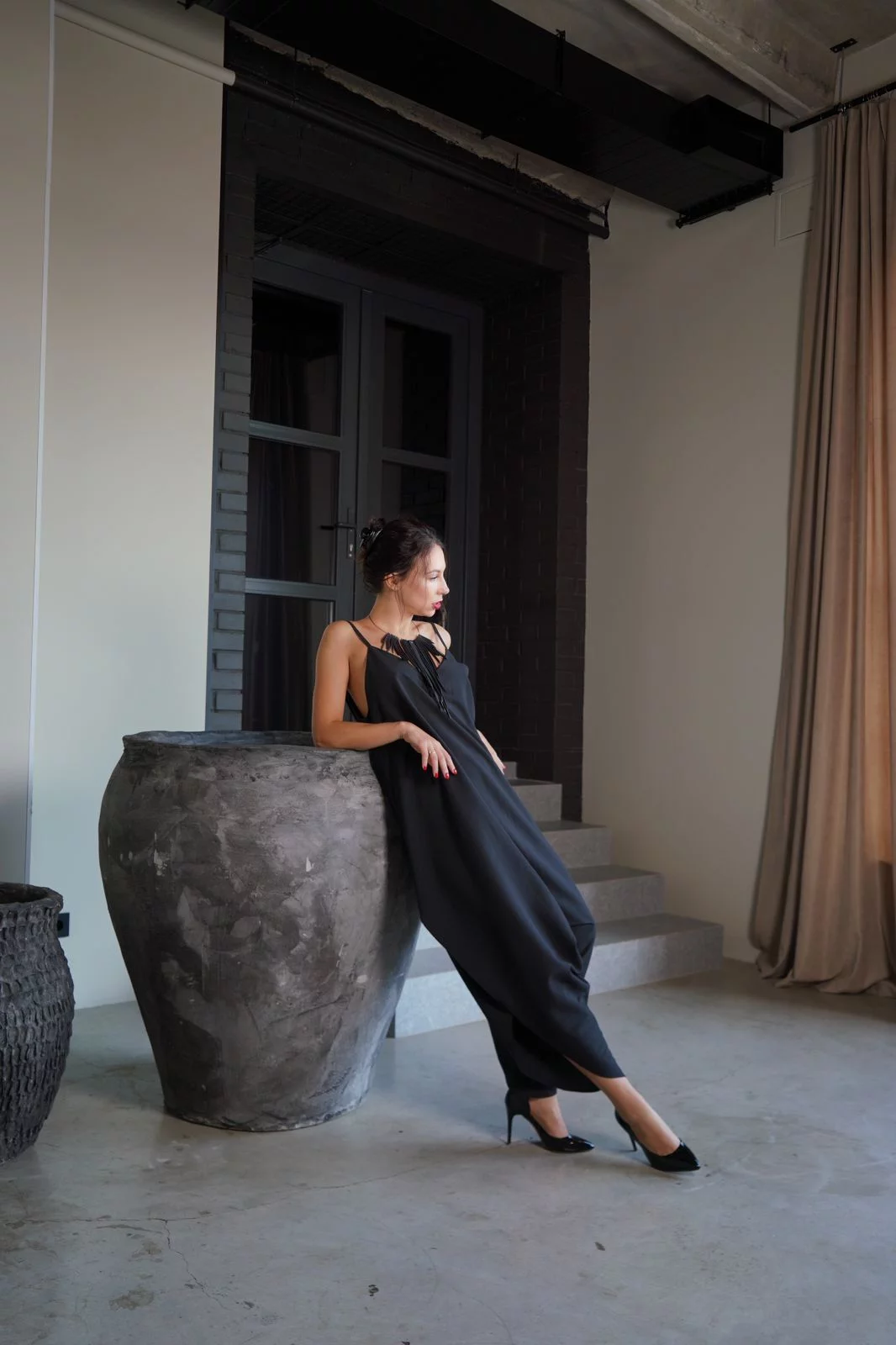 Комбинезон на бретелях свободного кроя в форме кокона. Имеет легкую, но плотную текстуру, благодаря чему практически не мнется. Комфортен для ежедневных прогулок летом, но так же станет альтернативой вечернему платью. Несмотря на его замысловатый дизайн, комбинезон станет любимой базой в вашем гардеробе. Стоит верно дополнить его обувью и деталями образа, чтобы он вписался в совершенно любой стиль.