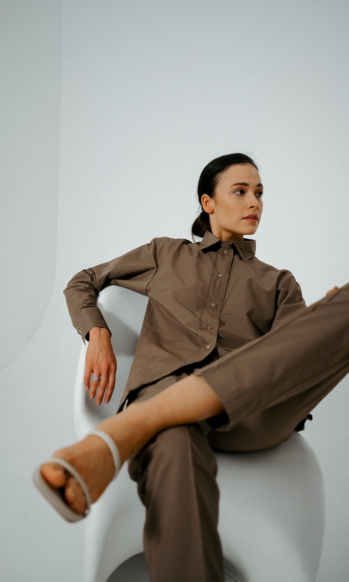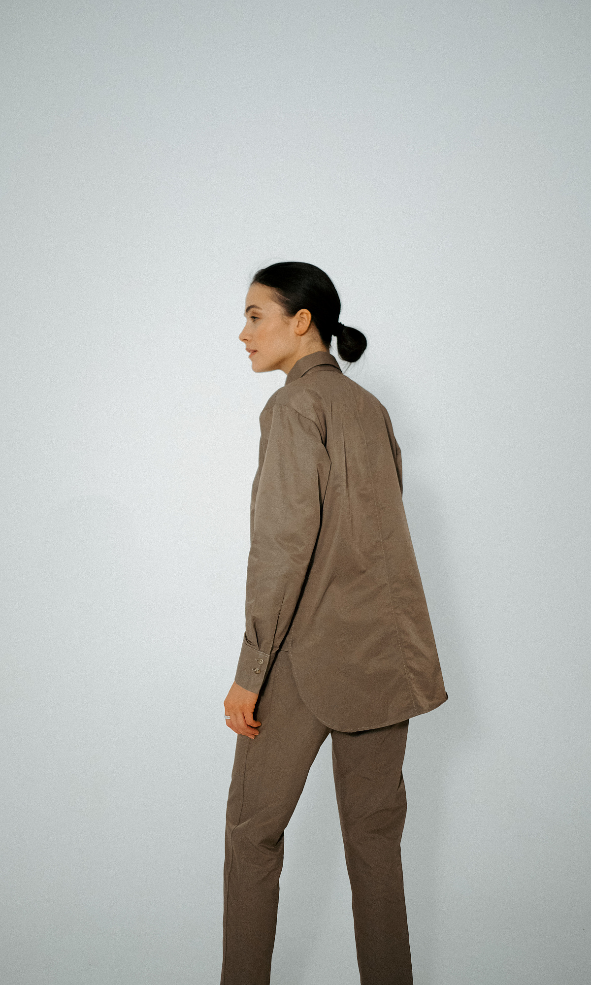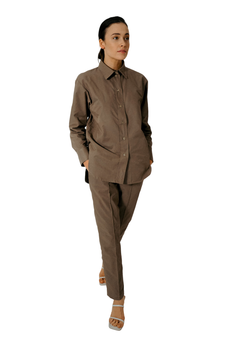 Костюм в окрасе бронзовый хаки выполнен из итальянской ткани- хлопка саржевого переплетения, благодаря которому меньше сминается. Удлиненная рубашка прямого силуэта с застежкой на пуговицы. Классический, мягкий воротник. Брюки прямые с отстроченными стрелками. Пояс эластичный, карманы в боковых швах и лампасы из основной ткани.