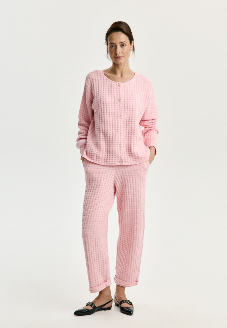 Вязаный костюм из сертифицированного хлопка Soft Touch.Кардиган с округлым воротом с мягкой фактурной вязкой застёгивается на пуговицы. Брюки прямого силуэта с удобными боковыми карманами. Легкий и дышащий материал.
