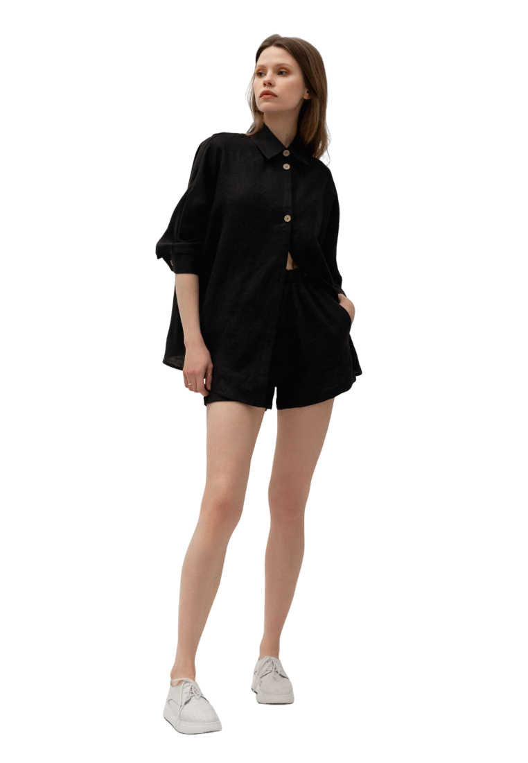 Комплект из 100 % льна из льняных шорт и рубашки c крылышками на спинке, который акцентирует внимание на Вас - Вы точно будете в центре внимания.