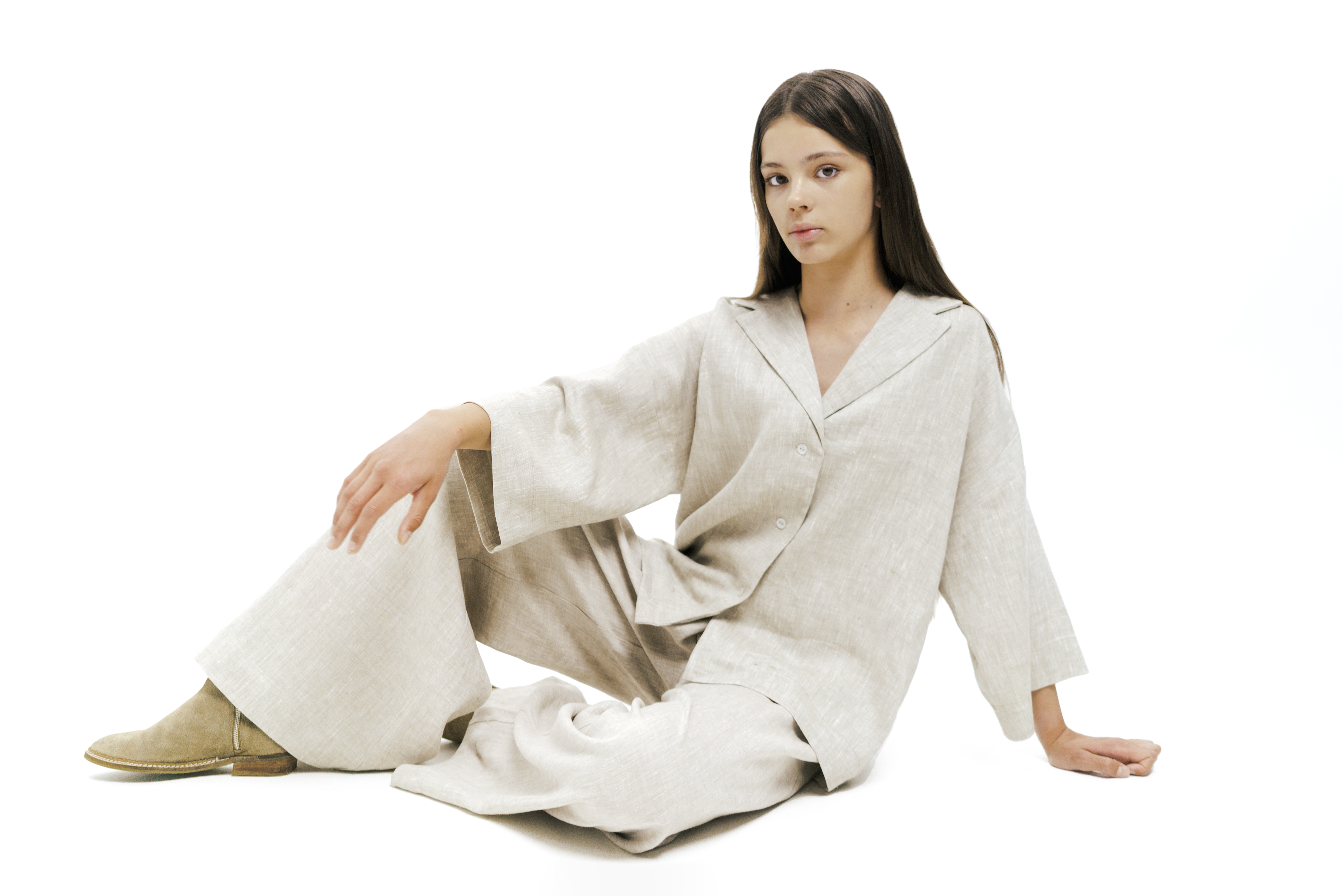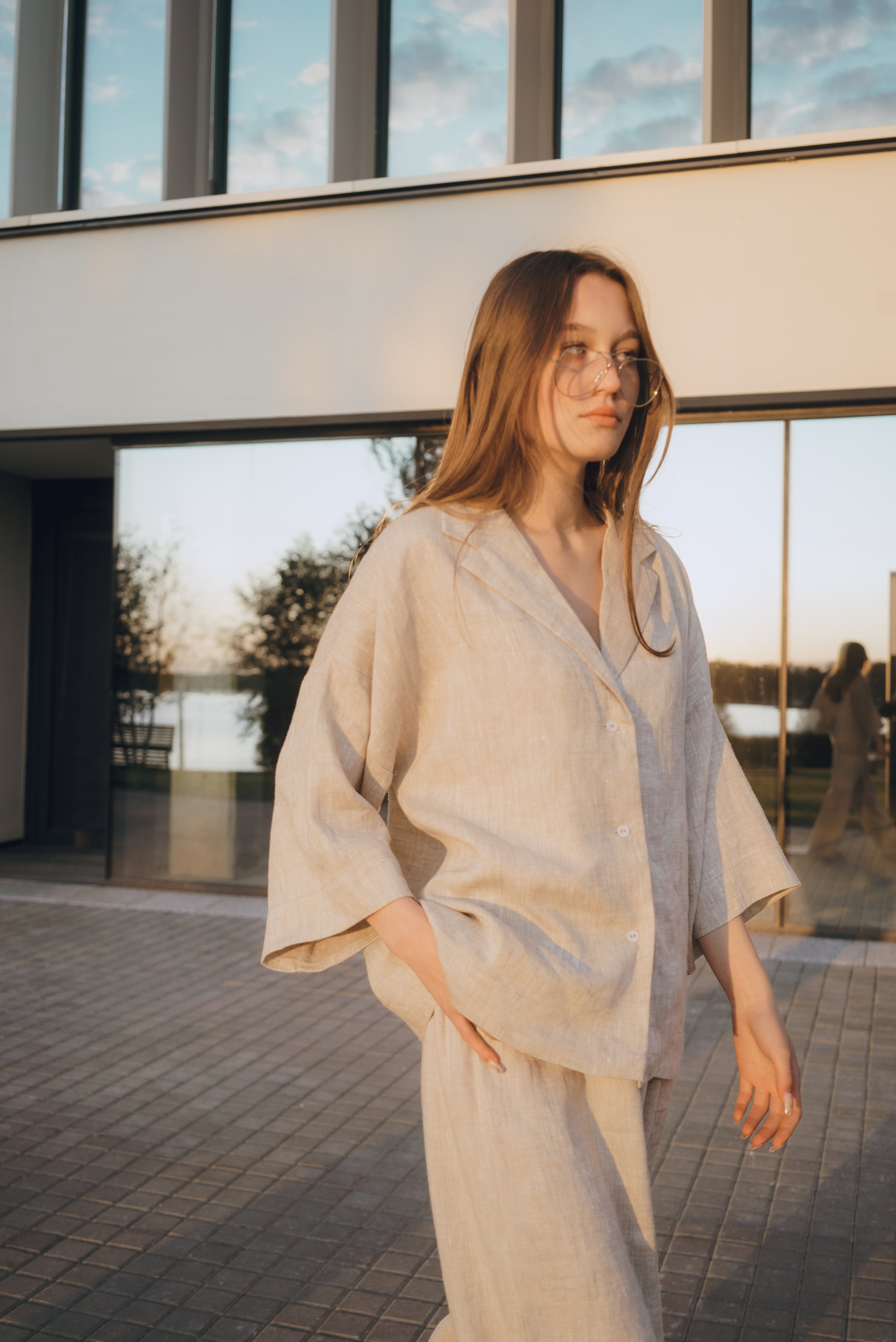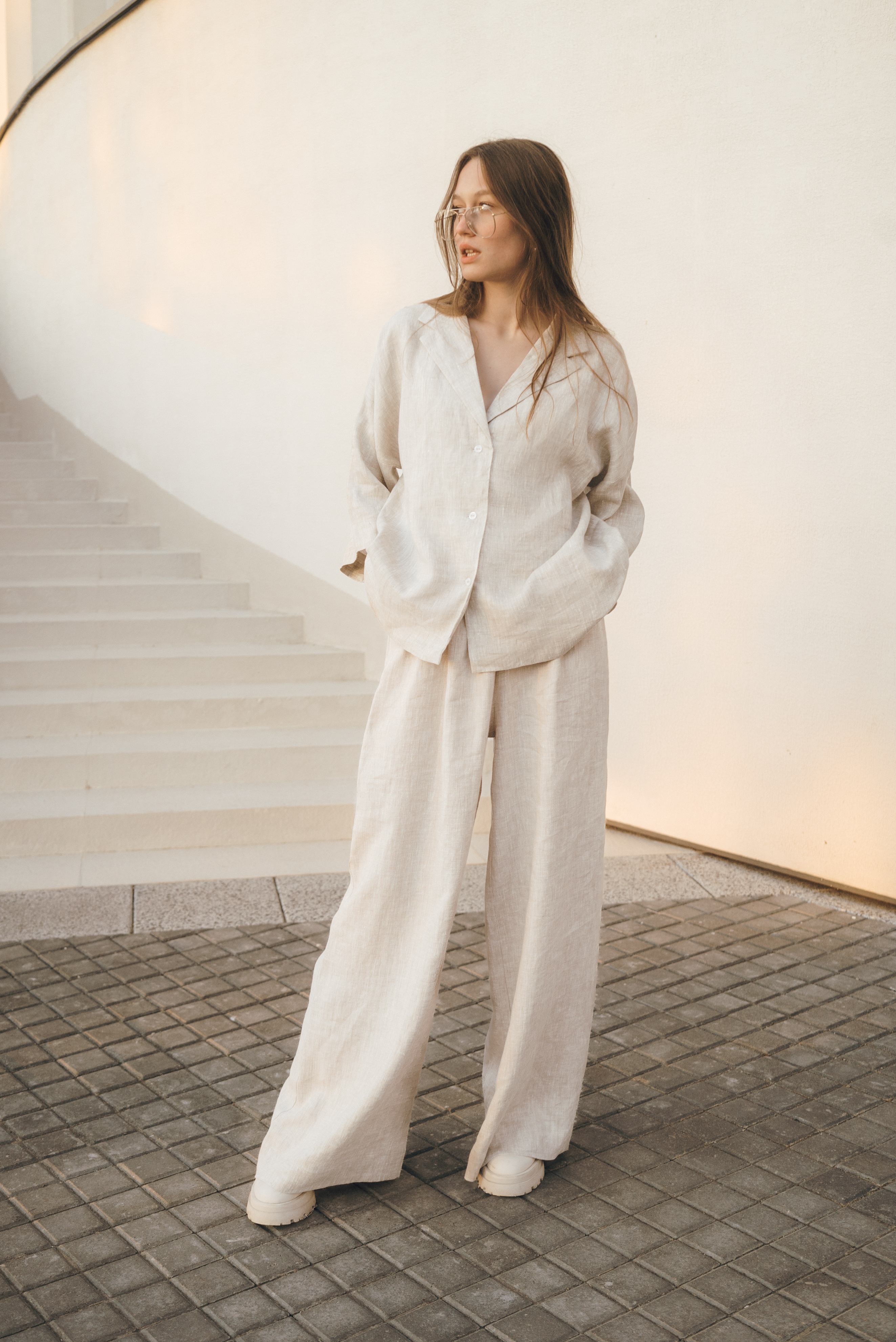 Расслабленный комплект для отдыха в вашем ритме. Свободная рубашка не сковывает движений, а эластичный пояс в брюках обеспечивает комфортную посадку на талии. Мы сшили костюм из дышащего льна — идеального материала для лета, и подчеркнули мягкость ткани с помощью тонкого канта.
