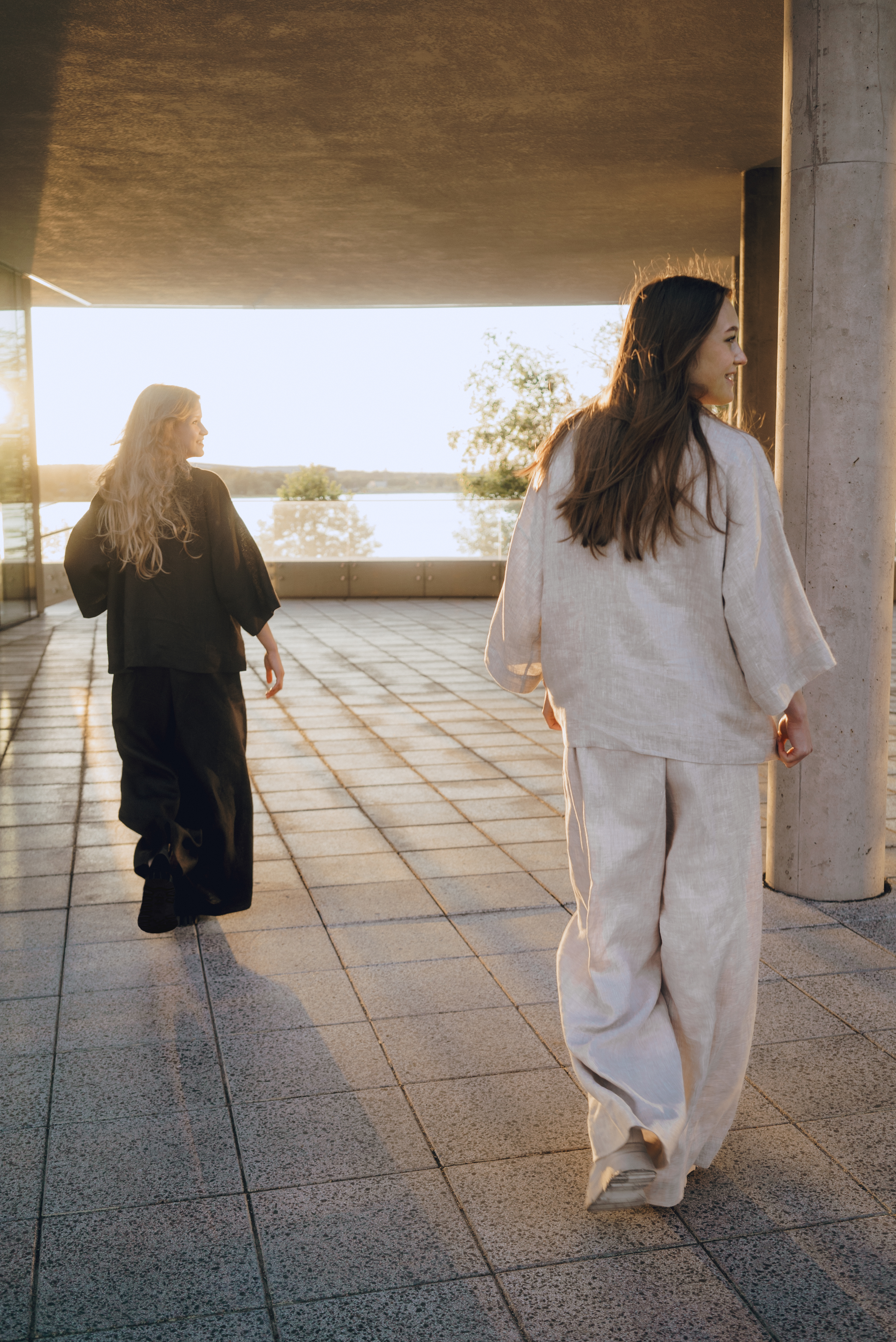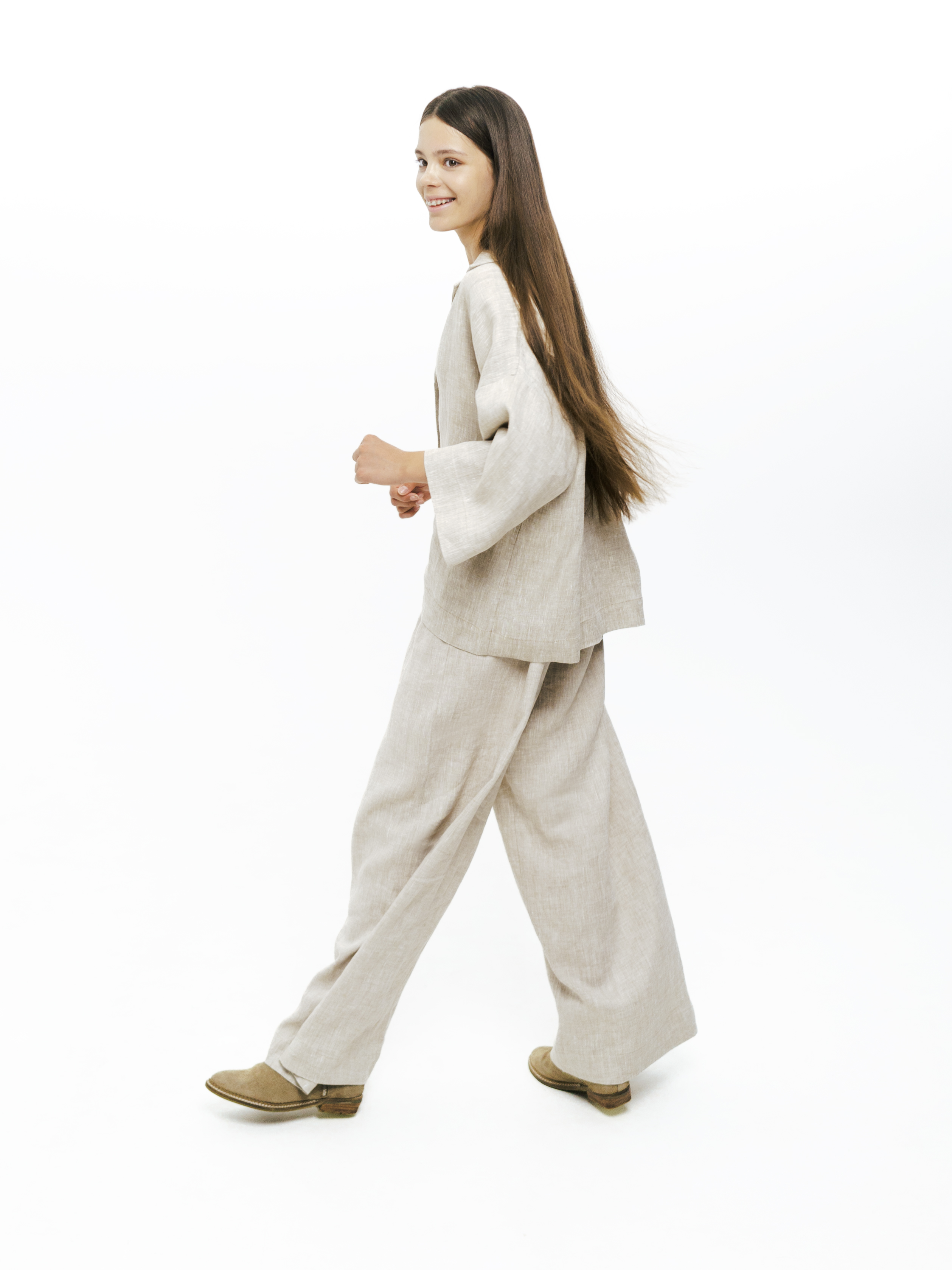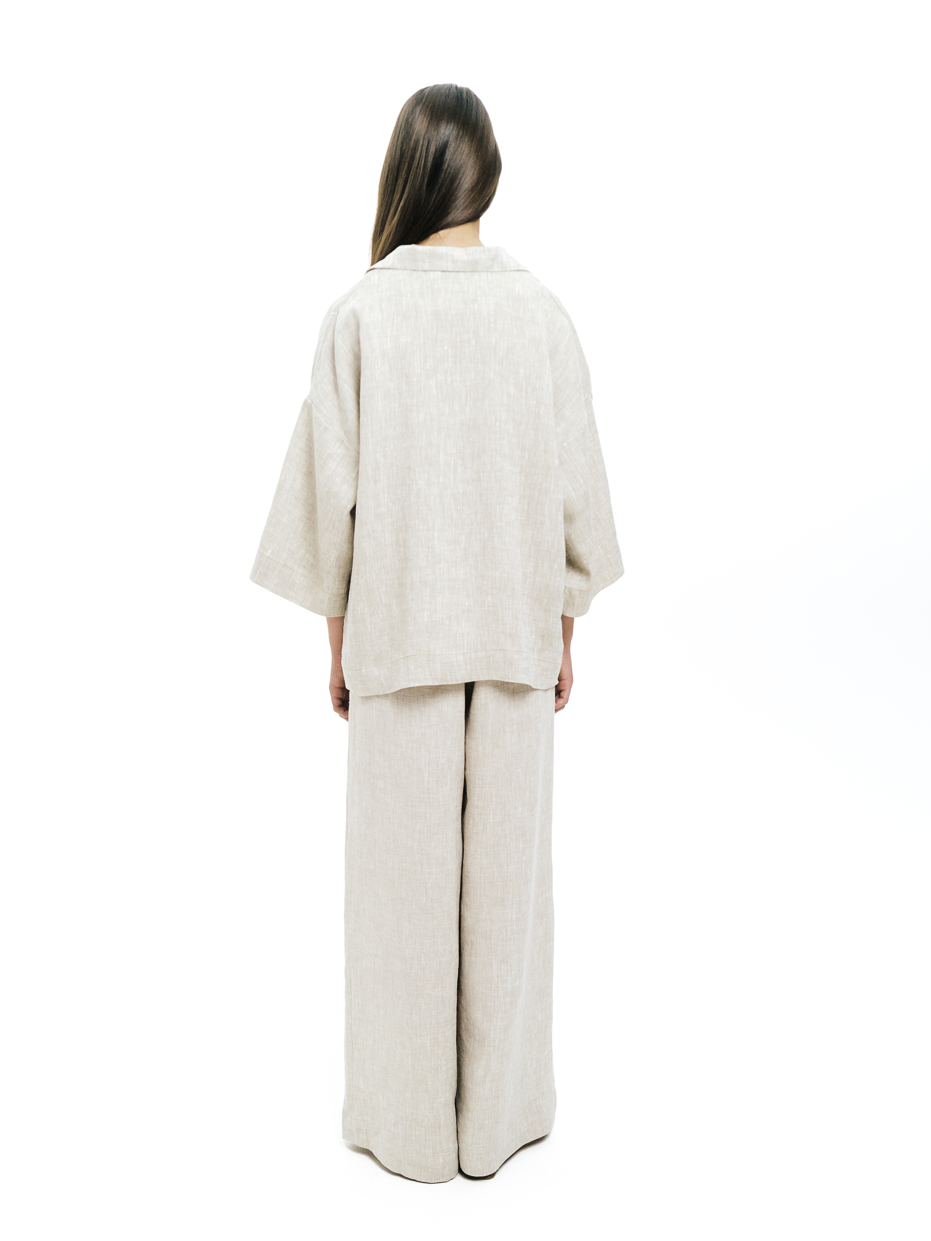 Расслабленный комплект для отдыха в вашем ритме. Свободная рубашка не сковывает движений, а эластичный пояс в брюках обеспечивает комфортную посадку на талии. Мы сшили костюм из дышащего льна — идеального материала для лета, и подчеркнули мягкость ткани с помощью тонкого канта.