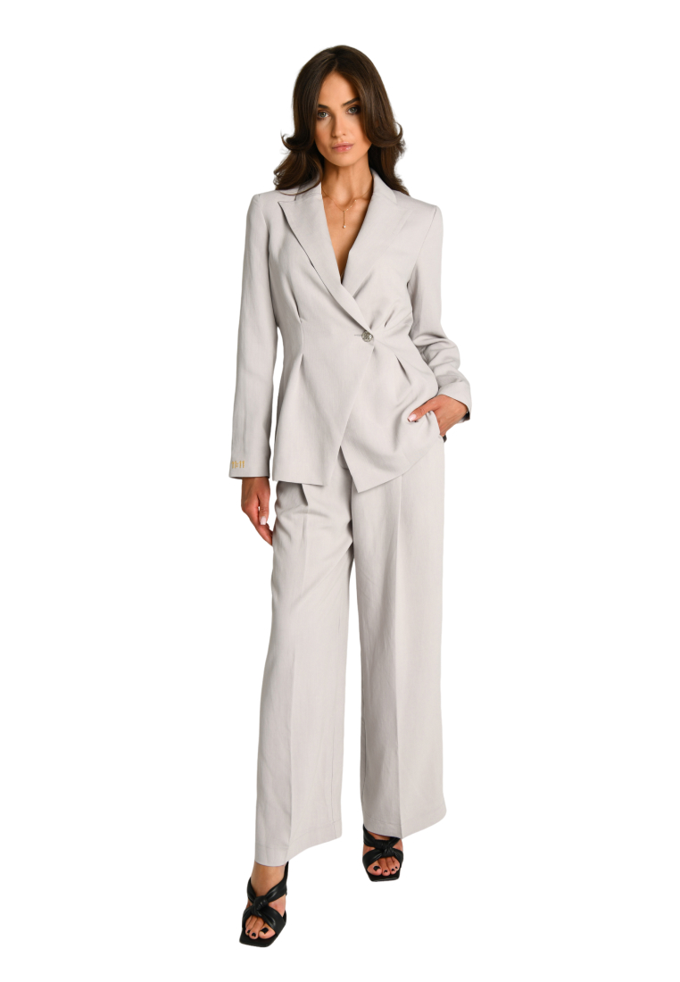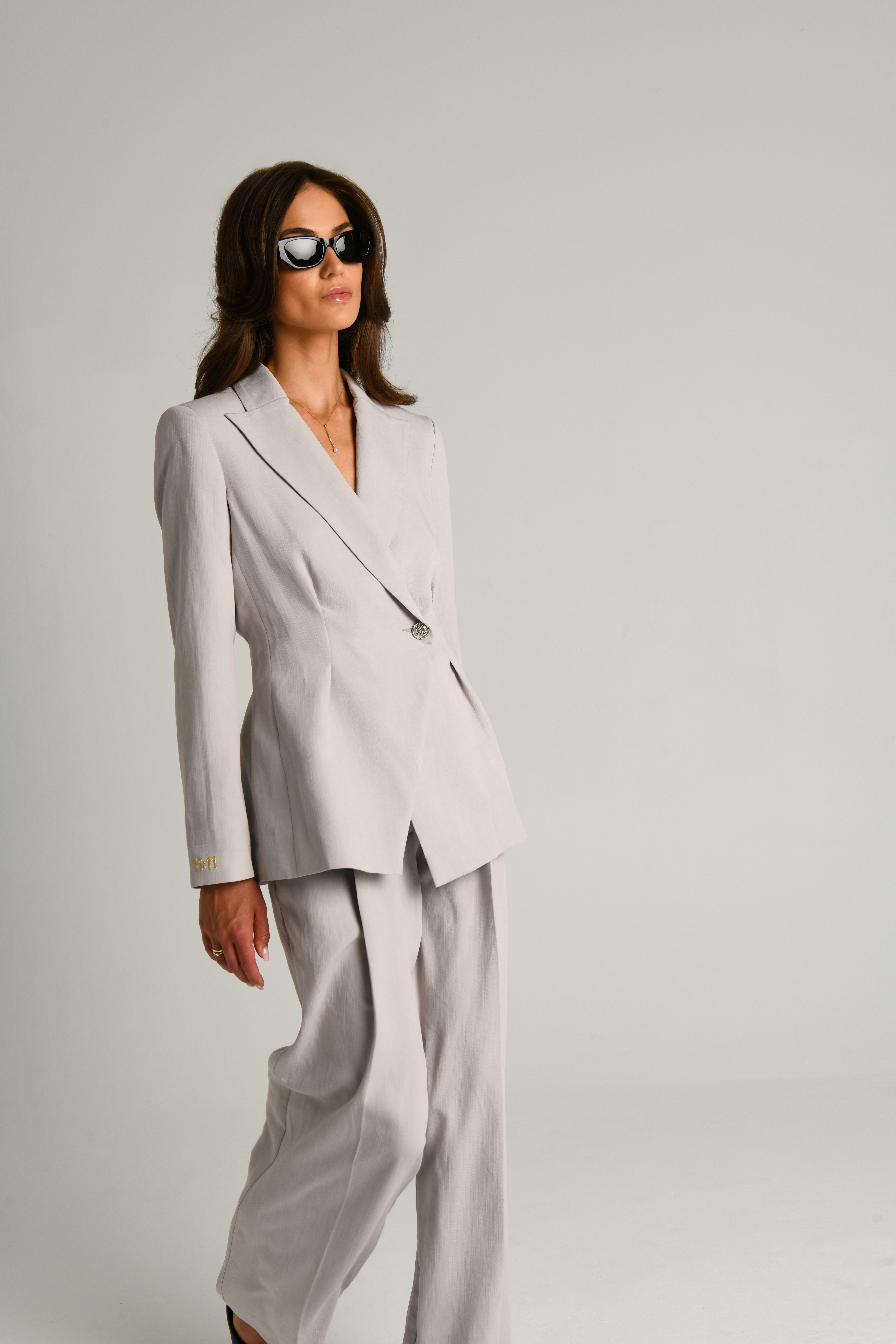 Этот элегантный костюм состоит из брюк и пиджака, выполненных в нежных серых и персиковых оттенках. Благодаря оригинальной вышивке 11:11 на правом рукаве пиджака, он станет ярким акцентом вашего образа и подчеркнет вашу индивидуальность.