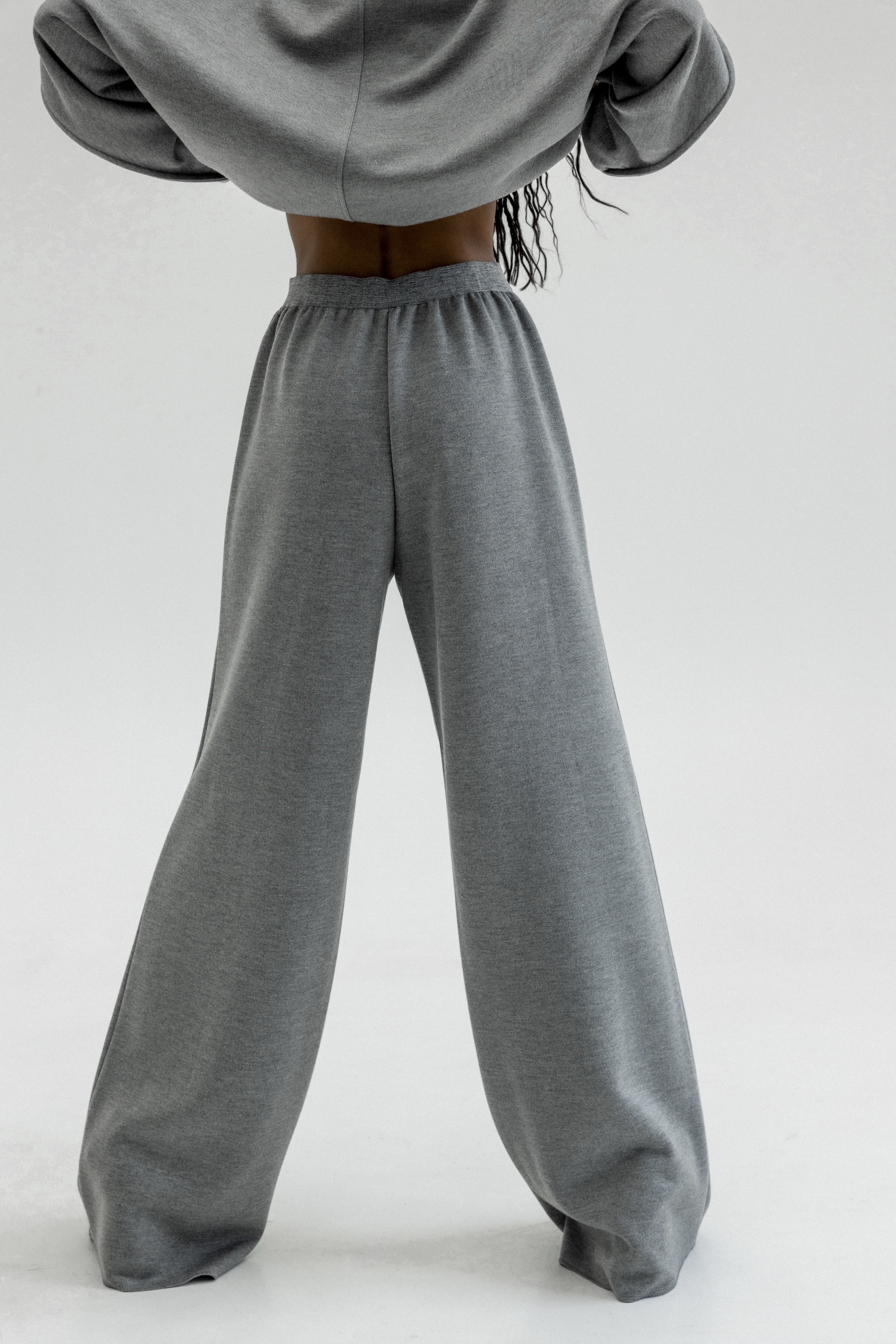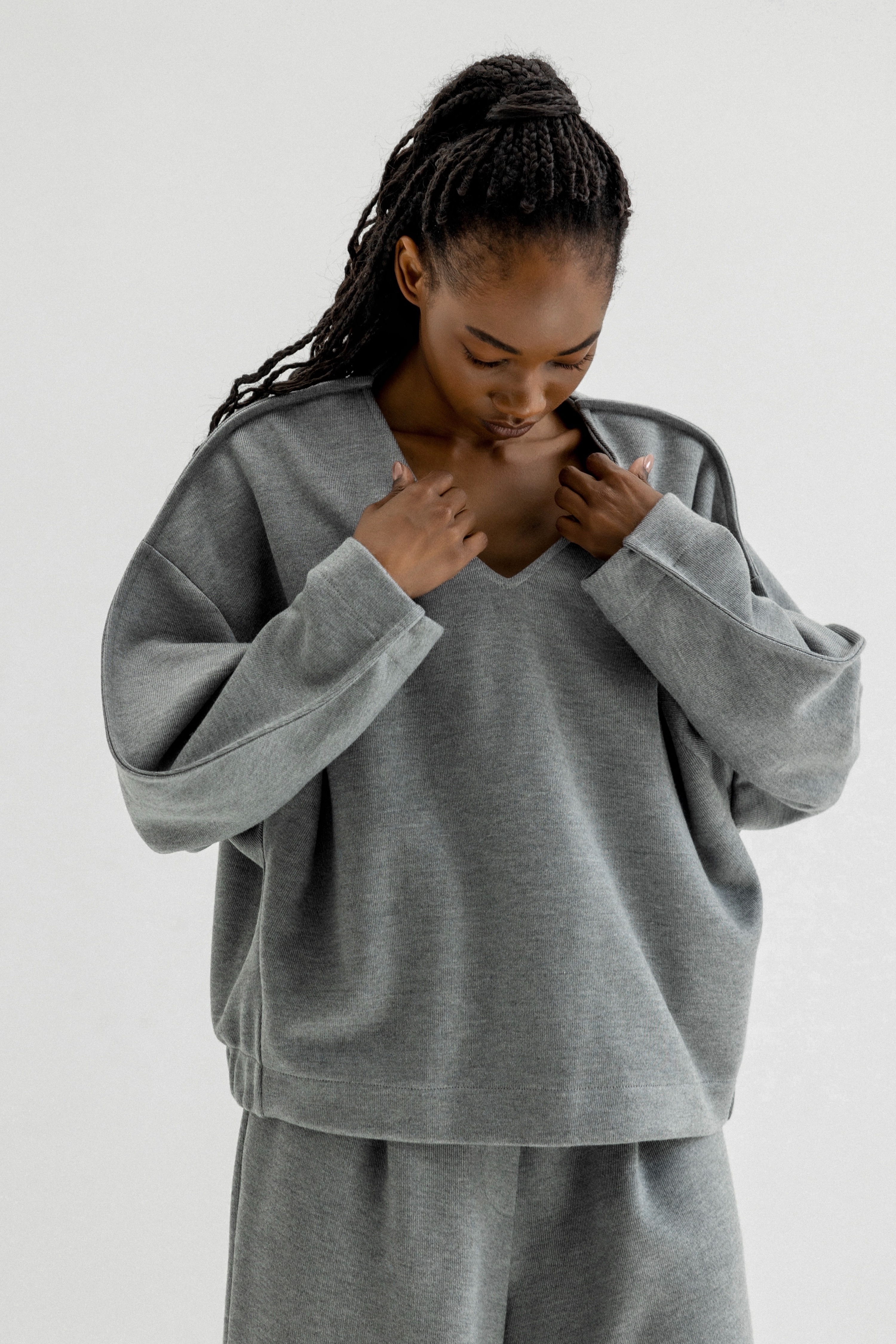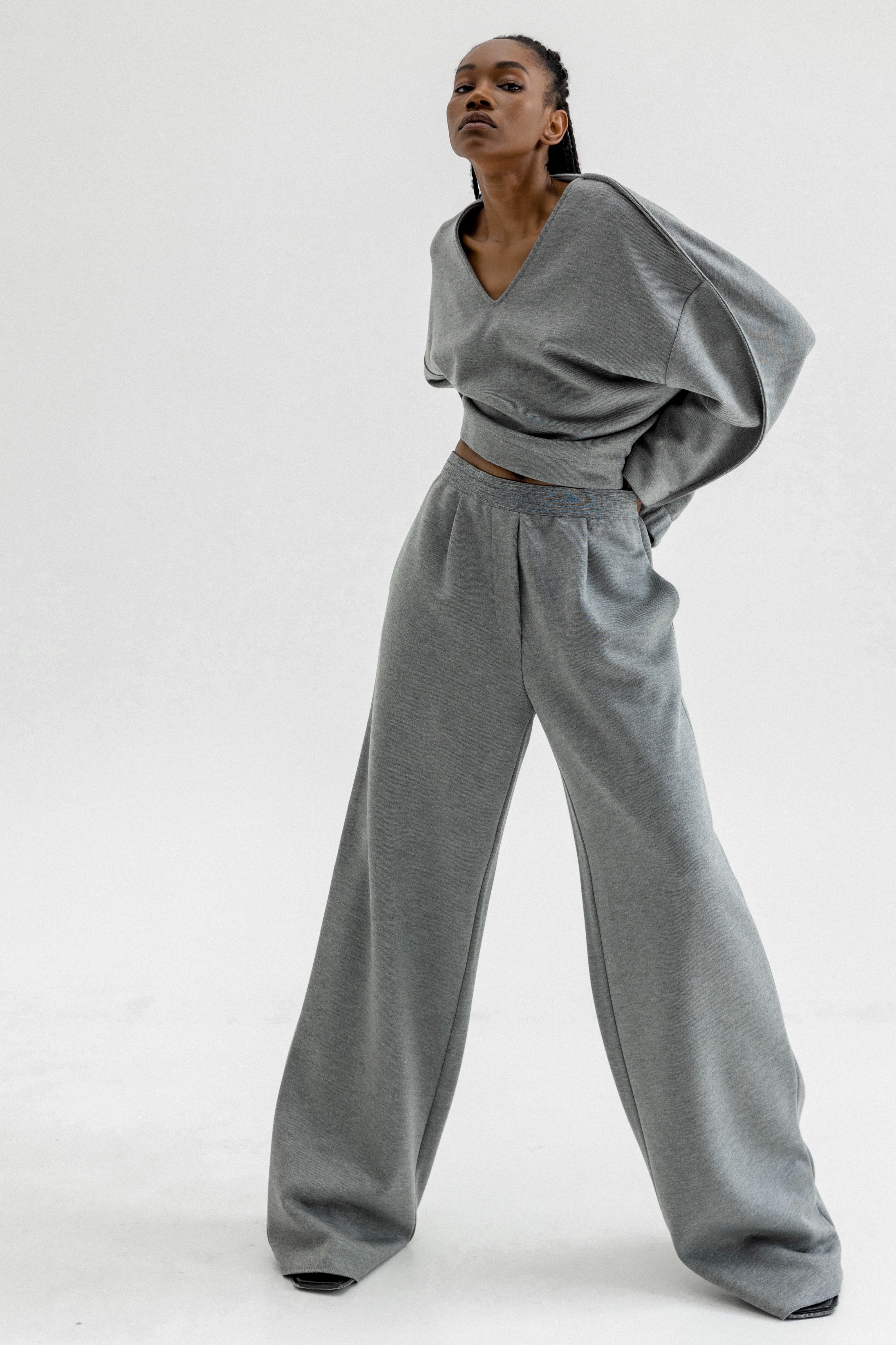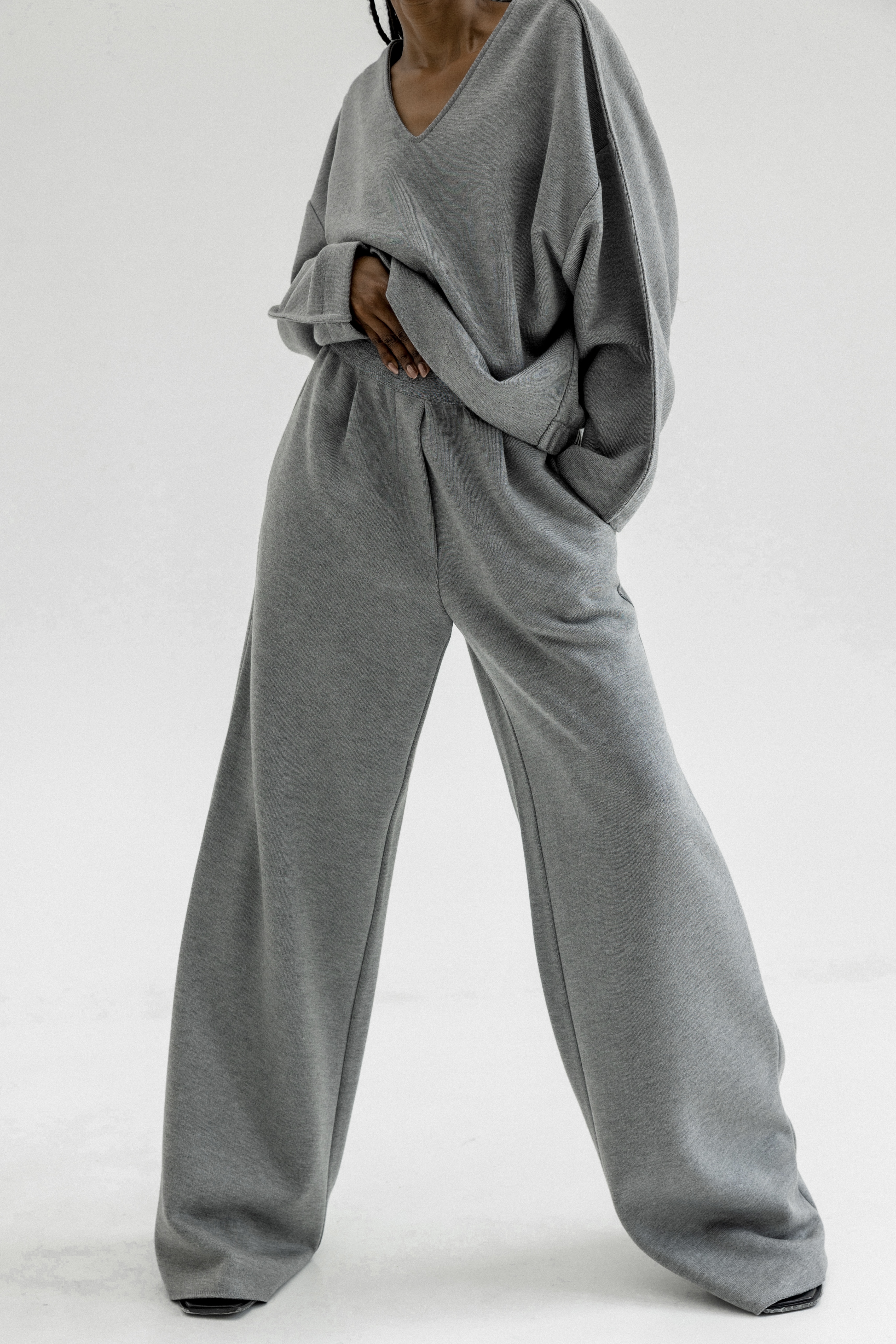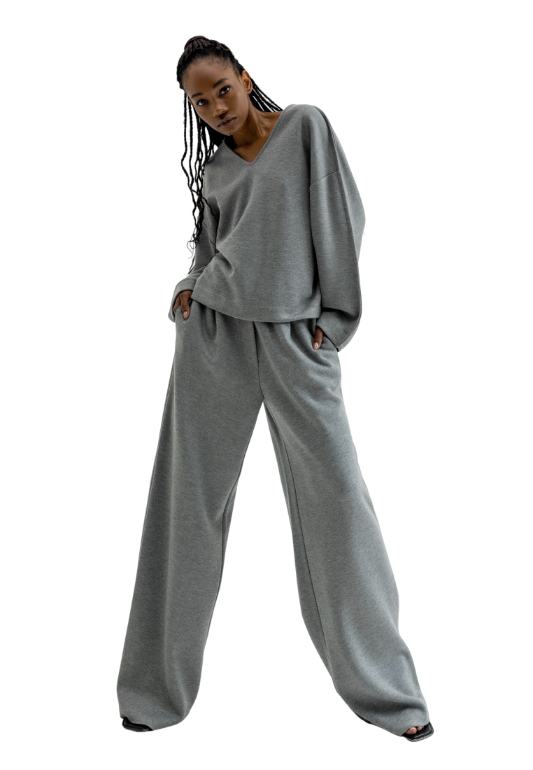Объемный свитшот с V-образным вырезом свободного силуэта, придающий образу расслабленность и комфорт. Широкие брюки с карманами и высокой посадкой на резинке создают ощущение комфорта и непринужденности. Костюм выполнен из мягкой плотной ткани вязаной фактуры глубокого серого цвета. Образ выглядит минималистично, стильно и уверенно. Идеально подходит для повседневной жизни или уютного отдыха. Носим на плоский ход или на каблук.
