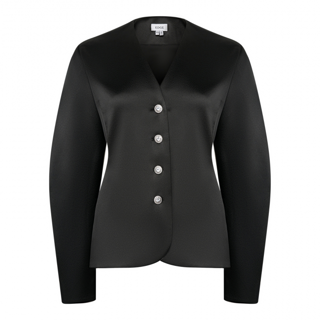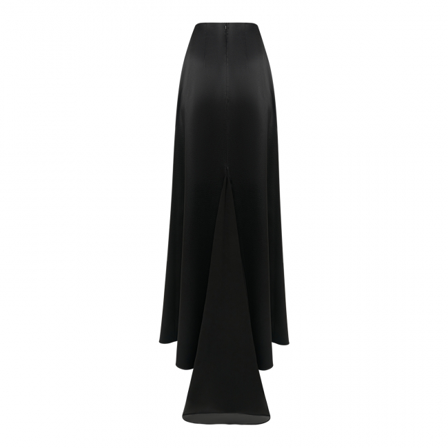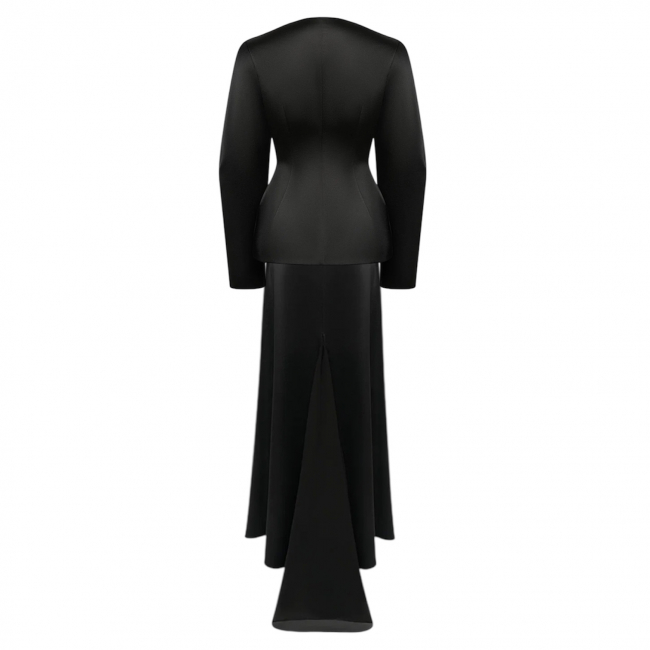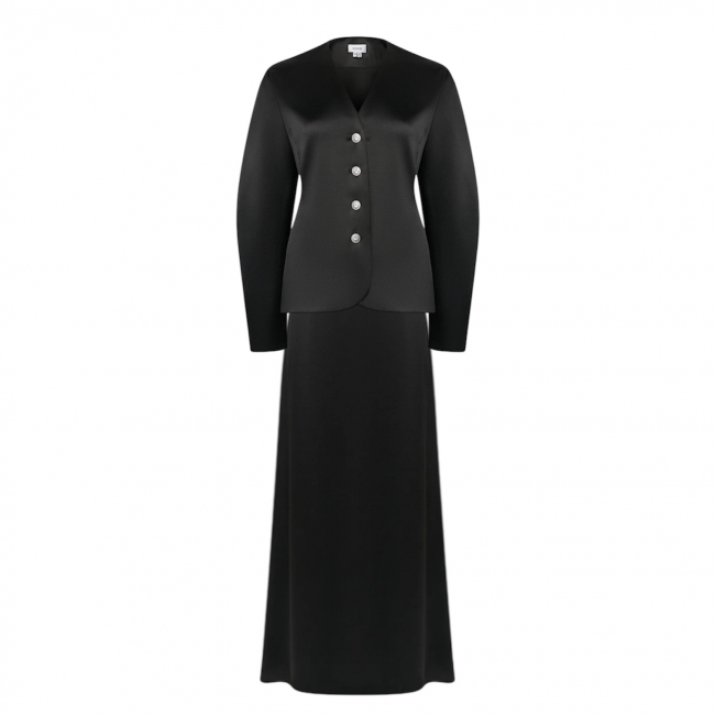 Роскошный костюм ДИВА из атласной вискозы из жакета с пуговицами с горным хрусталем и юбки с полупрозрачным шлейфом.