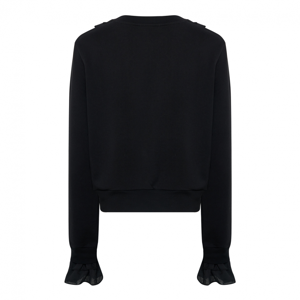 Очаровательный свитшот из хлопкового футера, украшен женственными оборочками из батиста по вороту и обшлагам рукавов. Внутри комфортный, мягкий, в меру теплый, без начеса. Свободные брюки из хлопкового футера, с поясом на резинке, с боковыми карманами, дополнены регулирующим шнурком и металлической фурнитурой золотого цвета. Комфортные, составят достойный образ в расслабленном стиле со свитшотом, футболкой или рубашкой.