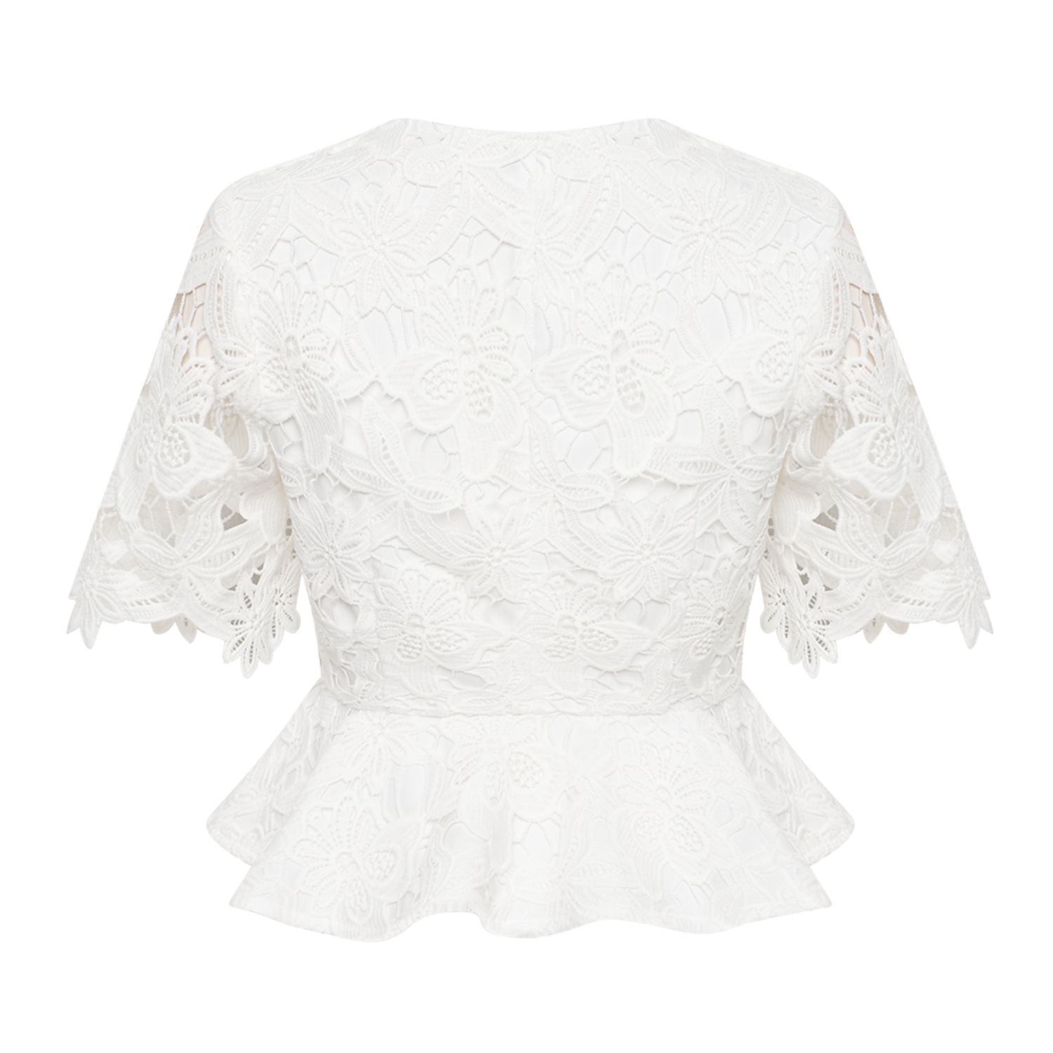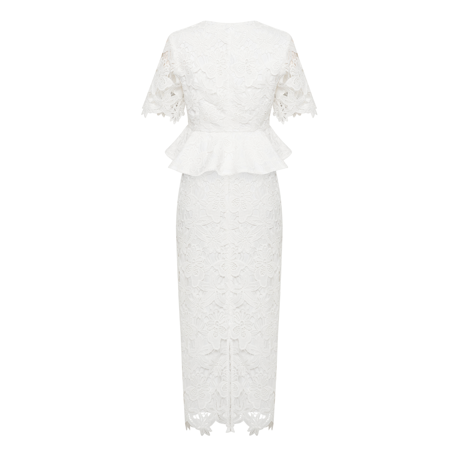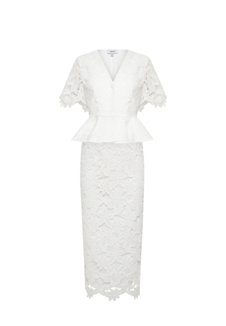 Ослепительный кружевной костюм Лилиана добавит торжественности вашему летнему дню. Элегантный и изысканный, и в то же время удобный, будет уместен и на деловом завтраке, и на романтическом свидании. Состоит из юбки миди и блузки с баской.