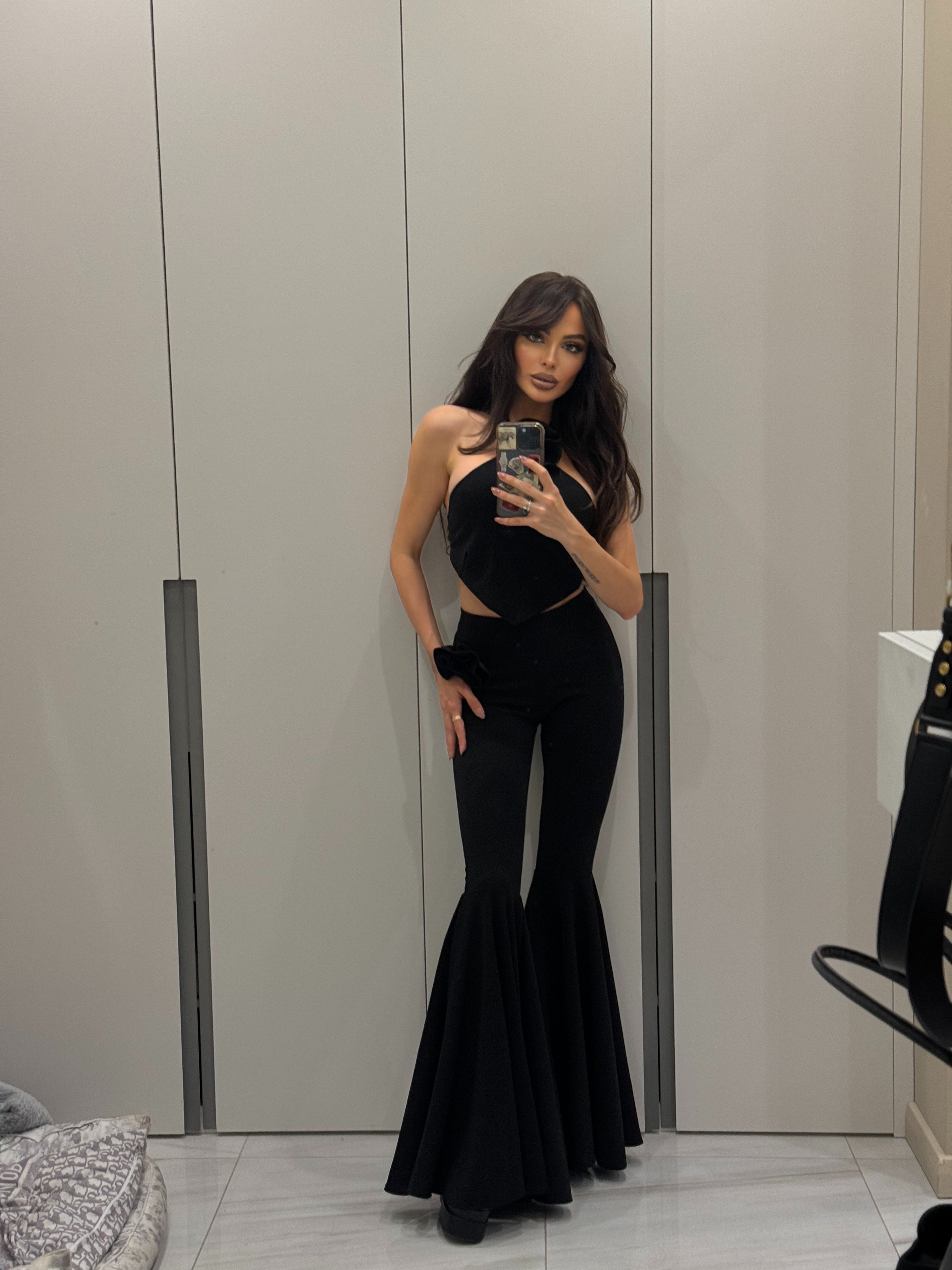 Костюм украшен декоративными цветами, добавляя ему особенный шарм и изысканность. Застежка в виде завязок добавляет уникальности и легкости в надевании. Модель клеш брюк обеспечивает комфорт и поддержку, делая костюм более универсальным и подходящим для различных случаев использования, включая повседневную моду, вечерние мероприятия и свадьбы.