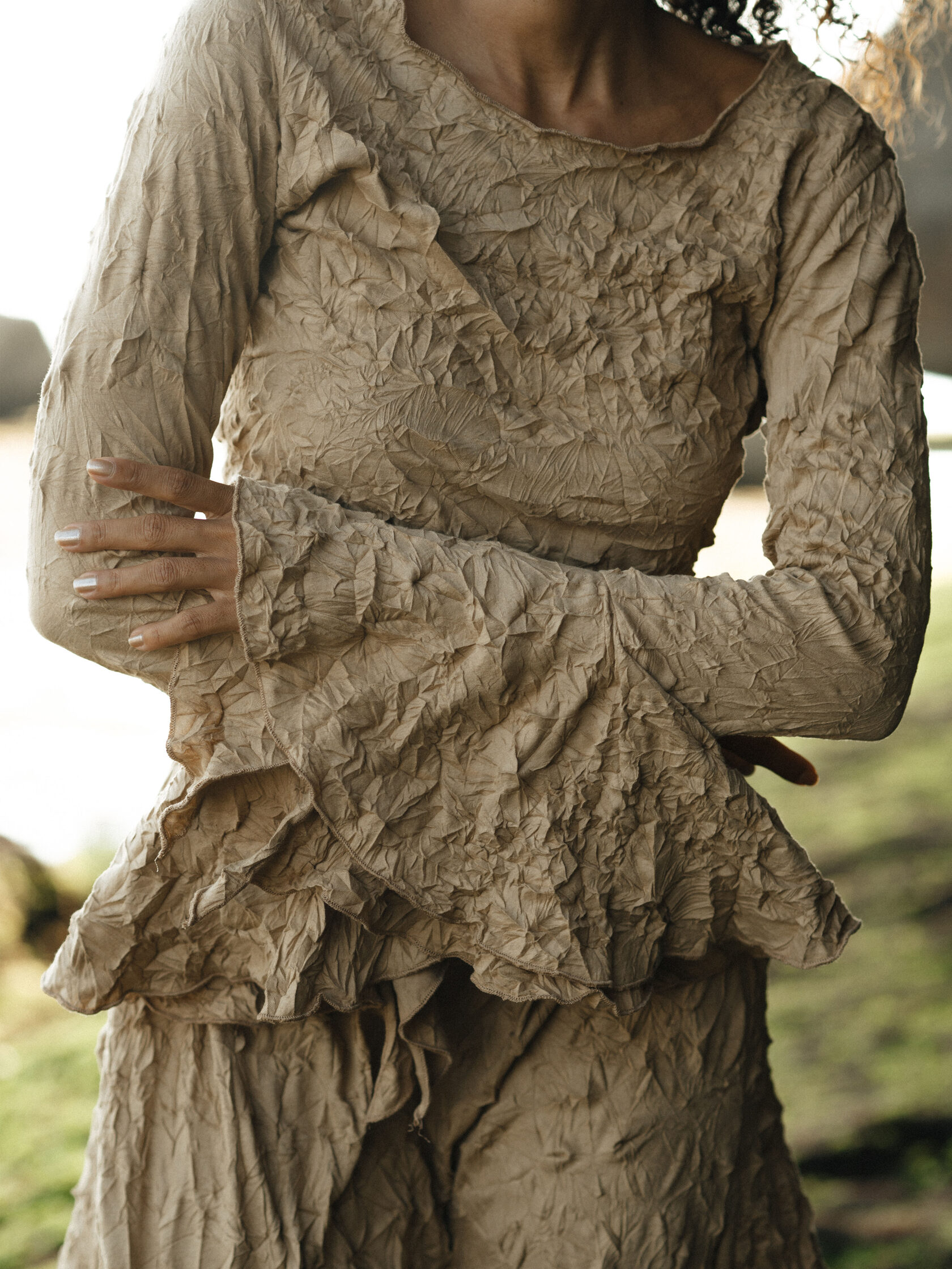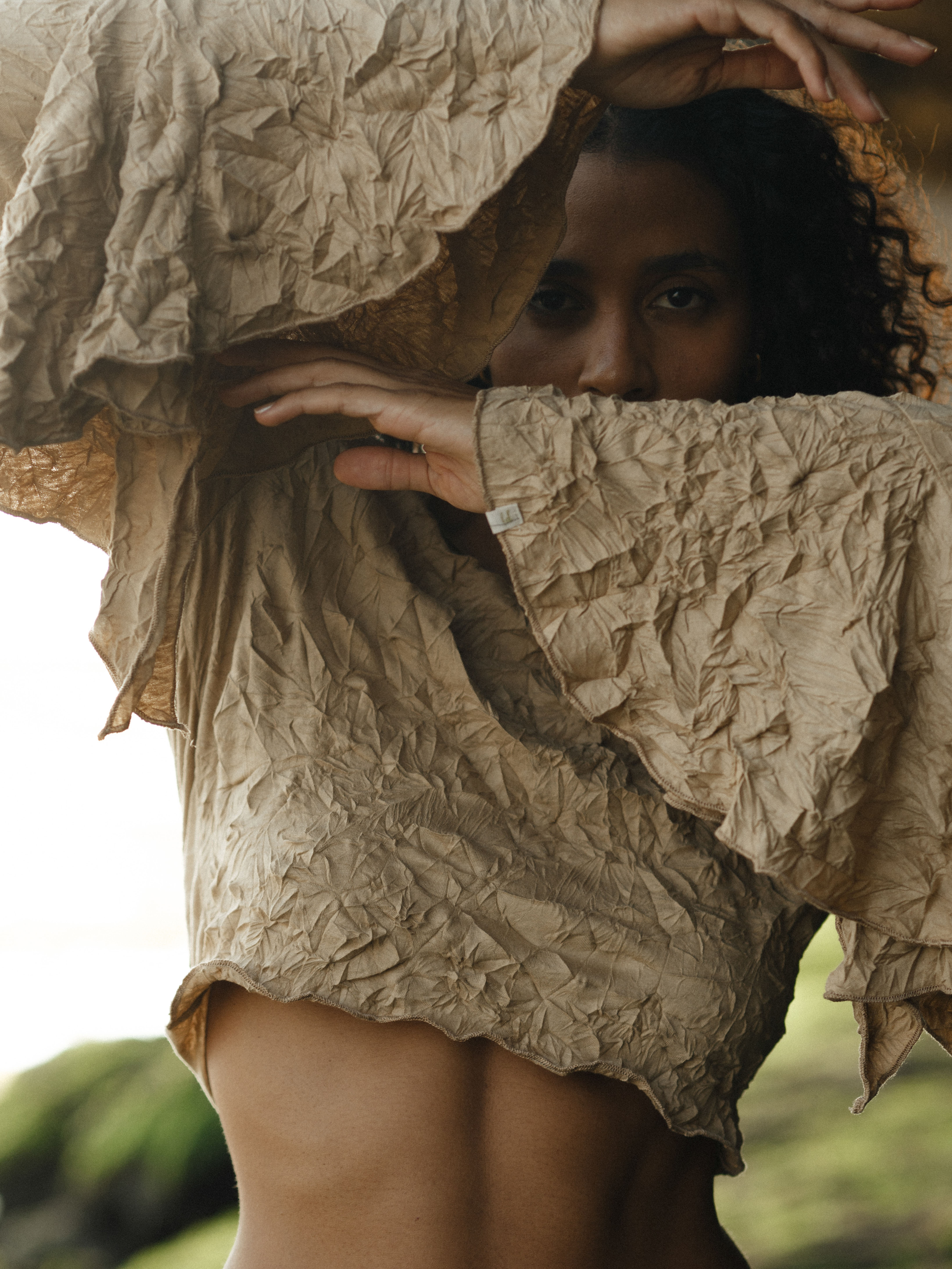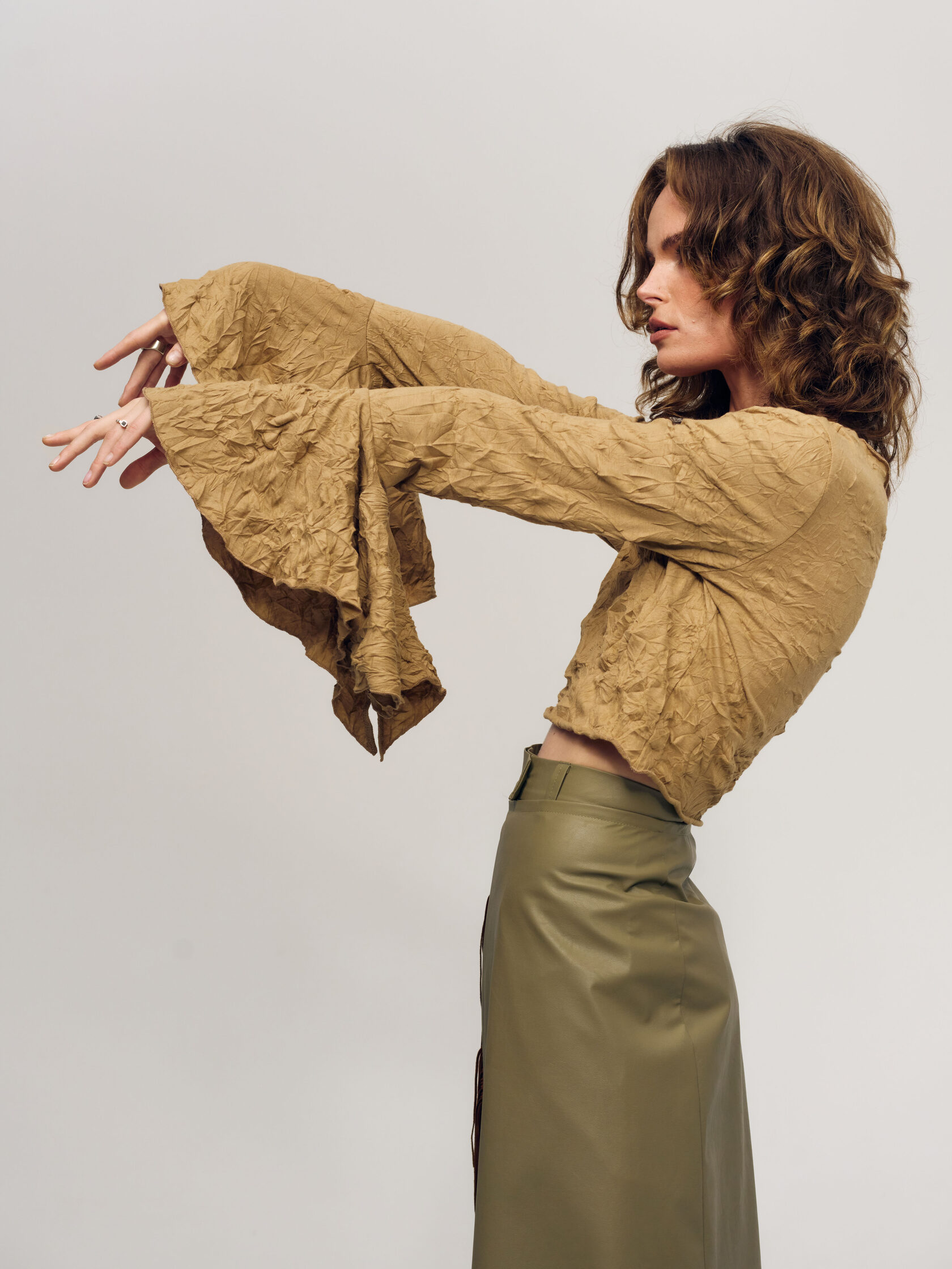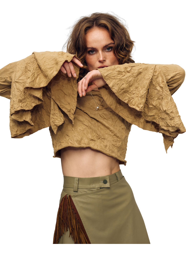 Укороченный лонгслив приталенного силуэта и узкими рукавами с расширяющимися к низу манжетами в форме солнца. Необычный лонгслив сделает любой повседневный образ особенным.
