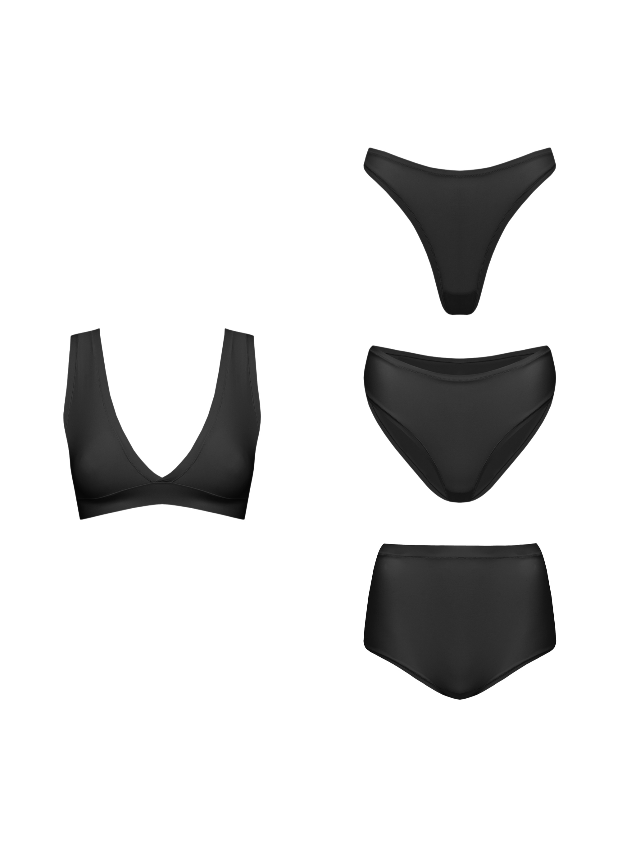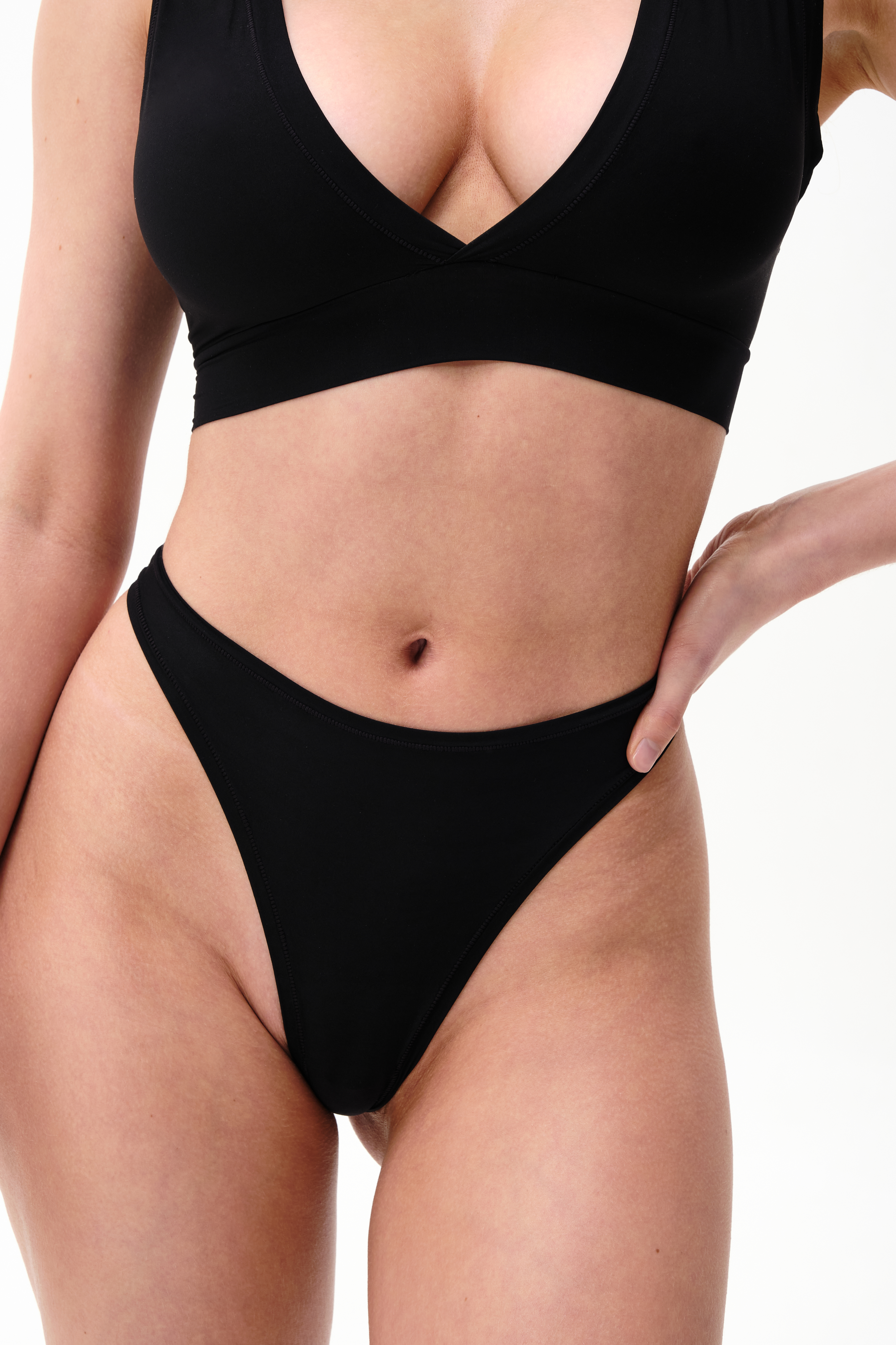 Классический, элегантный чёрный цвет. Необычный крой коллекции делает её ярким акцентом в любом образе. Лёгкая вискоза комфортна и удобна в носке. Трусики string на бретелях выгодно подчёркивают ваши достоинства.